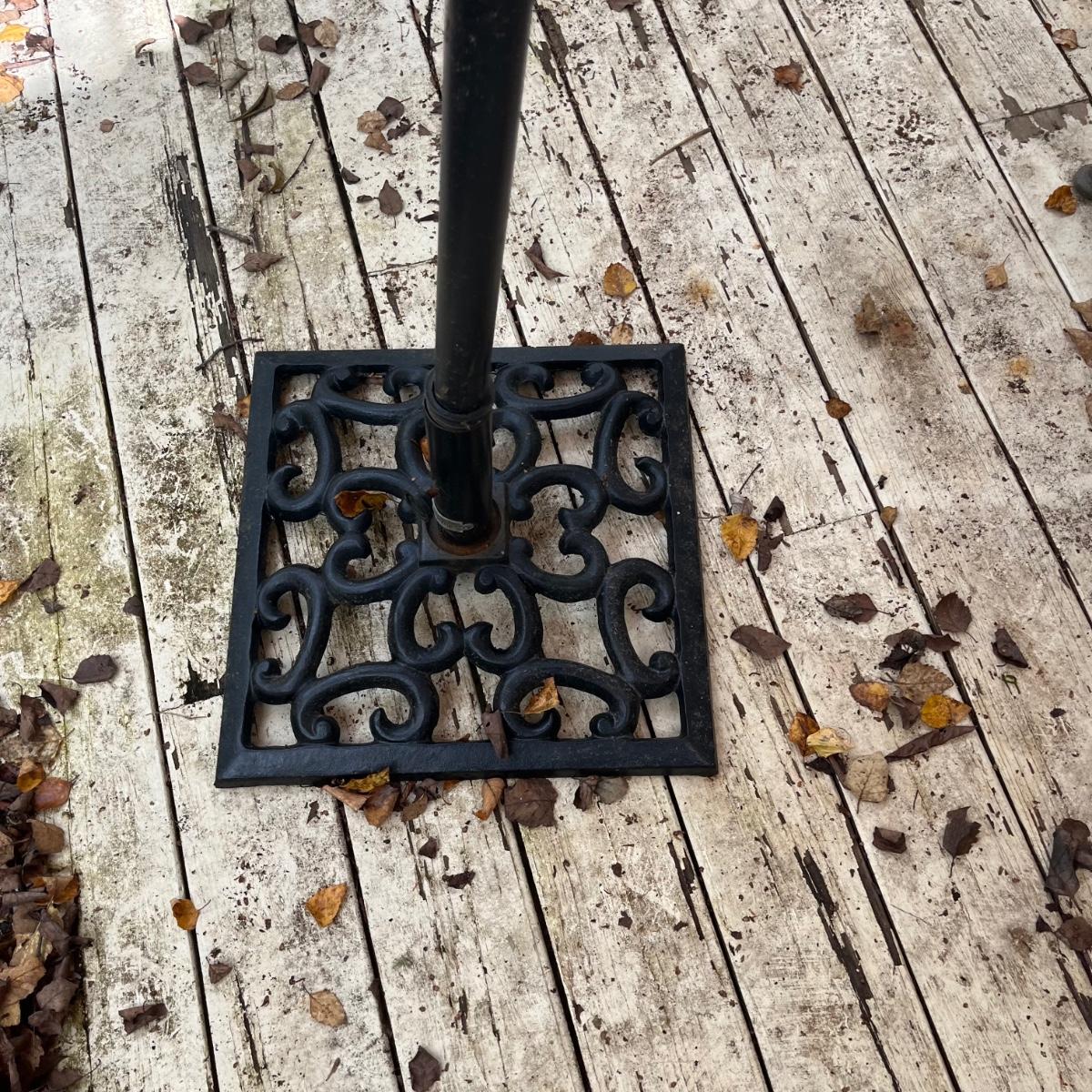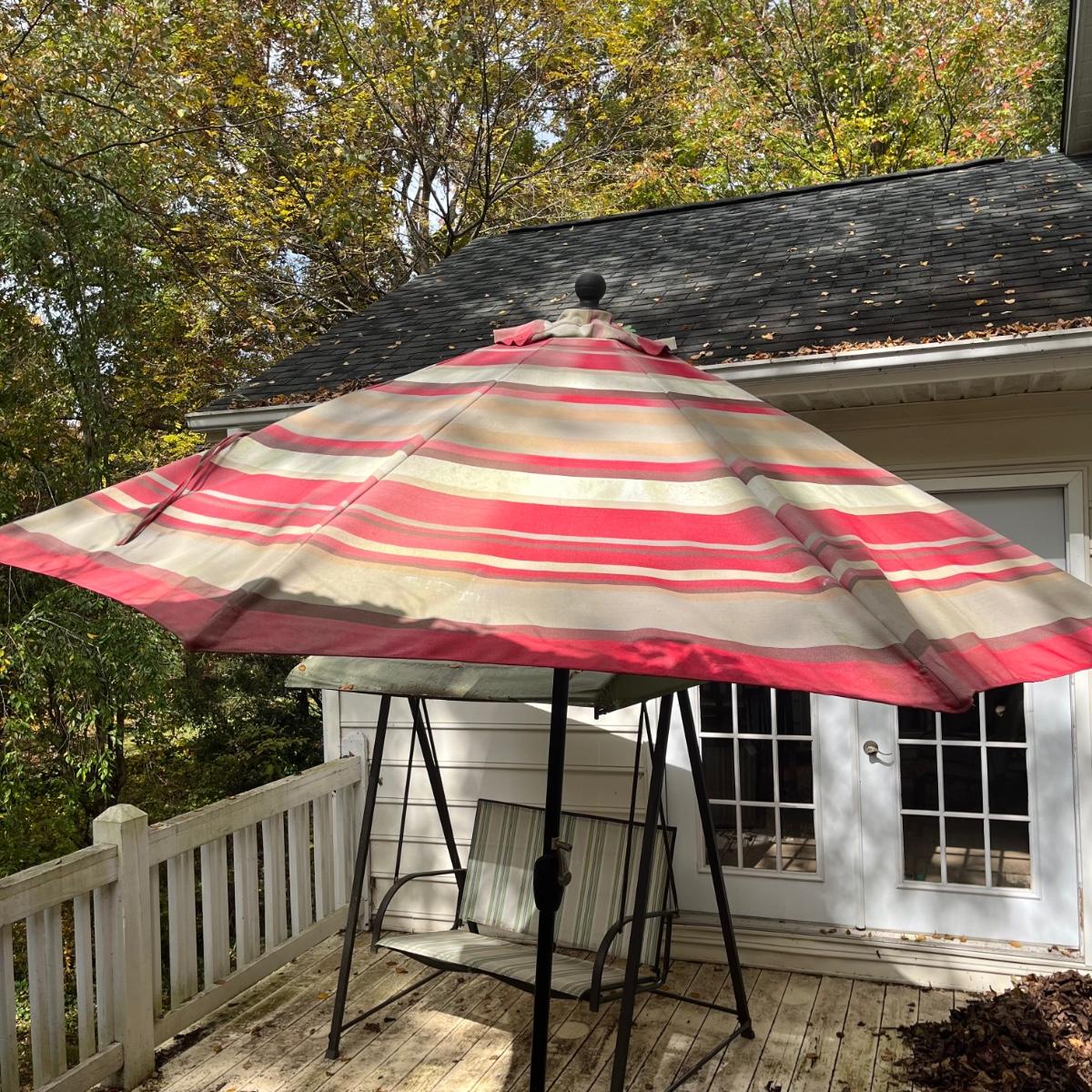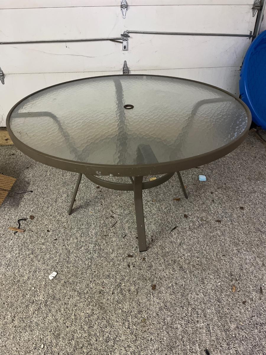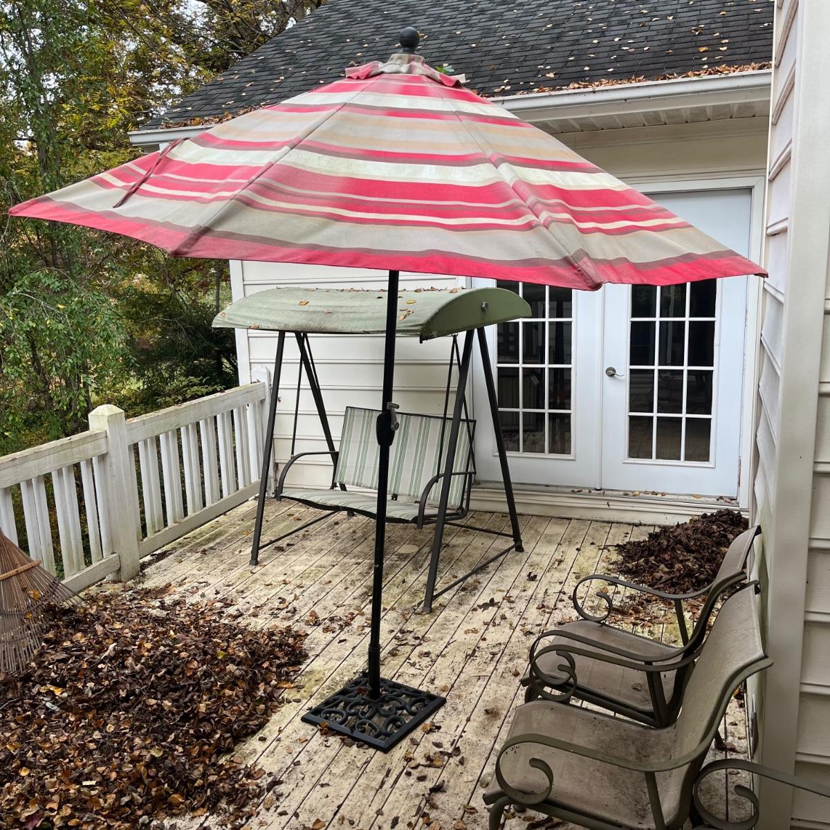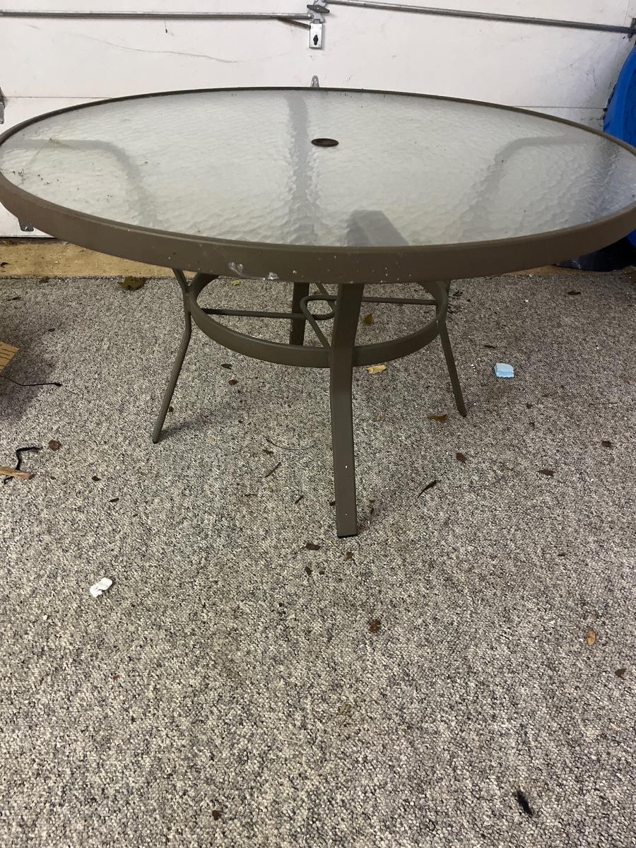 Lot includes two metal framed chairs, two metal framed swivel chairs 92”D Umbrella with iron stand and table with glass top that measures 48”D x 28” tall.