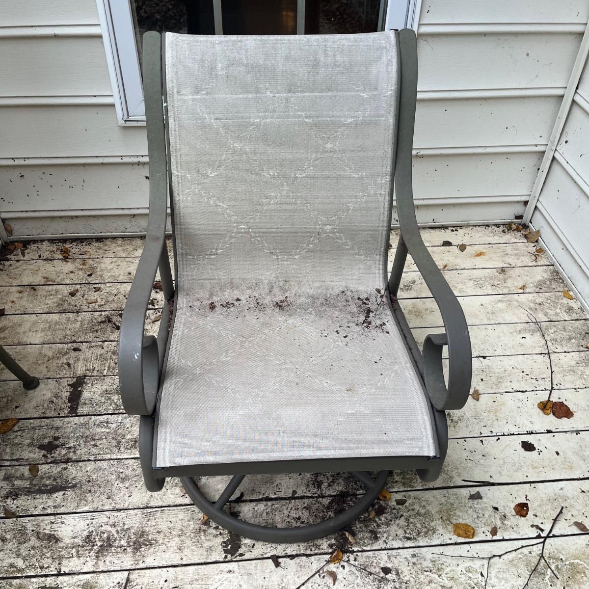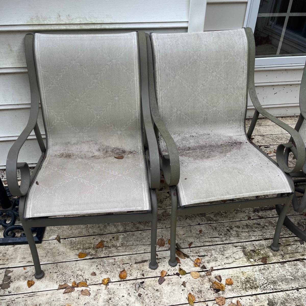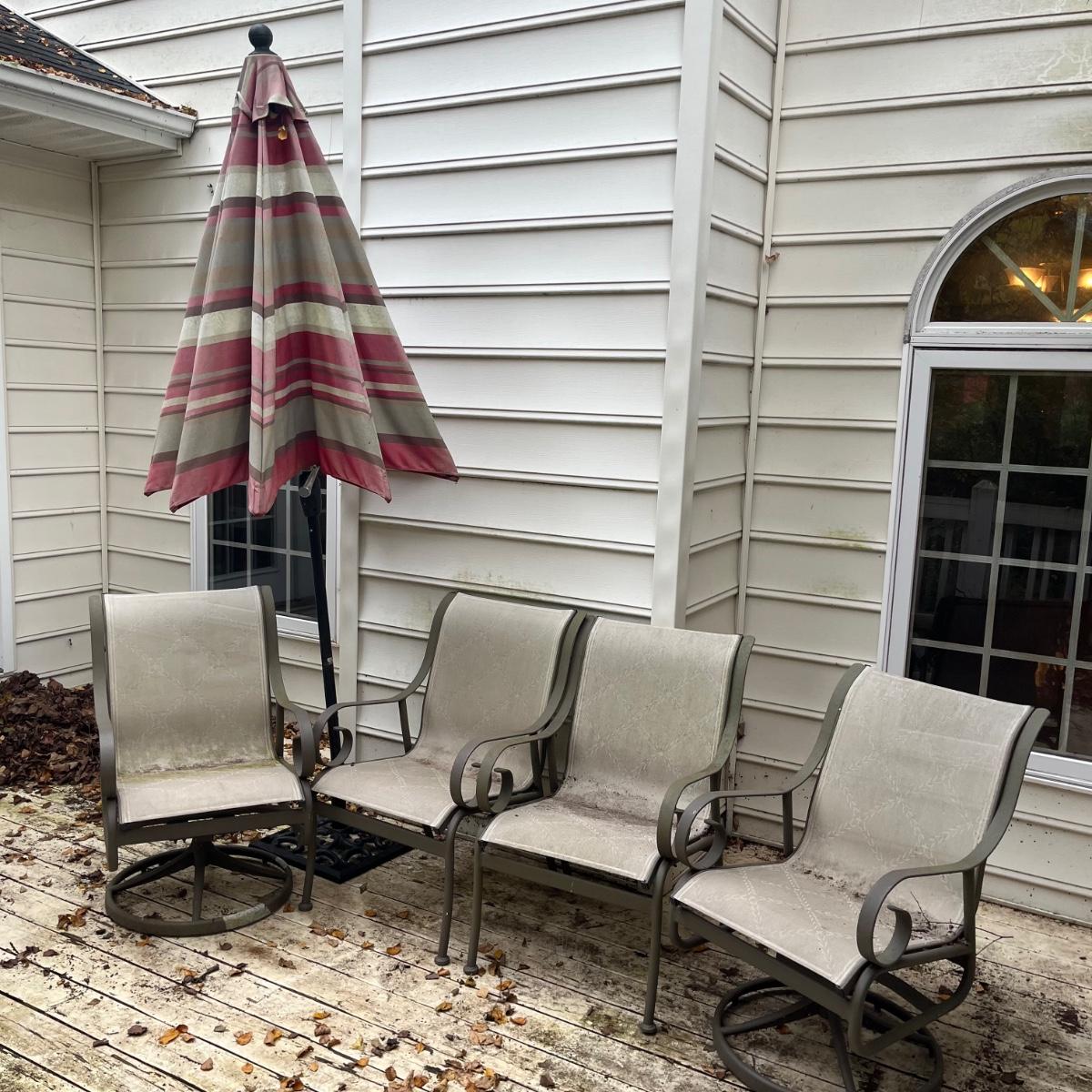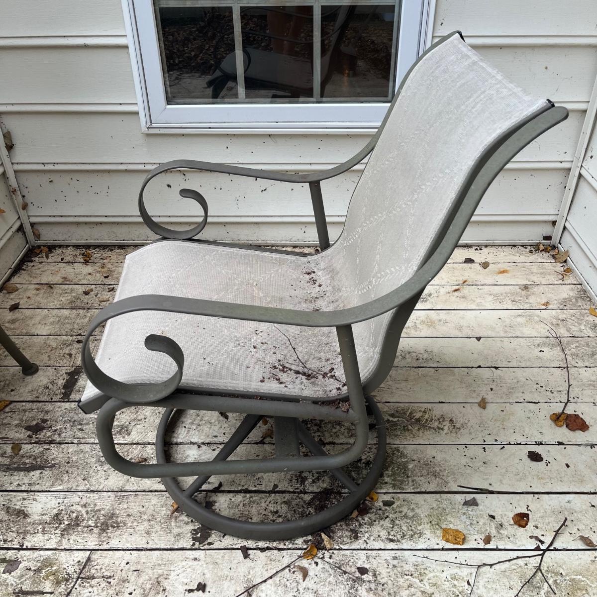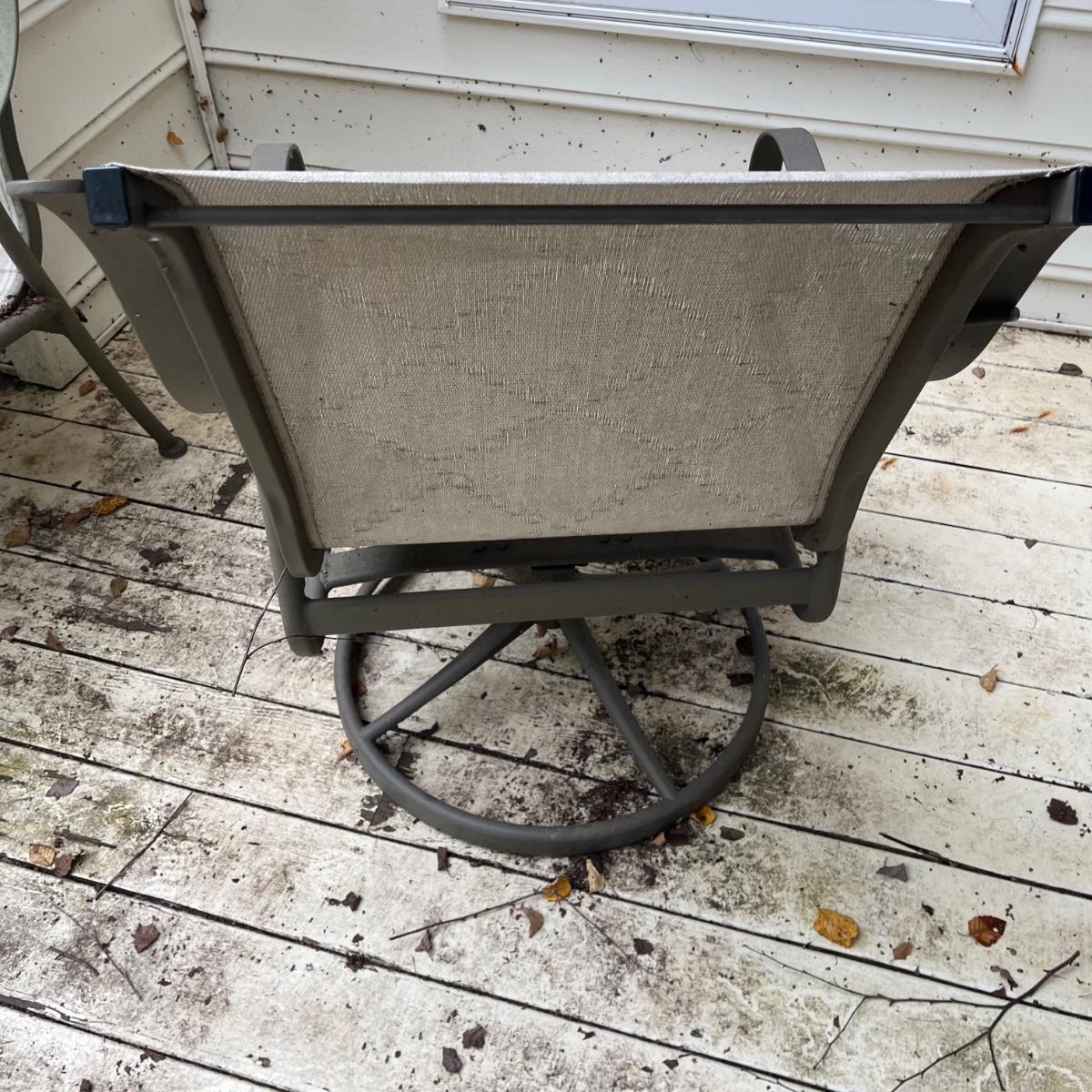 Swivel chairs measure 23” x 29” x 36” with a seat height of 18”. All items need cleaning as they have lived on a shaded deck and have mildew.