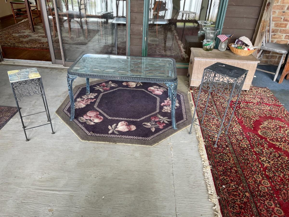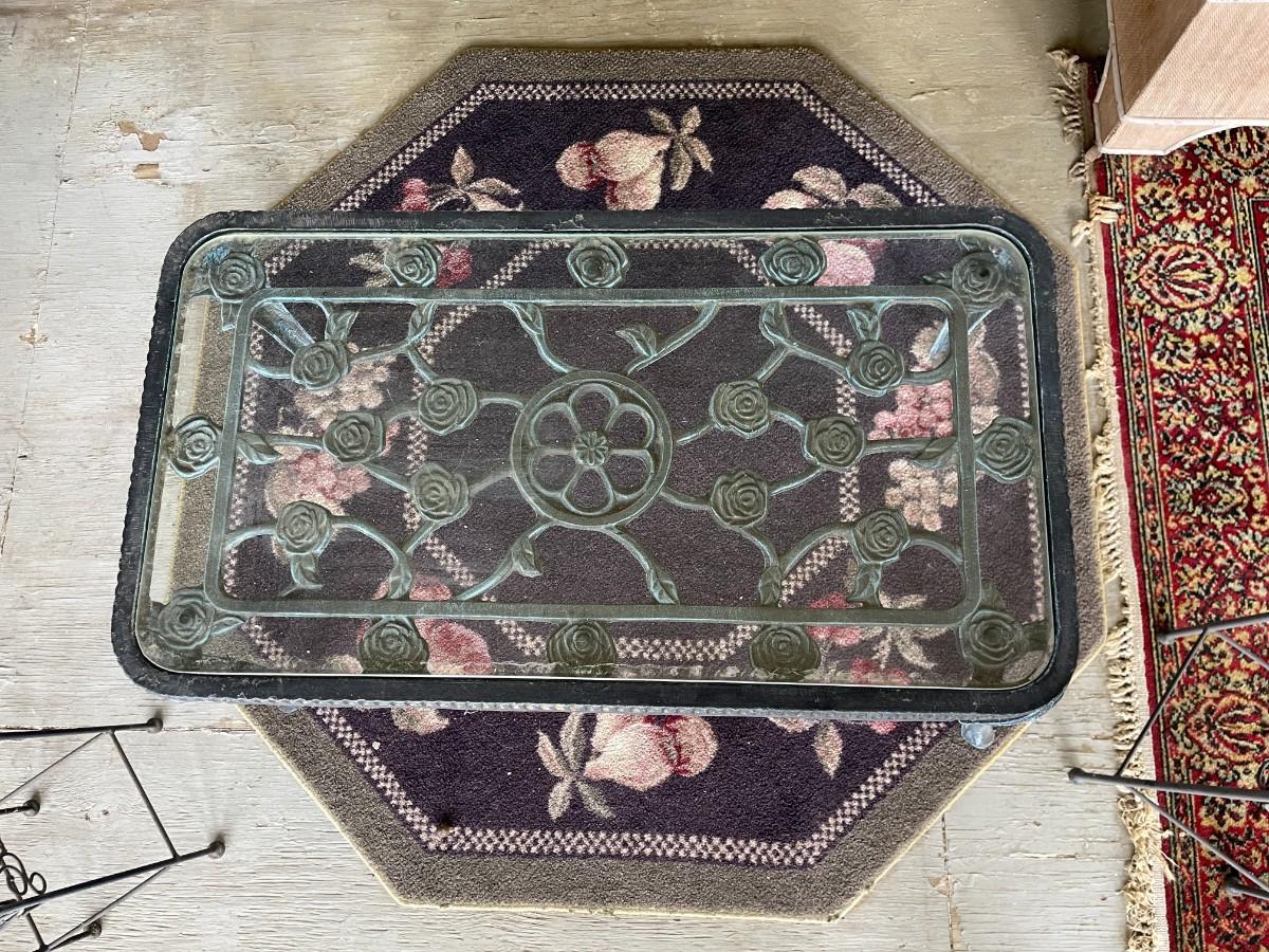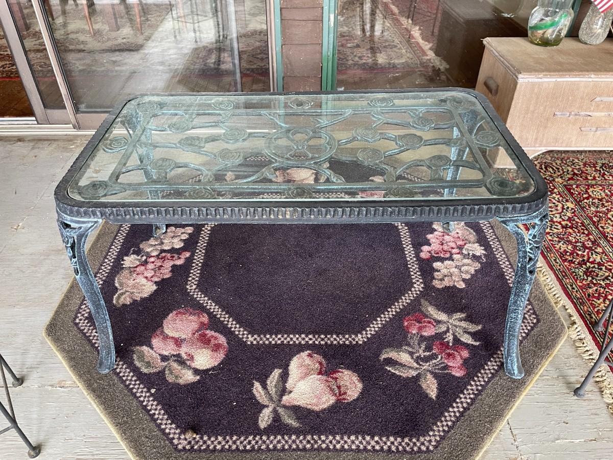 Glass and metal table and 2 metal stools. Coffee table: 36Lx 20w x 19h