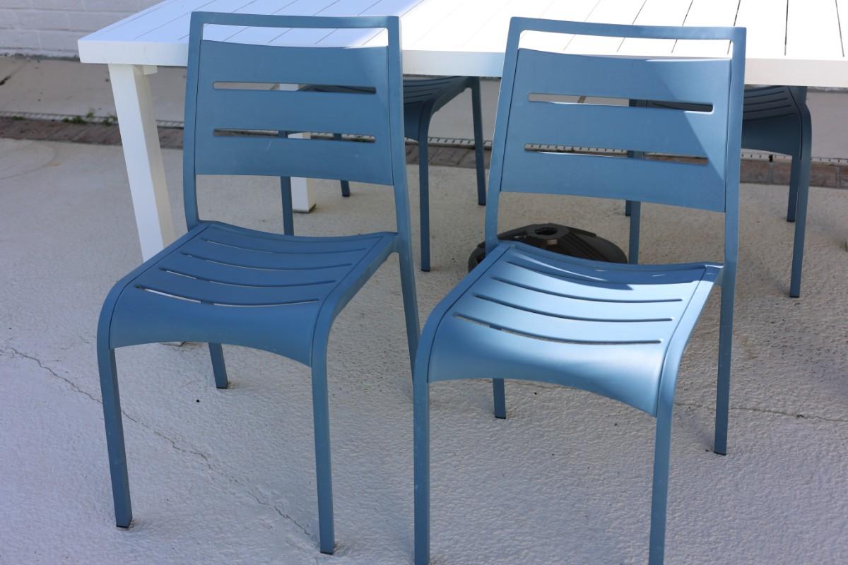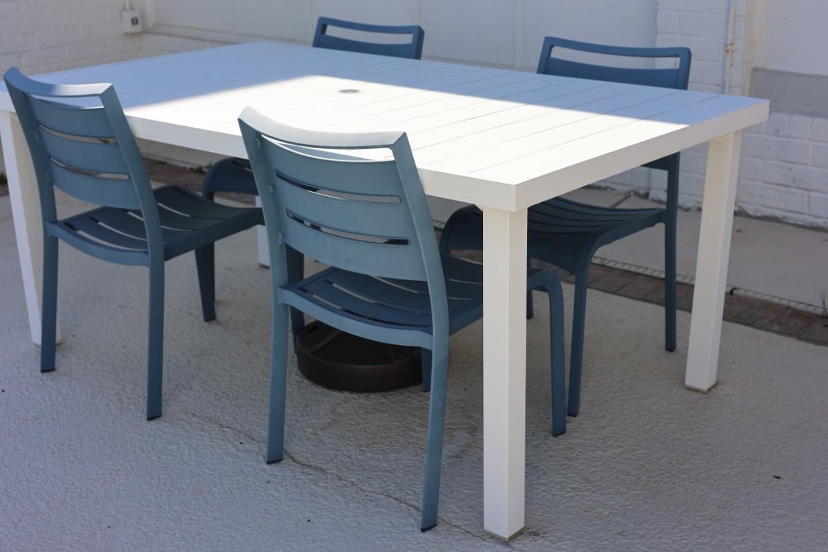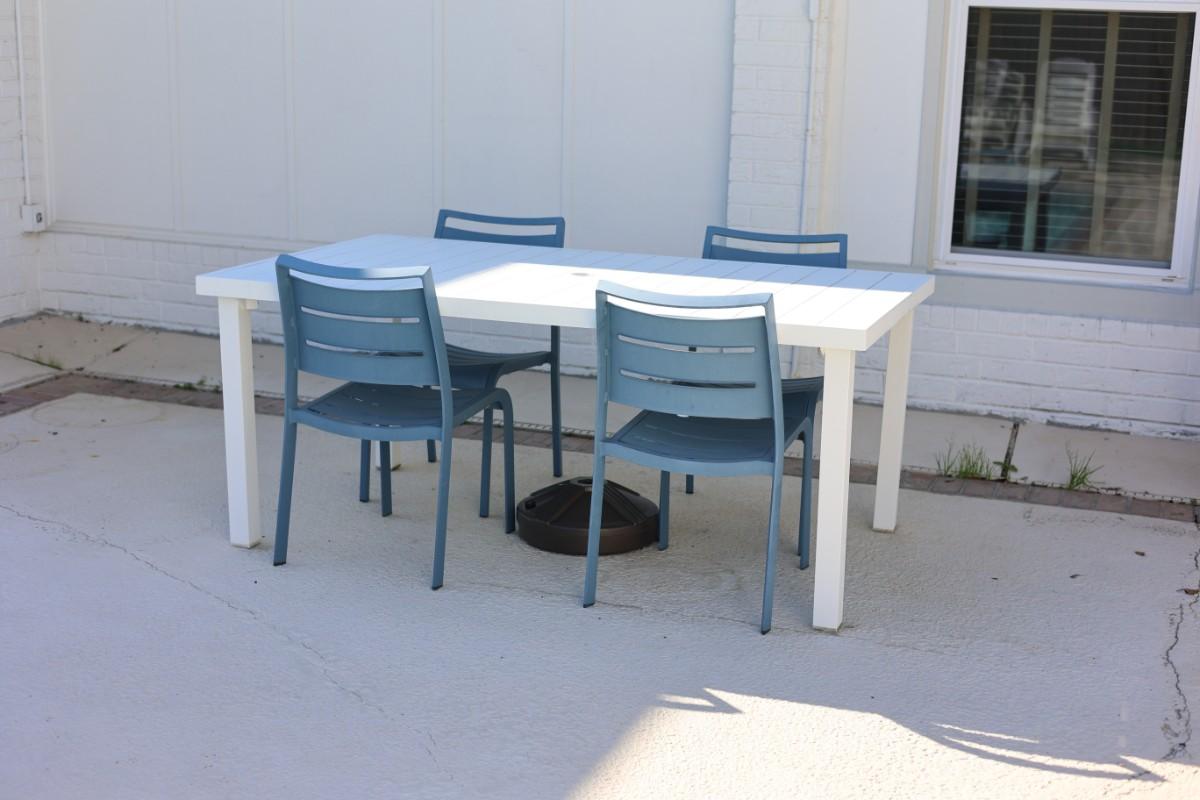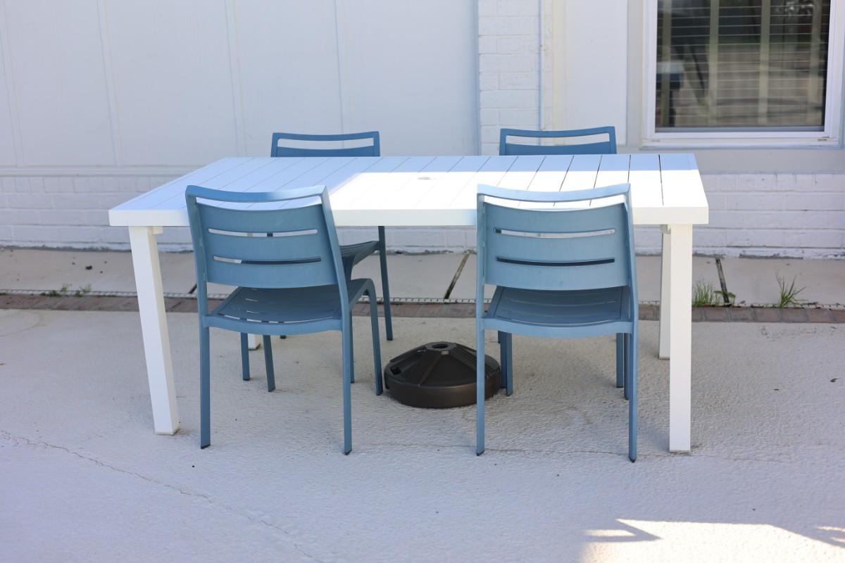 Rectangular outdoor patio dining table with four matching chairs. Finished in white (table) with blue molded chairs. Suitable for patio, porch, or outdoor entertaining.