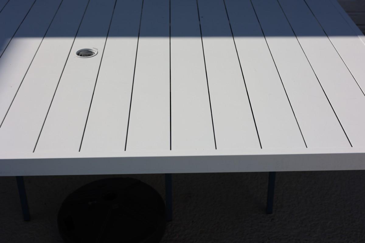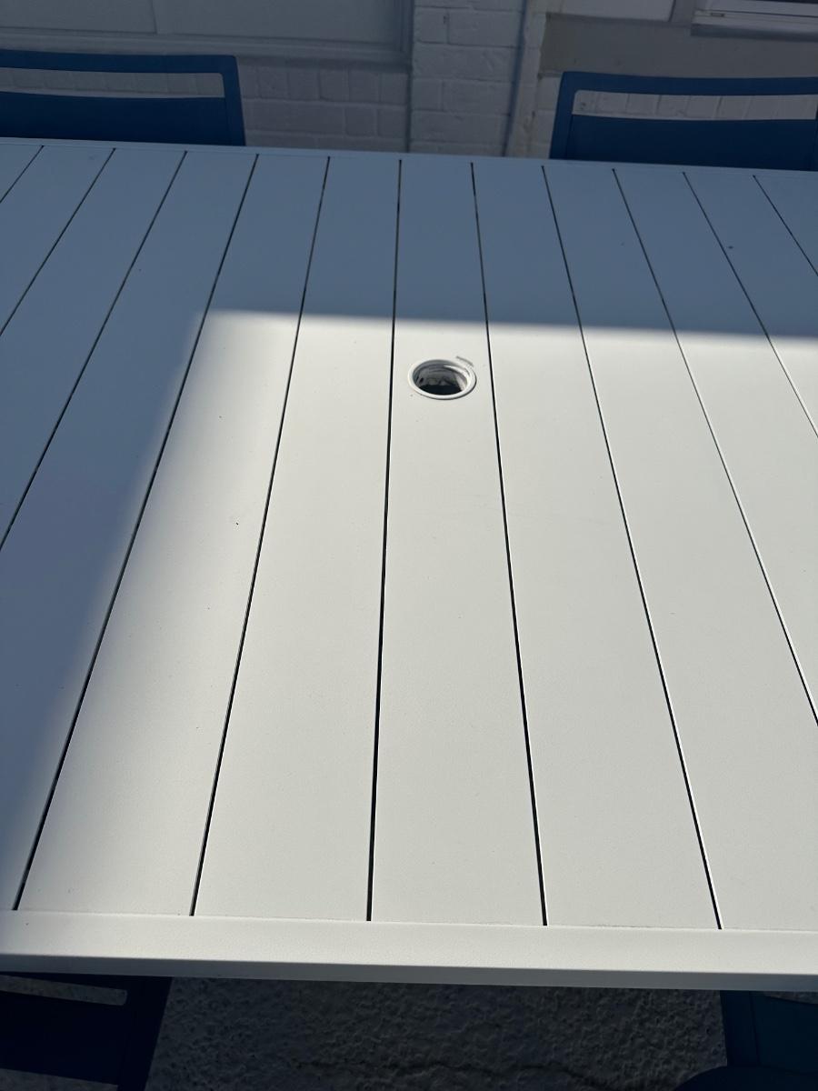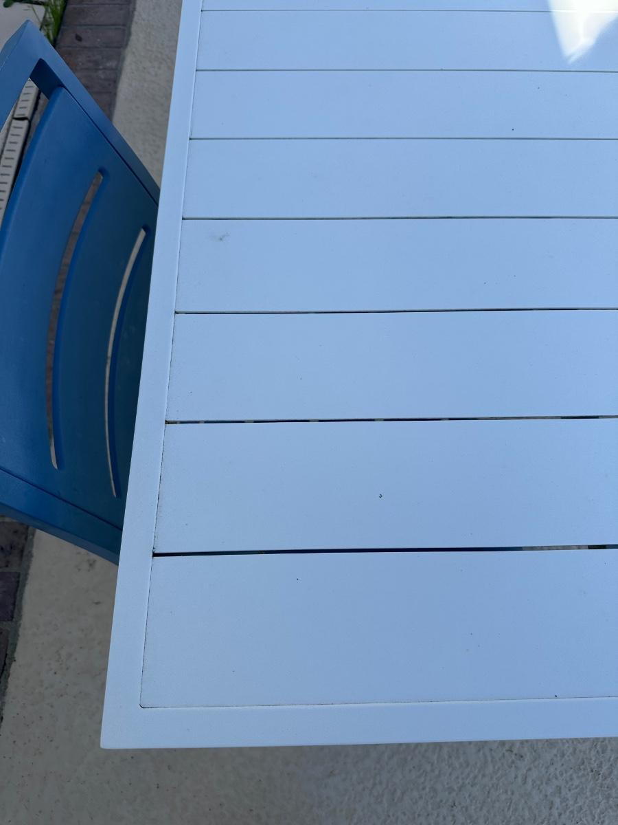 Rectangular outdoor patio dining table with four matching chairs. Finished in white (table) with blue molded chairs. Suitable for patio, porch, or outdoor entertaining.