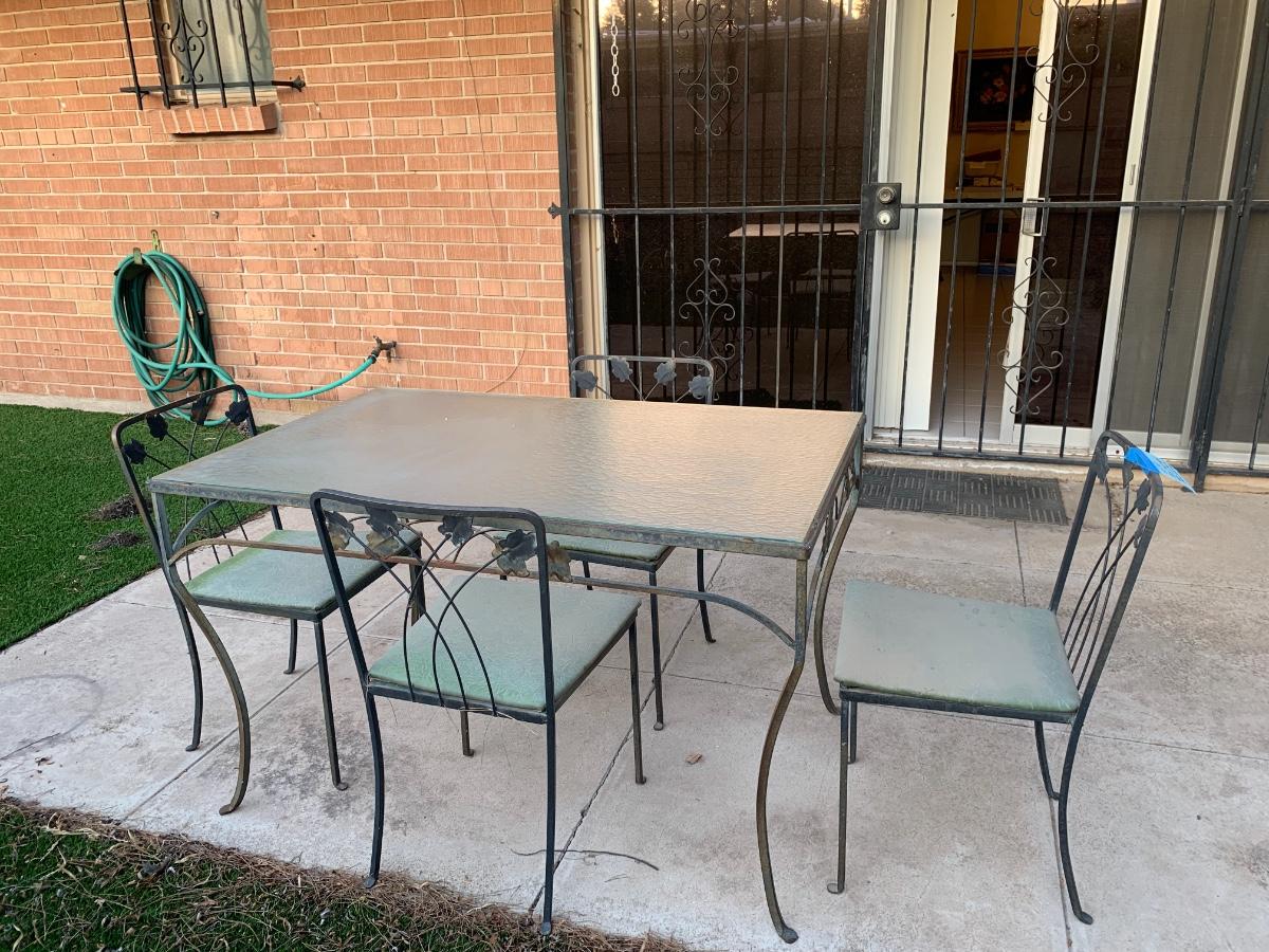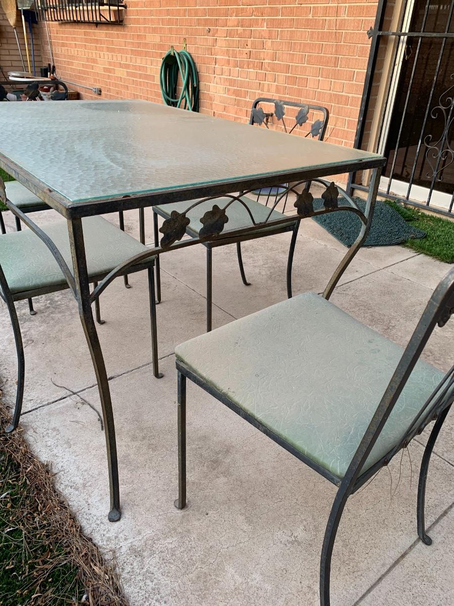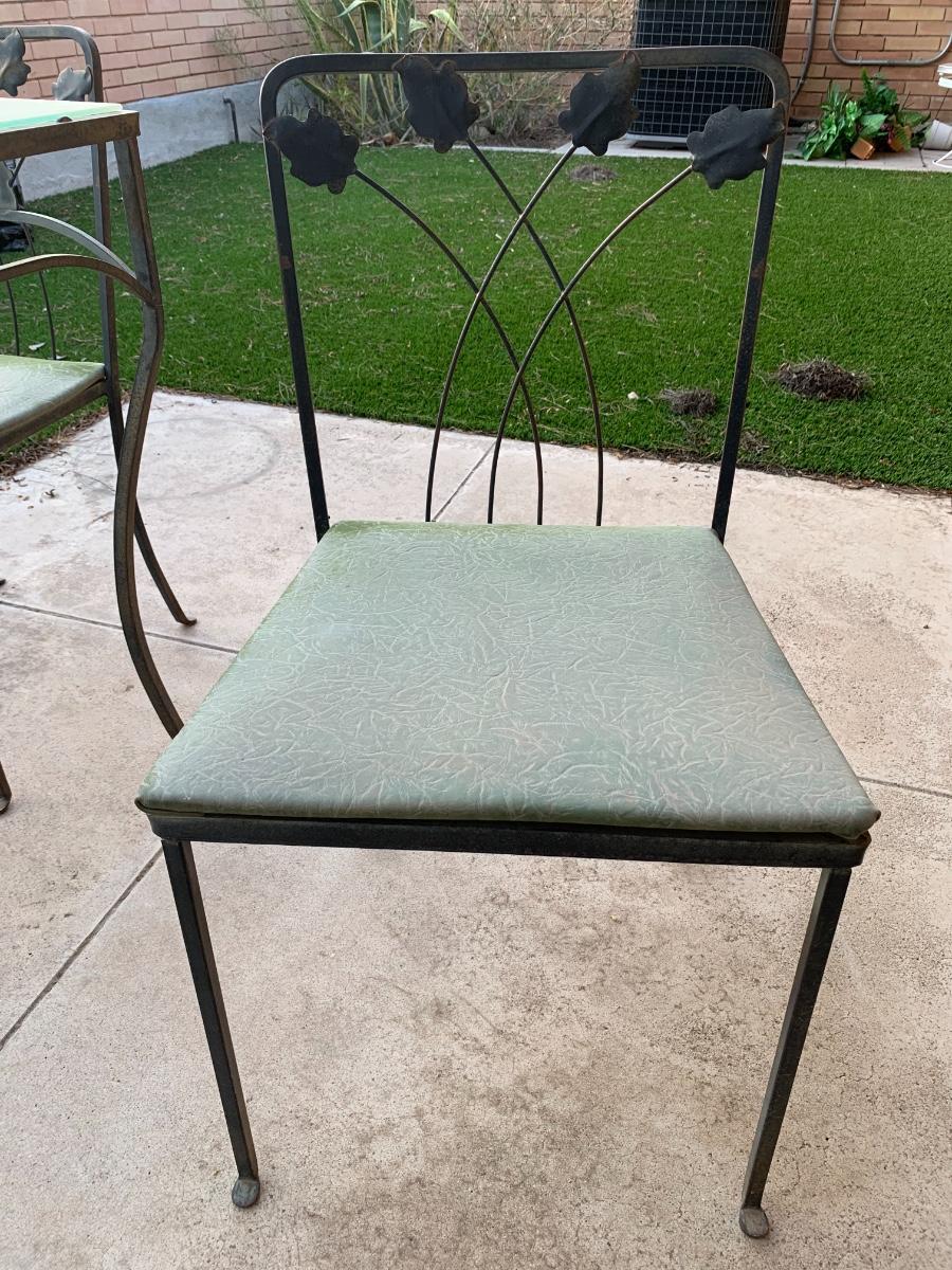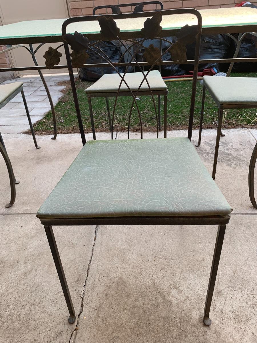 Metal table and 4 chairs with leaf design and green vinyl pads. Table has tempered glass top. Fair Condition.