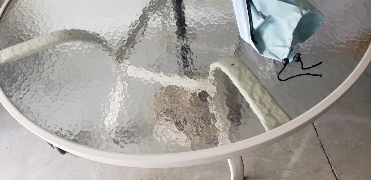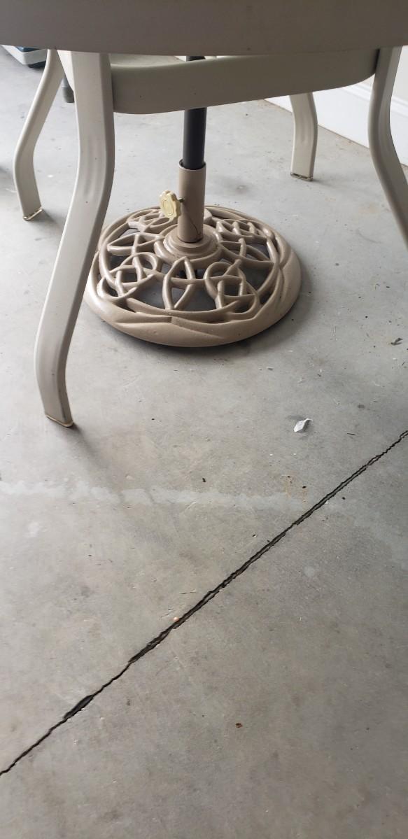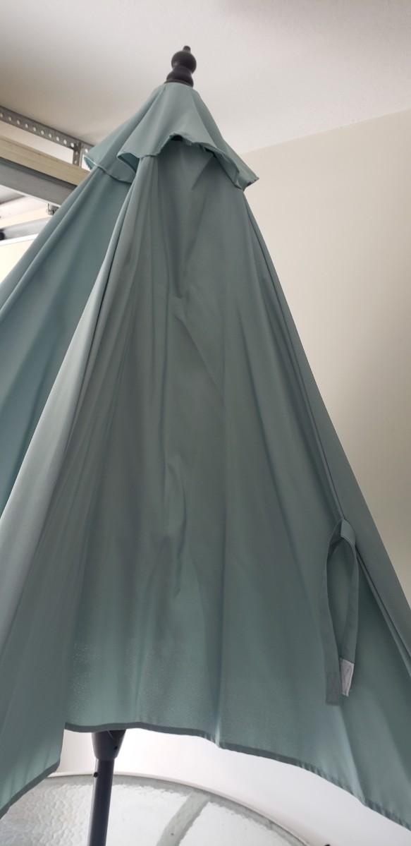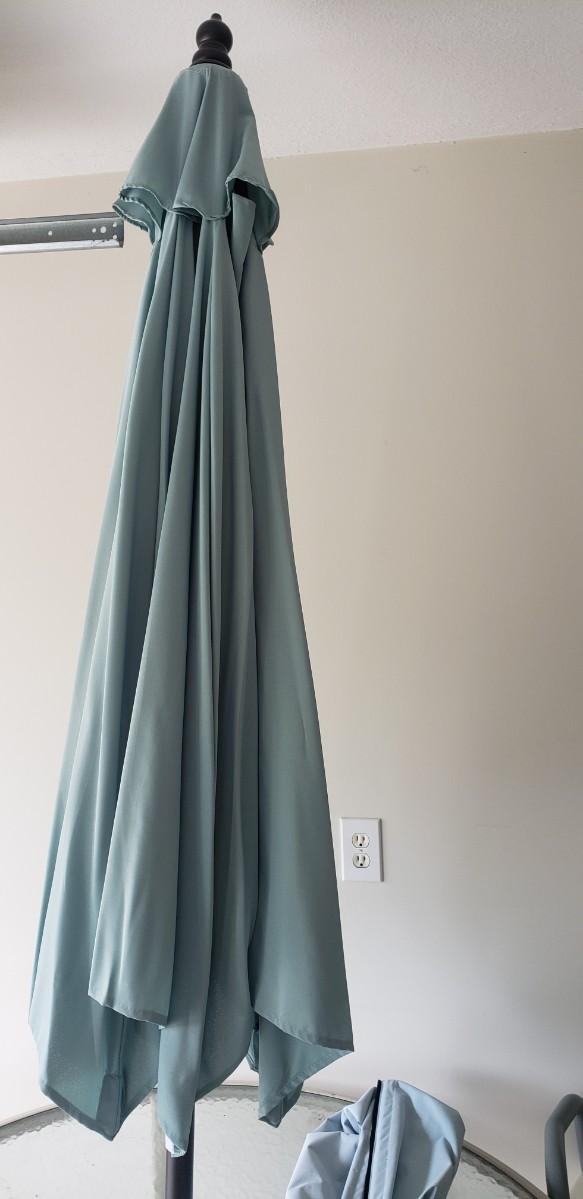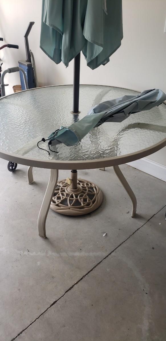 Glass table with off white frame. Teal Umbrella with case & base to hold in place.