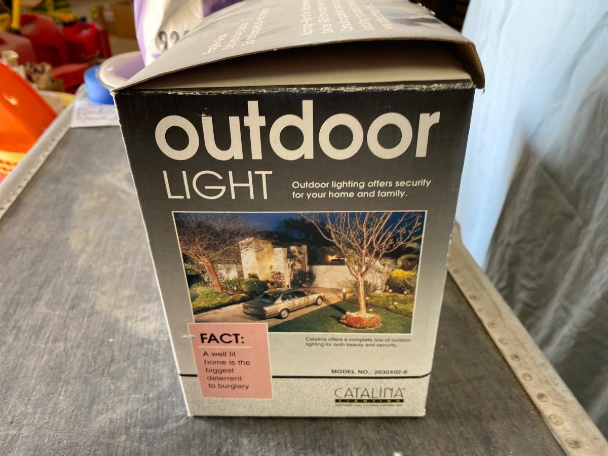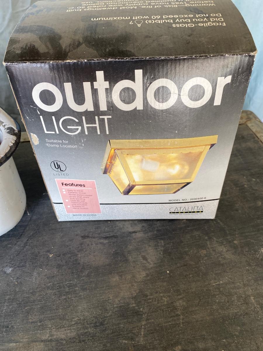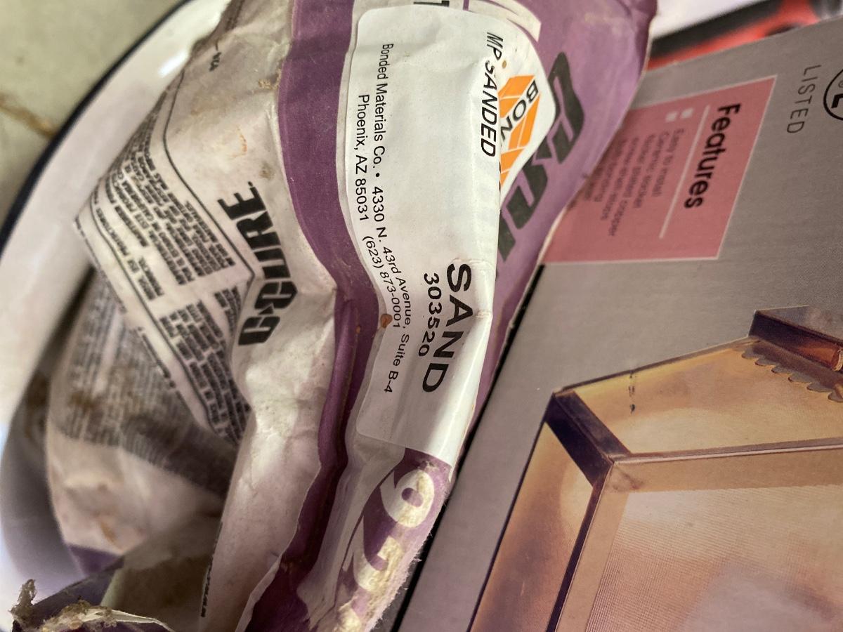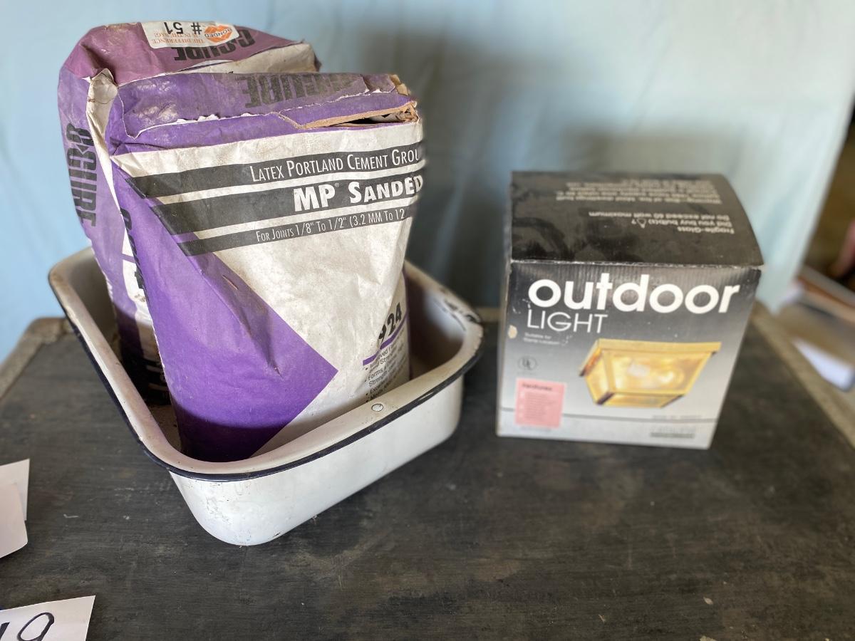 OUTDOOR PORCH OR GARAGE LIGHT, 2 BAGS OF SAND COLORED GROUT AND ENAMEL PAN