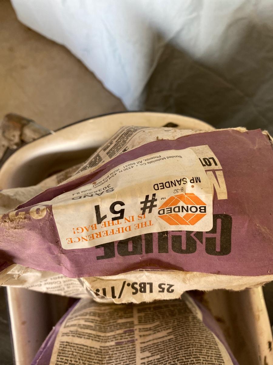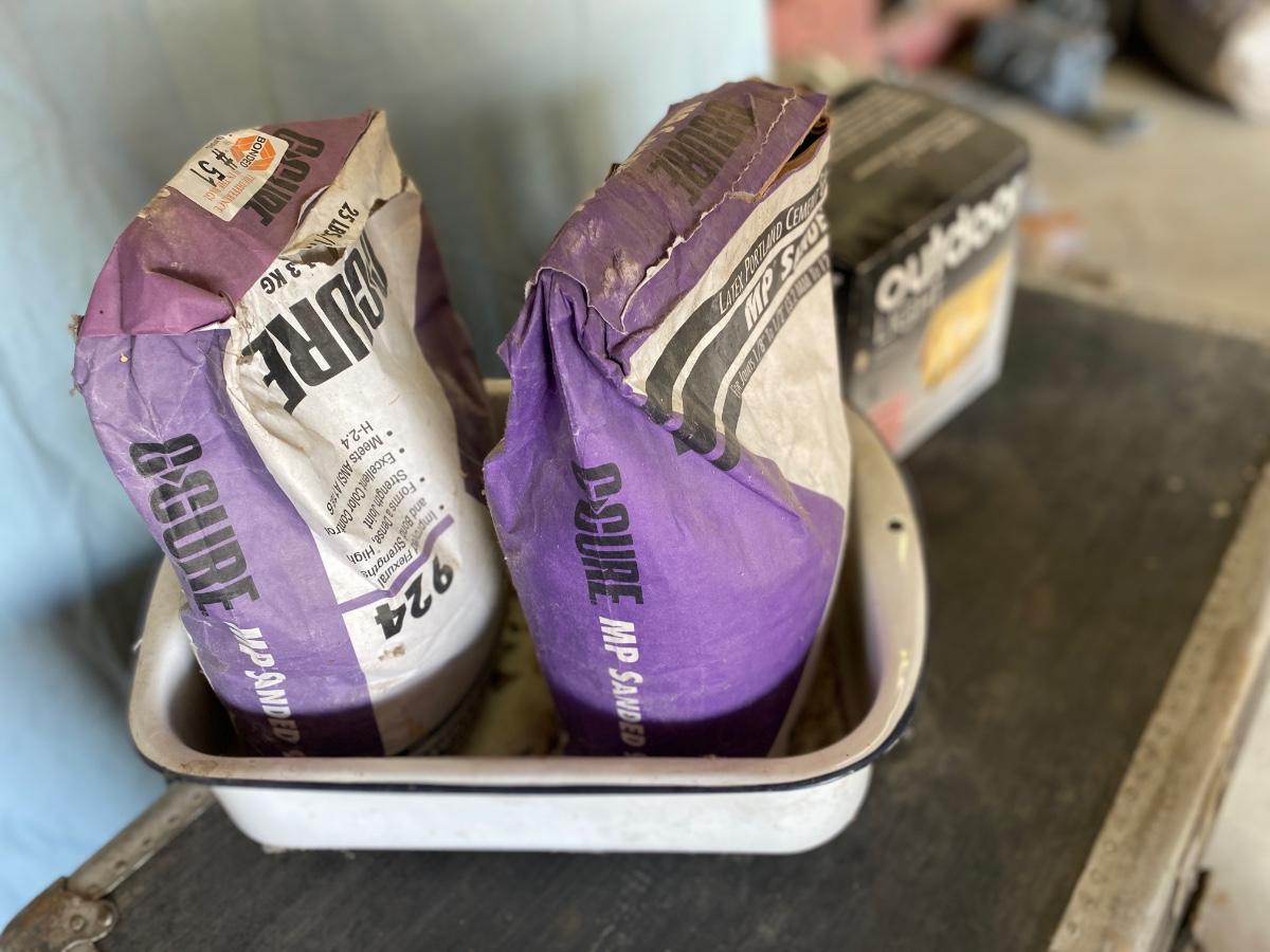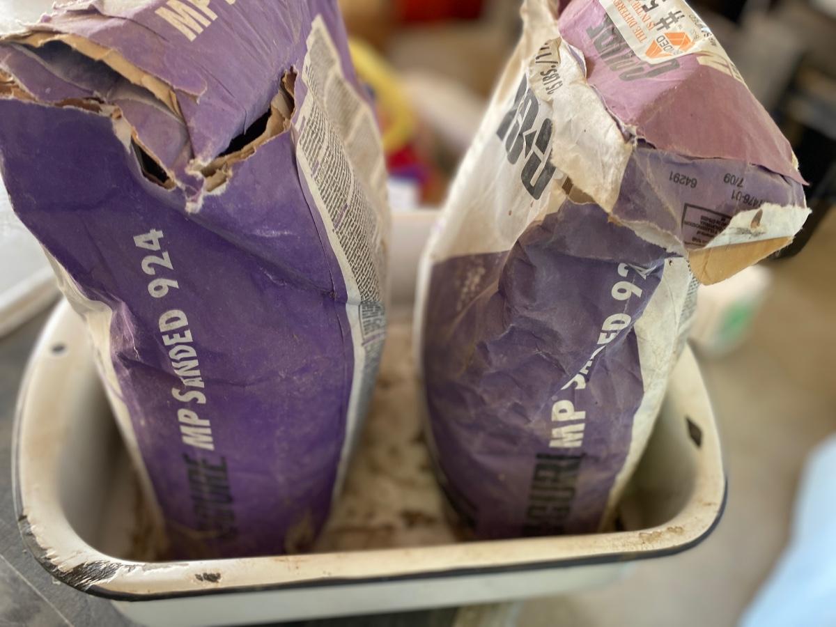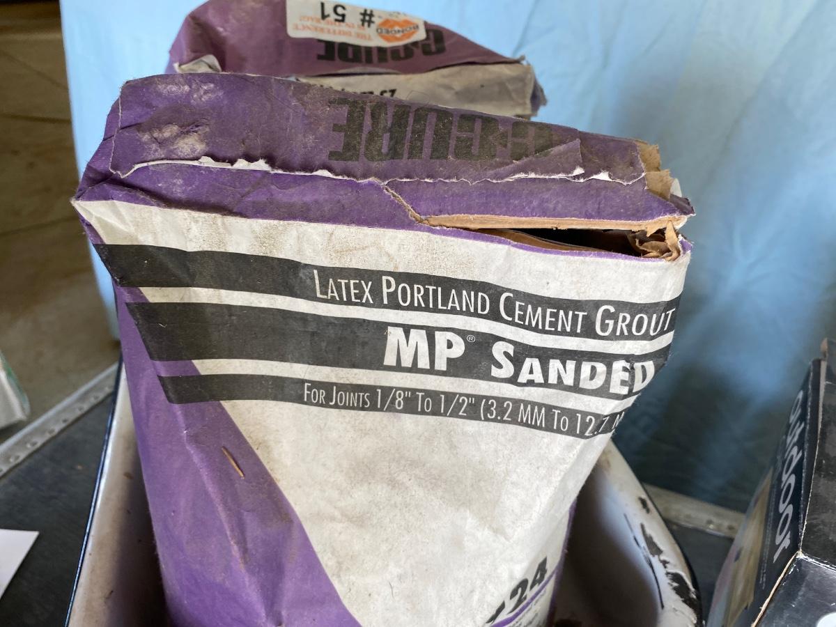 OUTDOOR PORCH OR GARAGE LIGHT, 2 BAGS OF SAND COLORED GROUT AND ENAMEL PAN