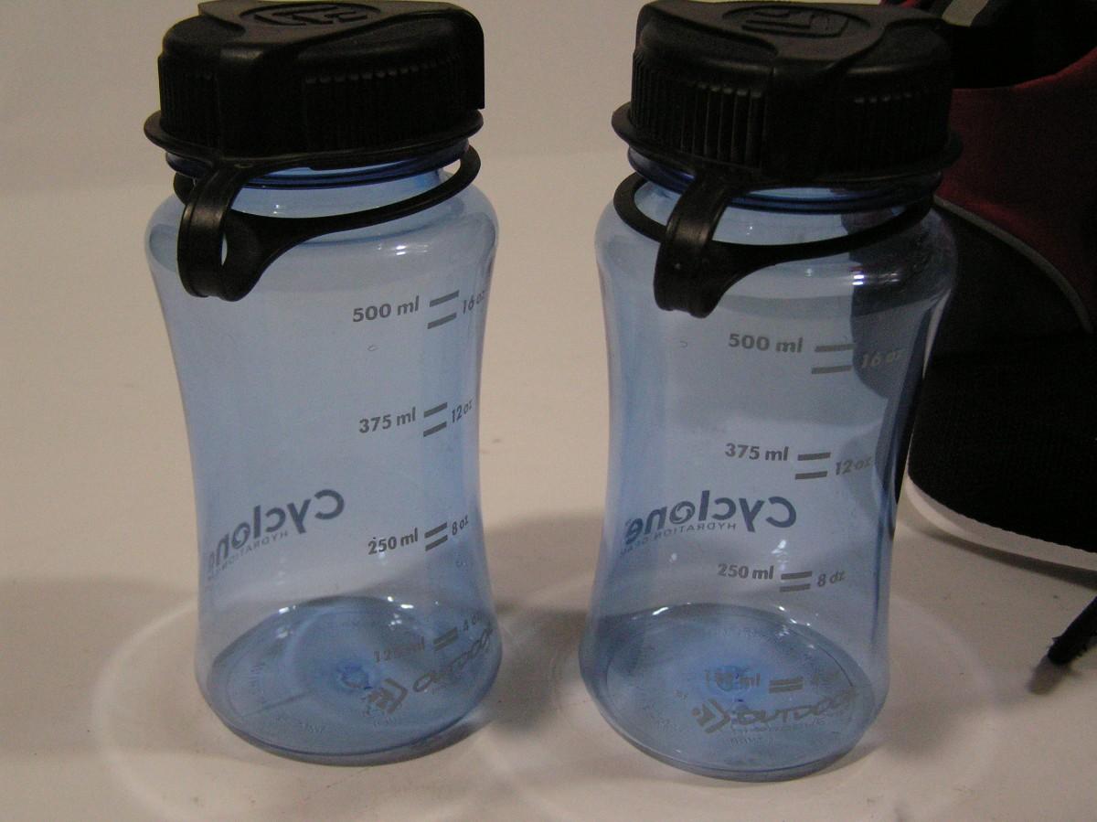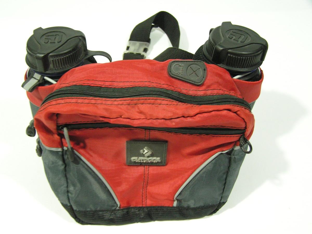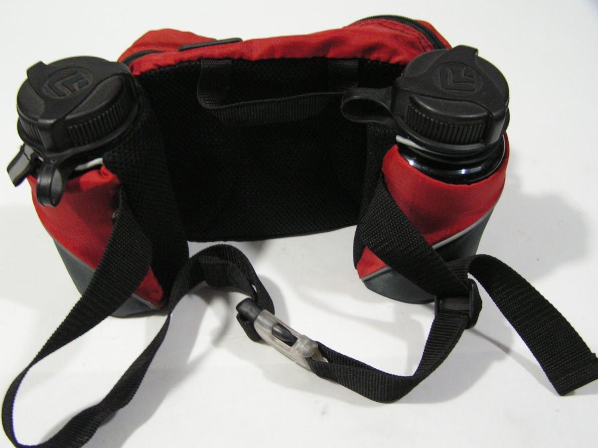 Outdoor Products brand small fanny pack, looks like it was never used. Two sparkly clean water bottles hold 500ml each. Each bottle held in place by a bungee. 1 large pocket, 1 small pocket w/zippers Padded mesh in back.