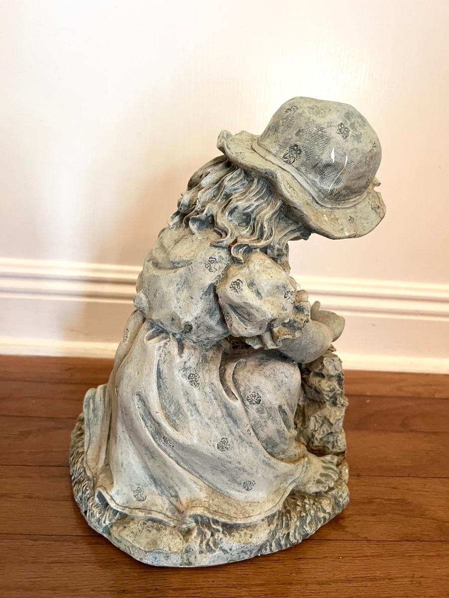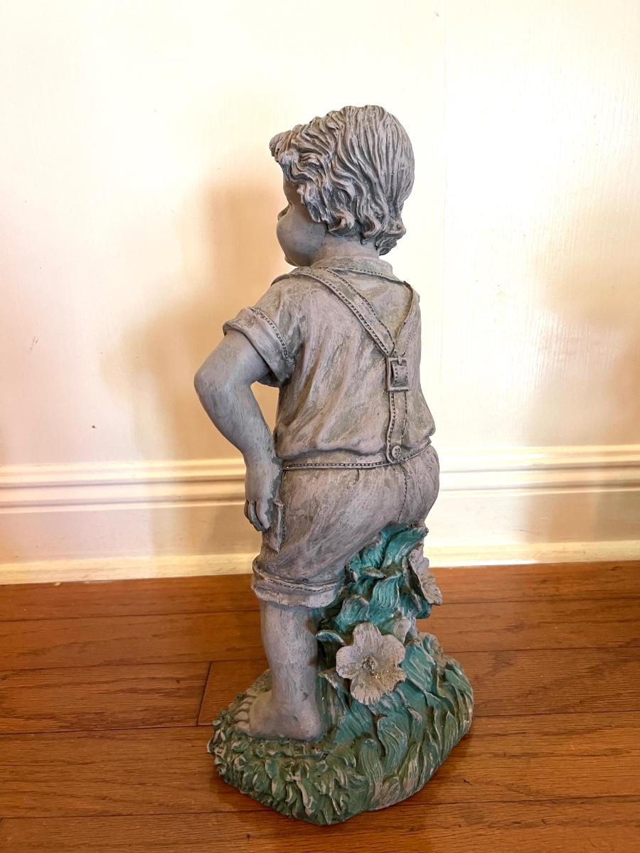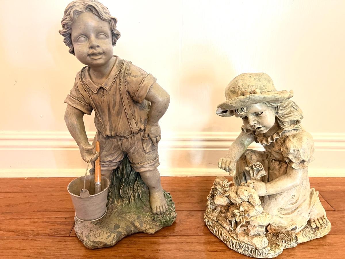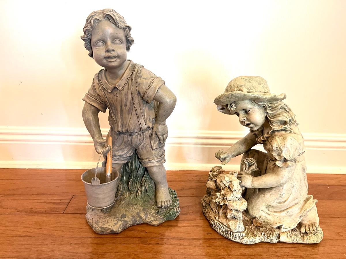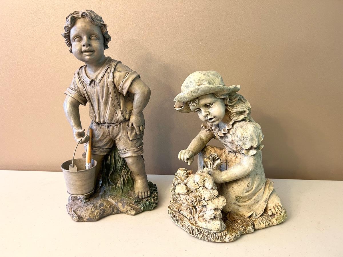 Boy statue measures 17 inches tall. Girl statue measures 13 inches tall. Girl statue has a chipped hat, being sold as is, garden art. See picture.