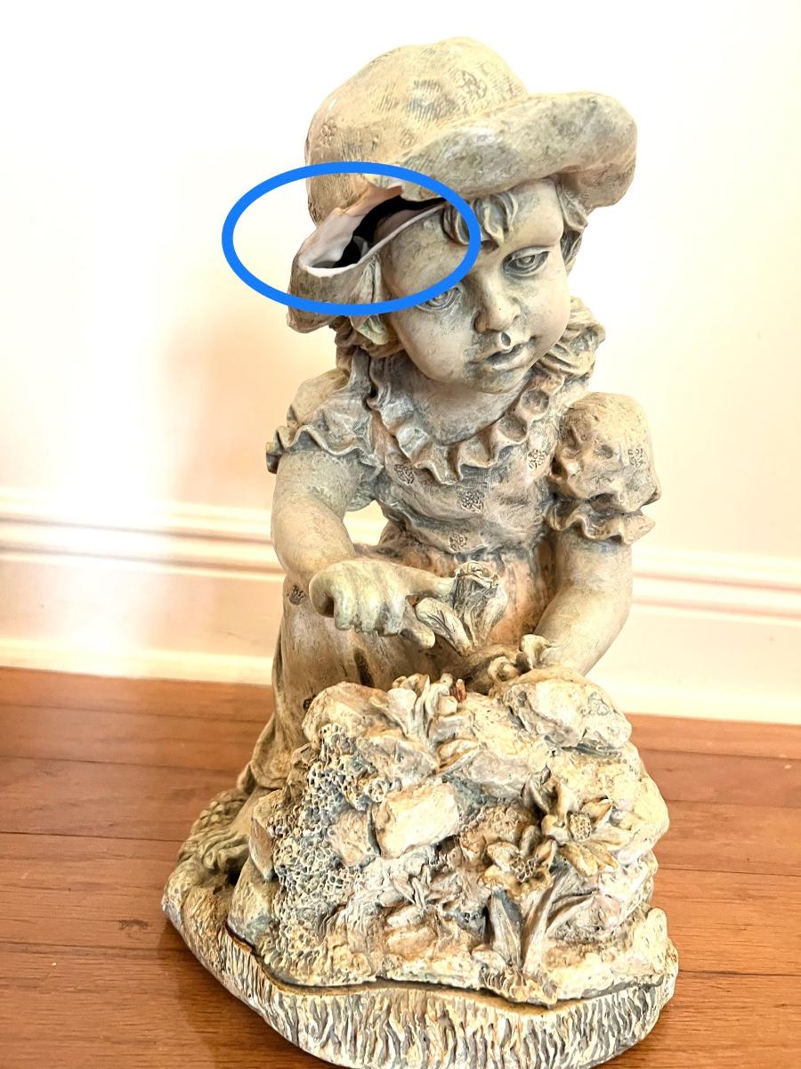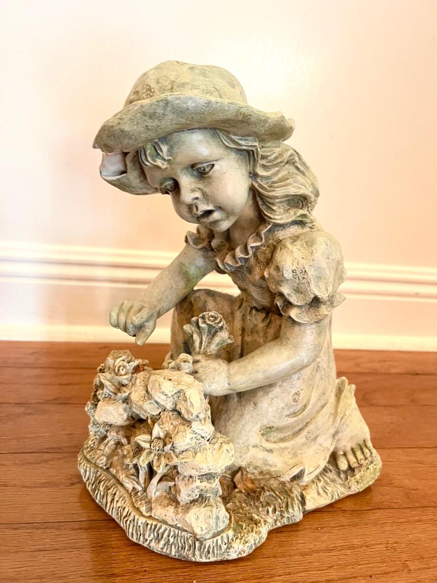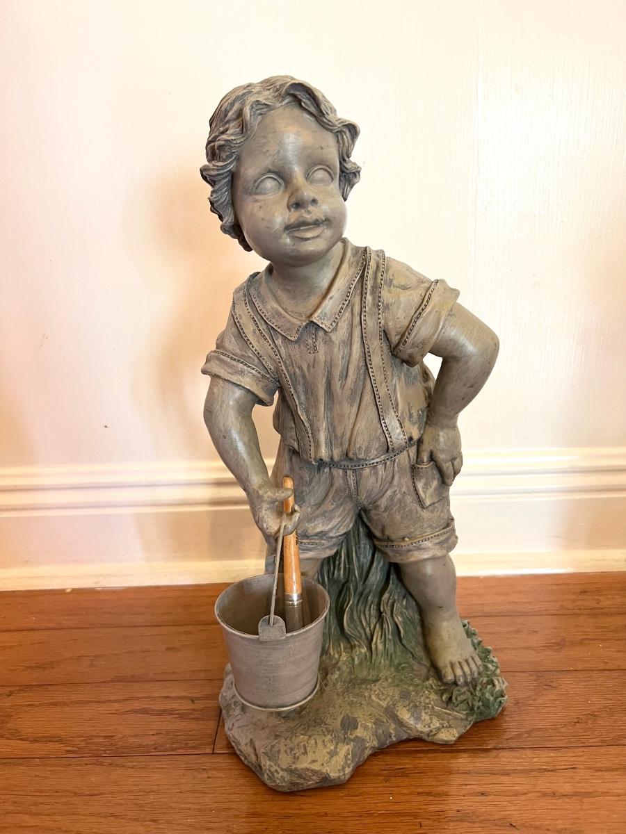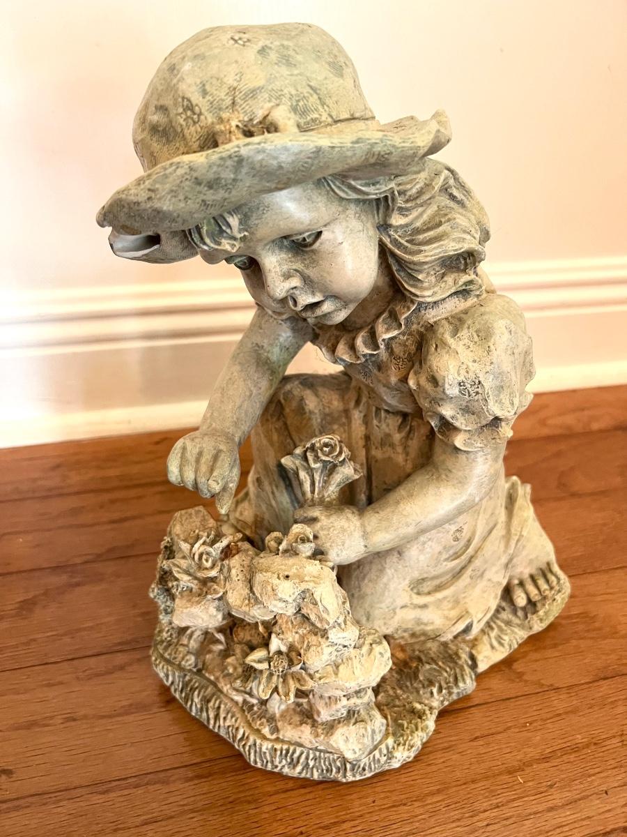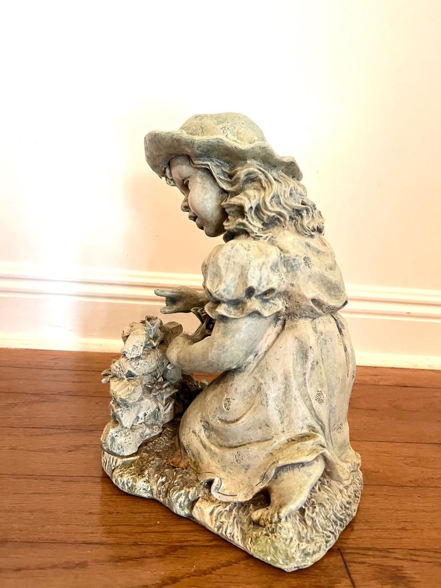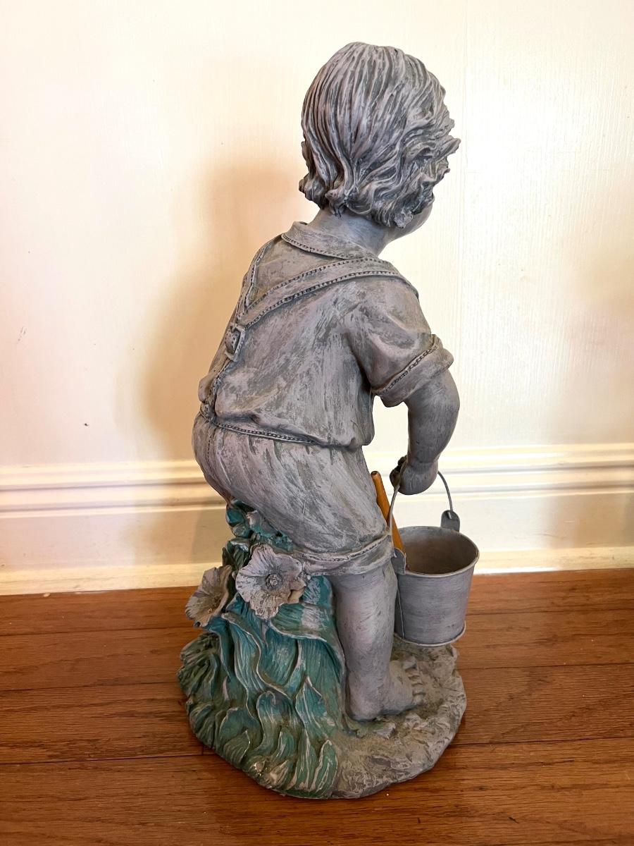 Boy statue measures 17 inches tall. Girl statue measures 13 inches tall. Girl statue has a chipped hat, being sold as is, garden art. See picture.