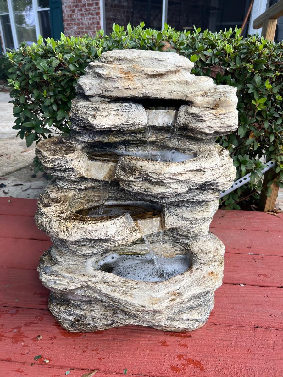 Plaster, multi level water fountain. Measures 24 inches tall. Works as it should.