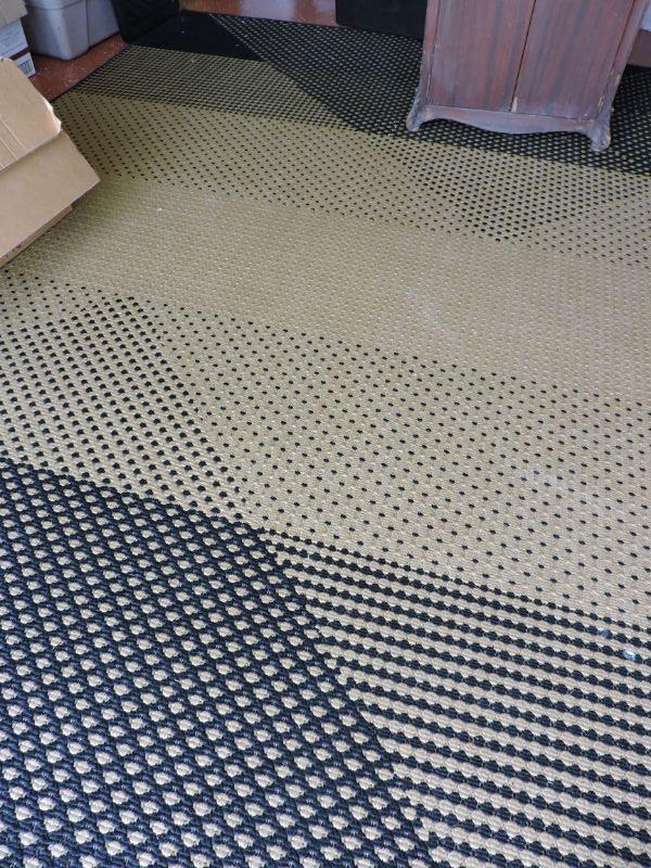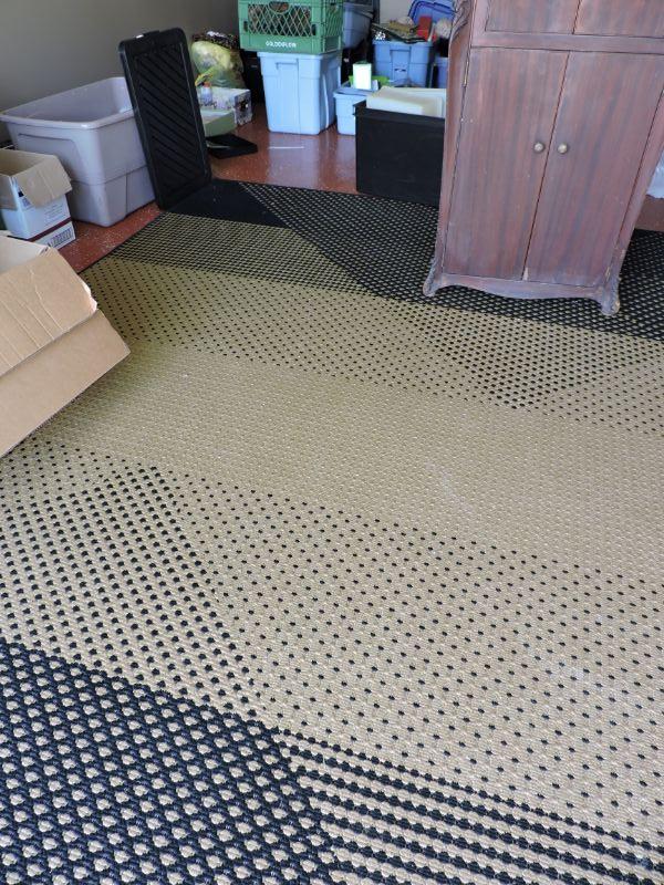 This outdoor rug has been used in a garage used only for storage. In pretty good condition! Matches the other rug listed, but much larger. I'm sorry to say I forgot to measure it, but my best guess is 8'x10'. **Please read Terms and Conditions before placing a bid. Pick up is Wednesday, September 25 from 4pm to 7pm and Saturday, September 28 from 9am to 1pm in Williamstown, NJ. All sales are final. All sales are as is, where is. Please review all photos. Any props included in photos are not included in listing. All measurements are approximate.