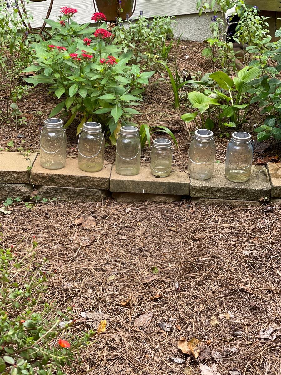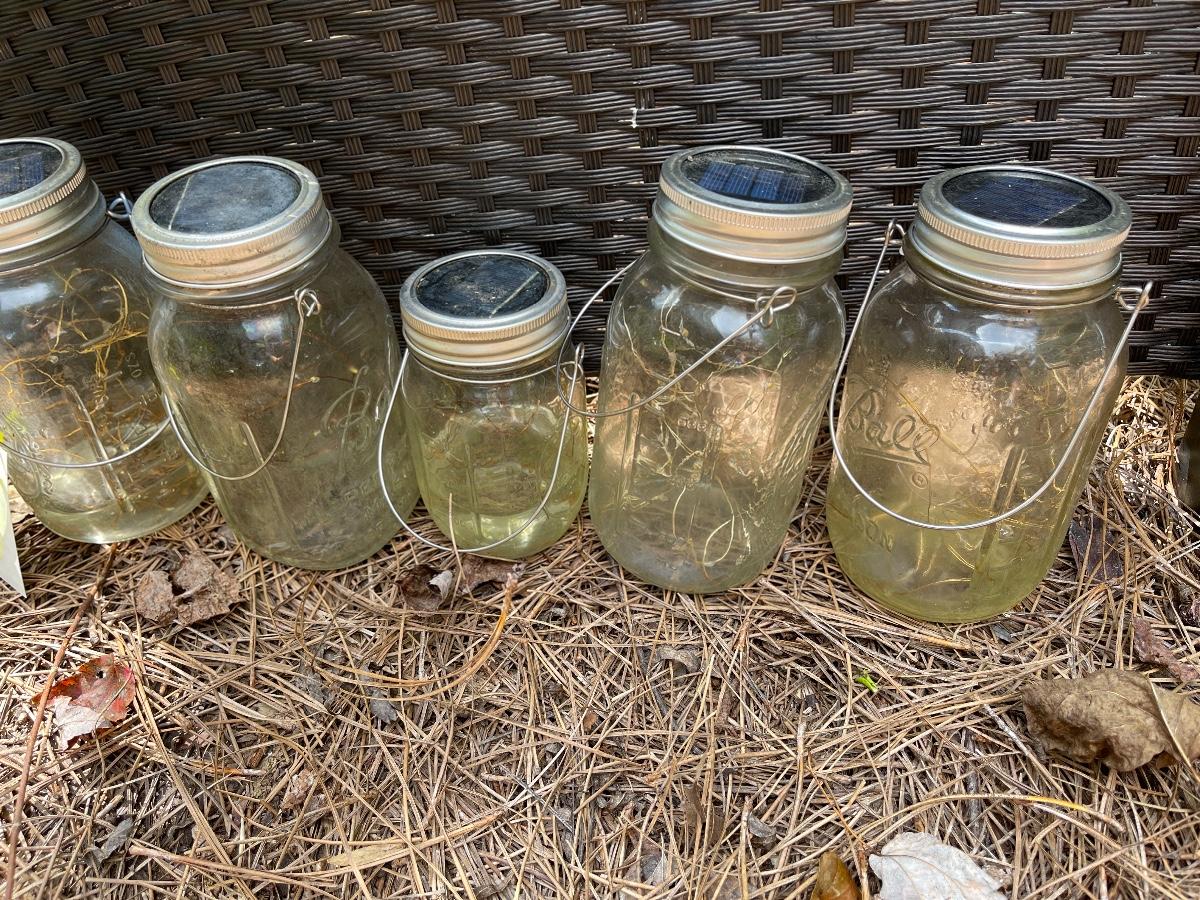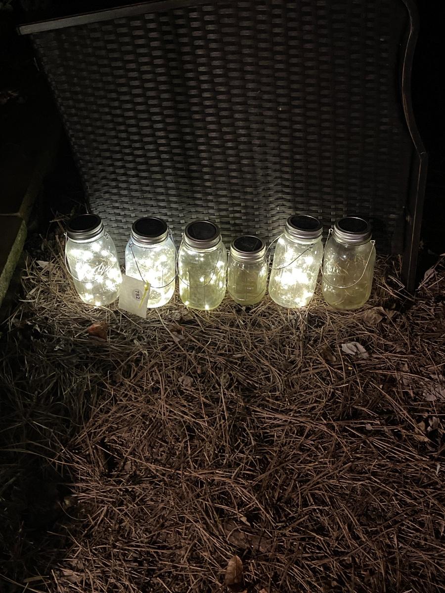 Mason Jars Made into Lanterns. All have handles. Some jars have solar Fairy Lights inside.