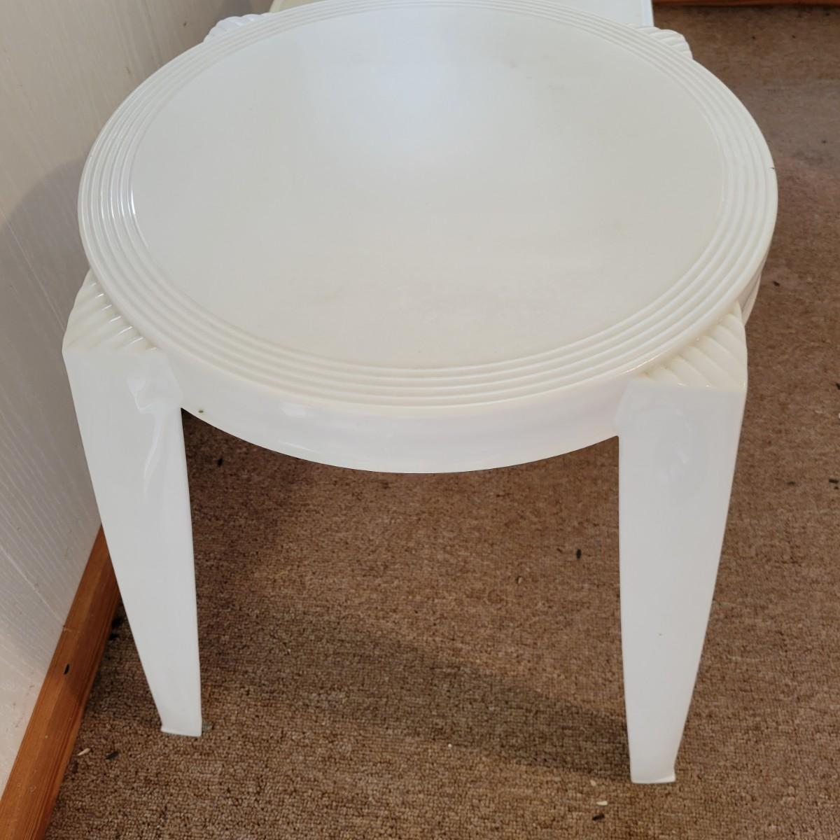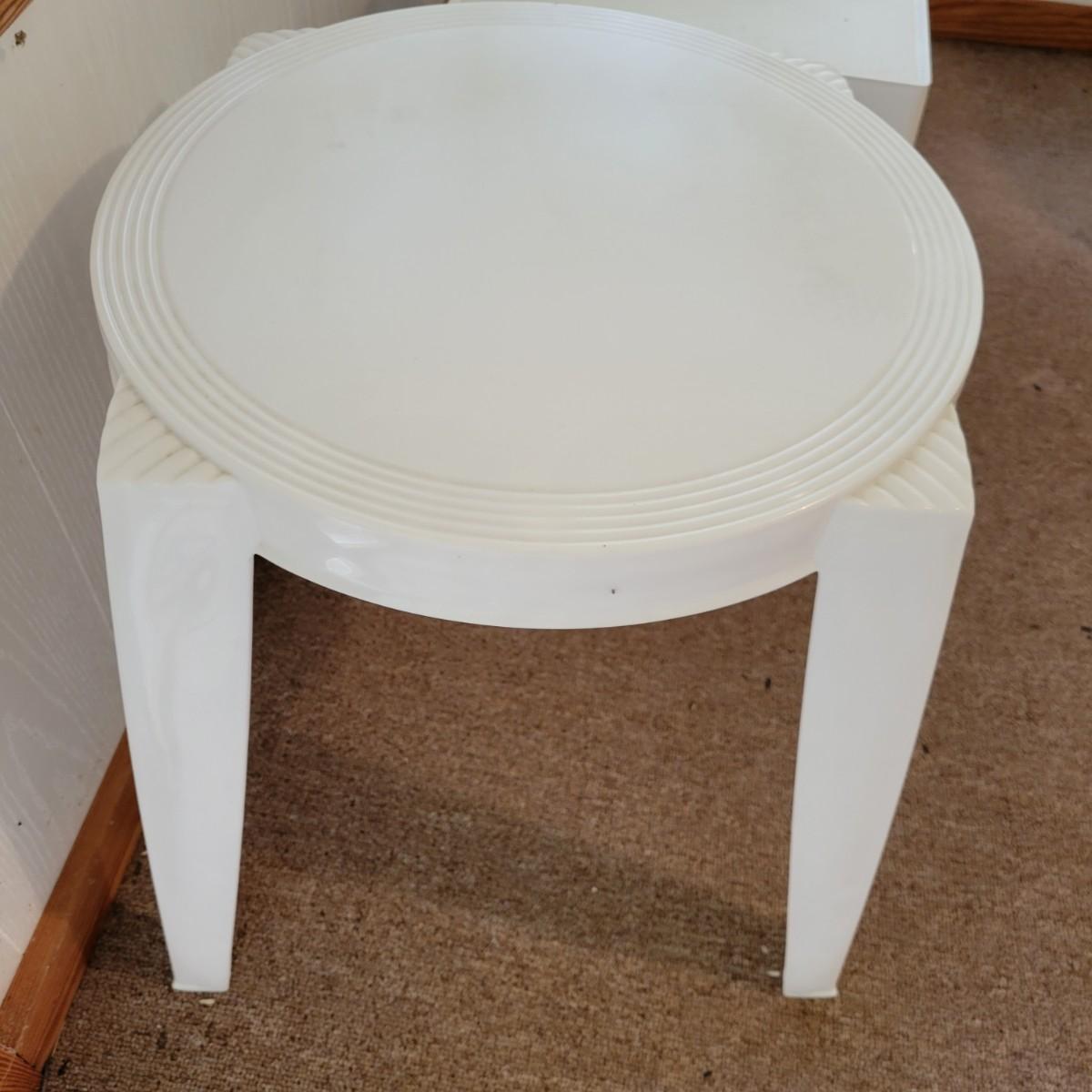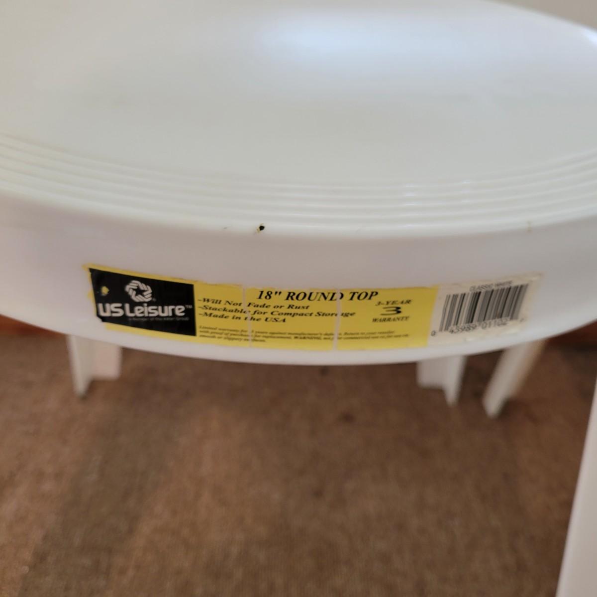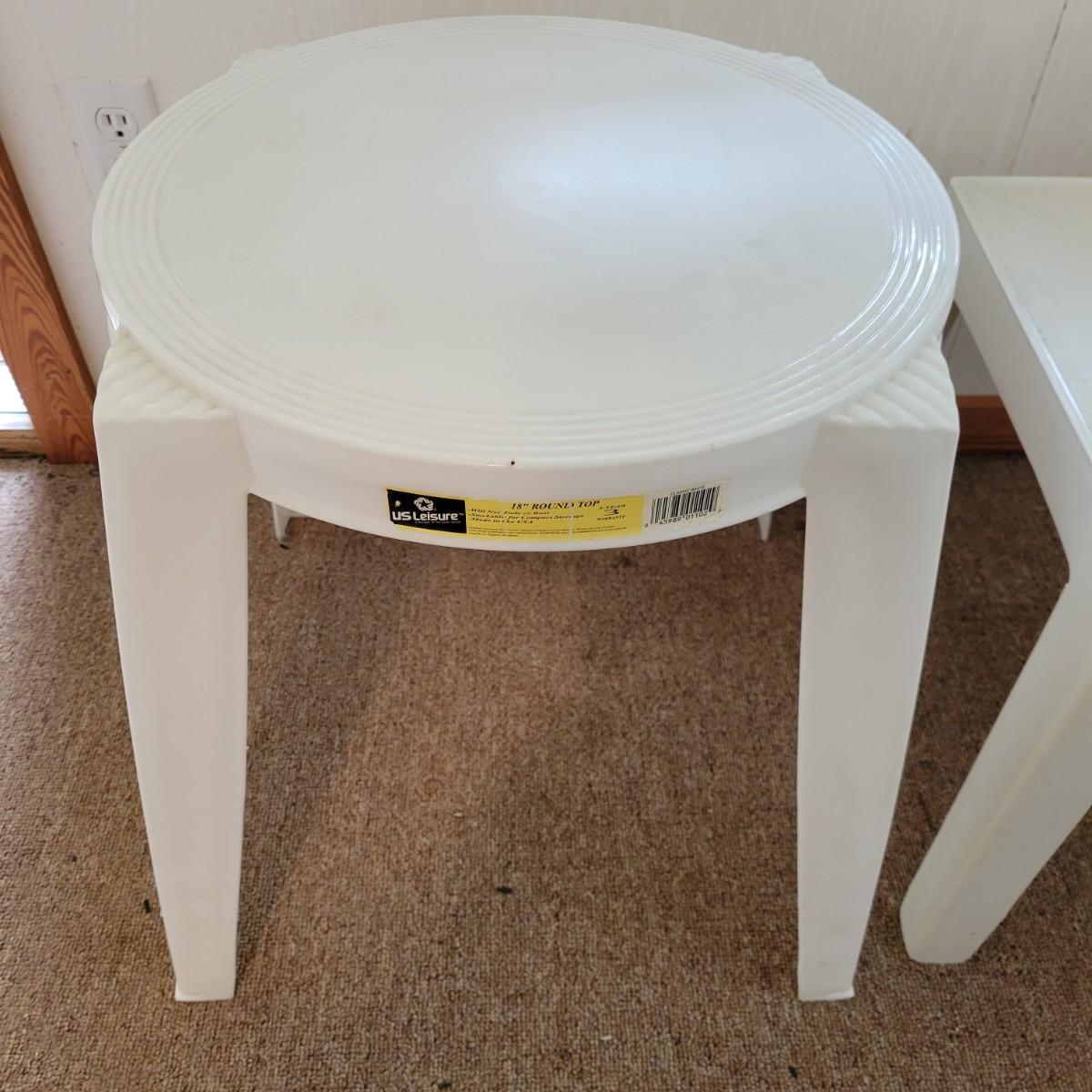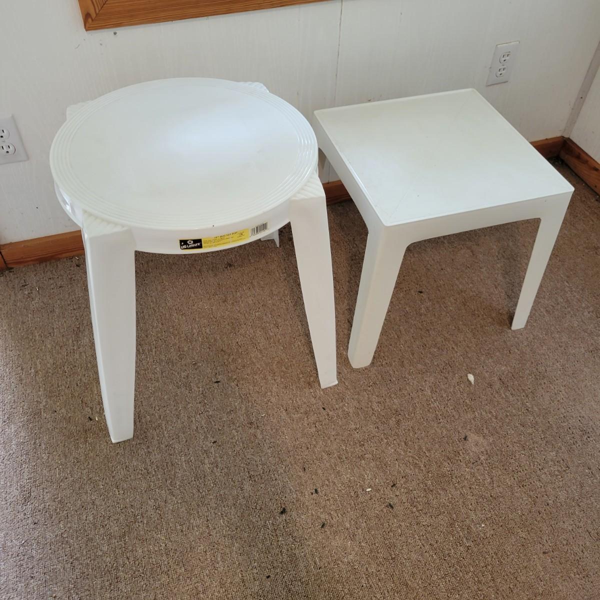 A pair of plastic outdoor side tables. The largest round table measures approximately 18"D x 20"H. Local pickup only