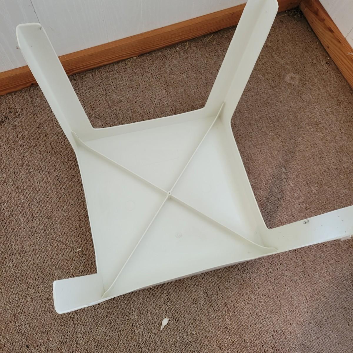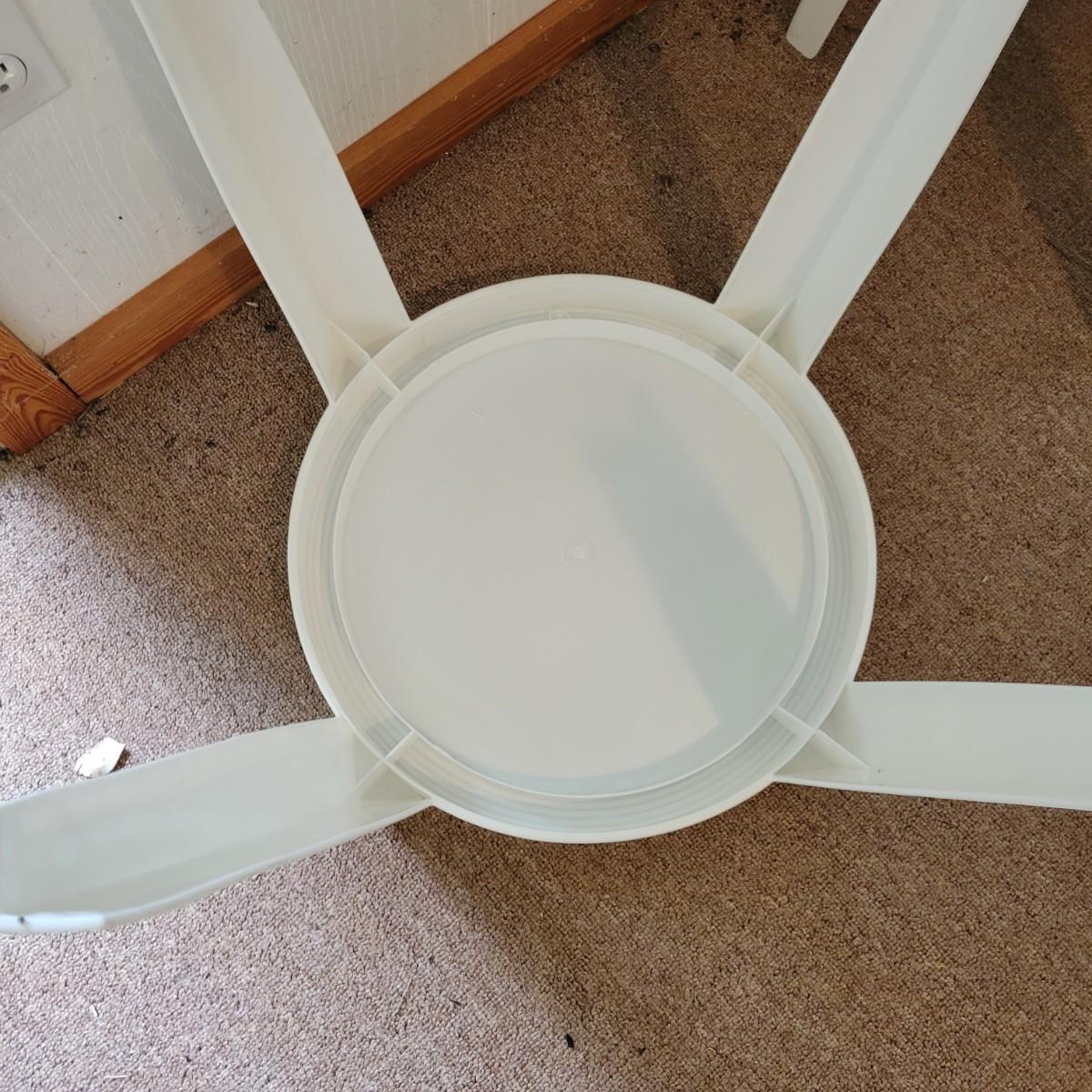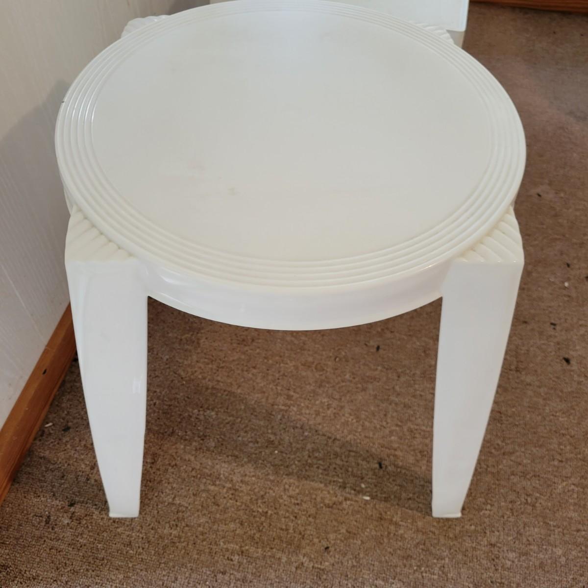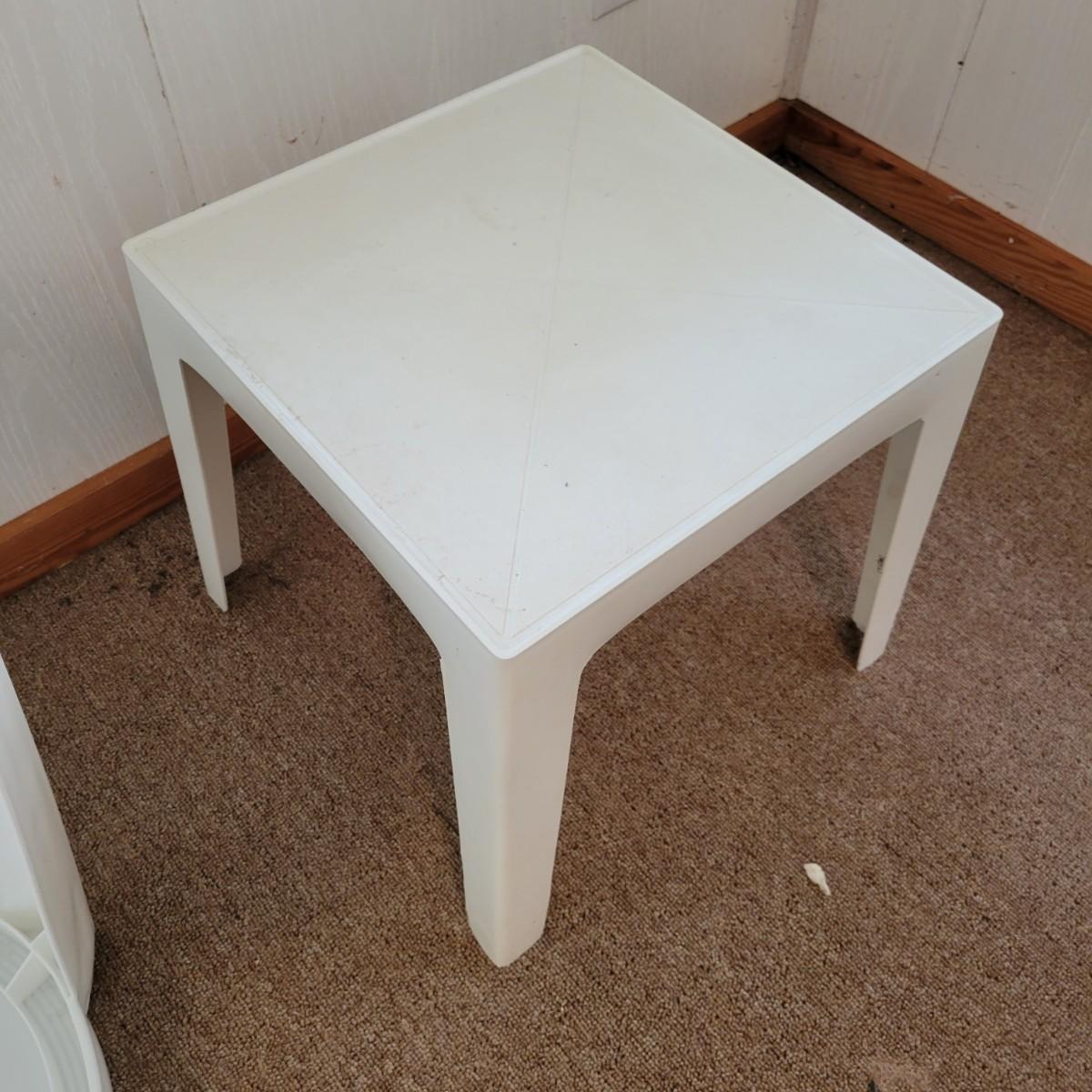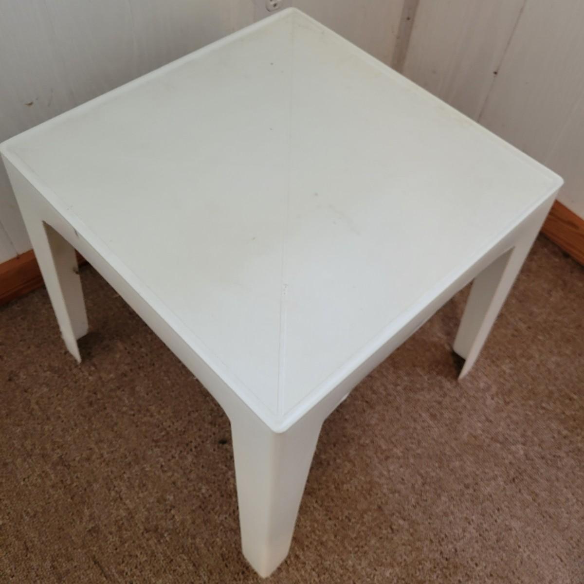 A pair of plastic outdoor side tables. The largest round table measures approximately 18"D x 20"H. Local pickup only