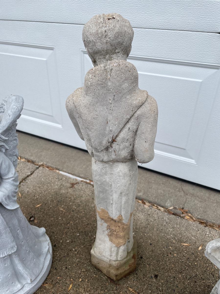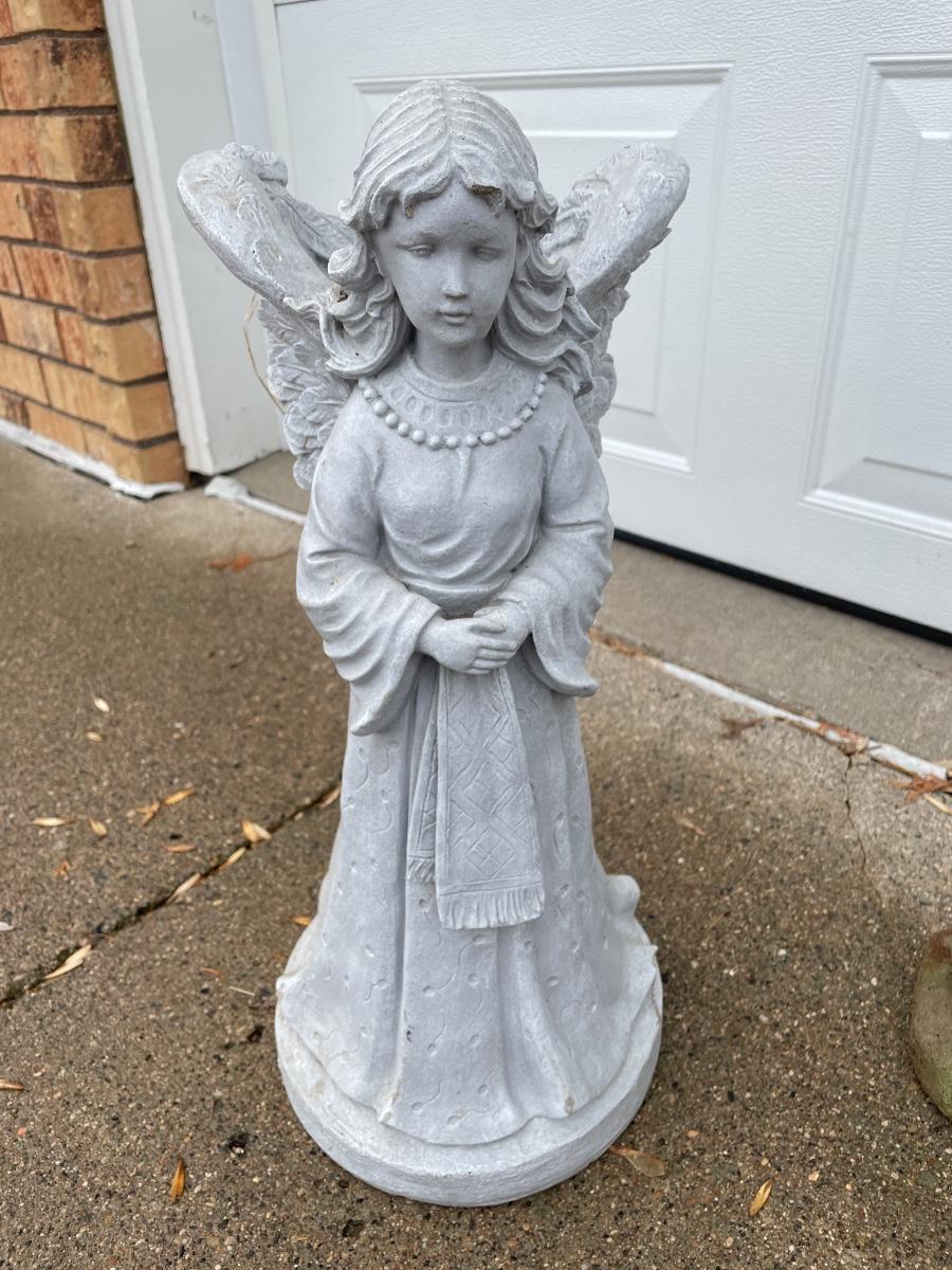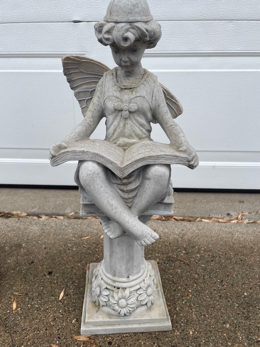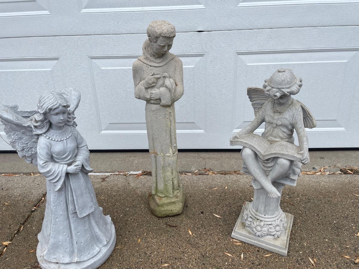 3 statues. The left female angel and man are made of clay and the right side angle with book is made of plastic. All 3 have been repaired or has some wear and tear cosmetic damage.