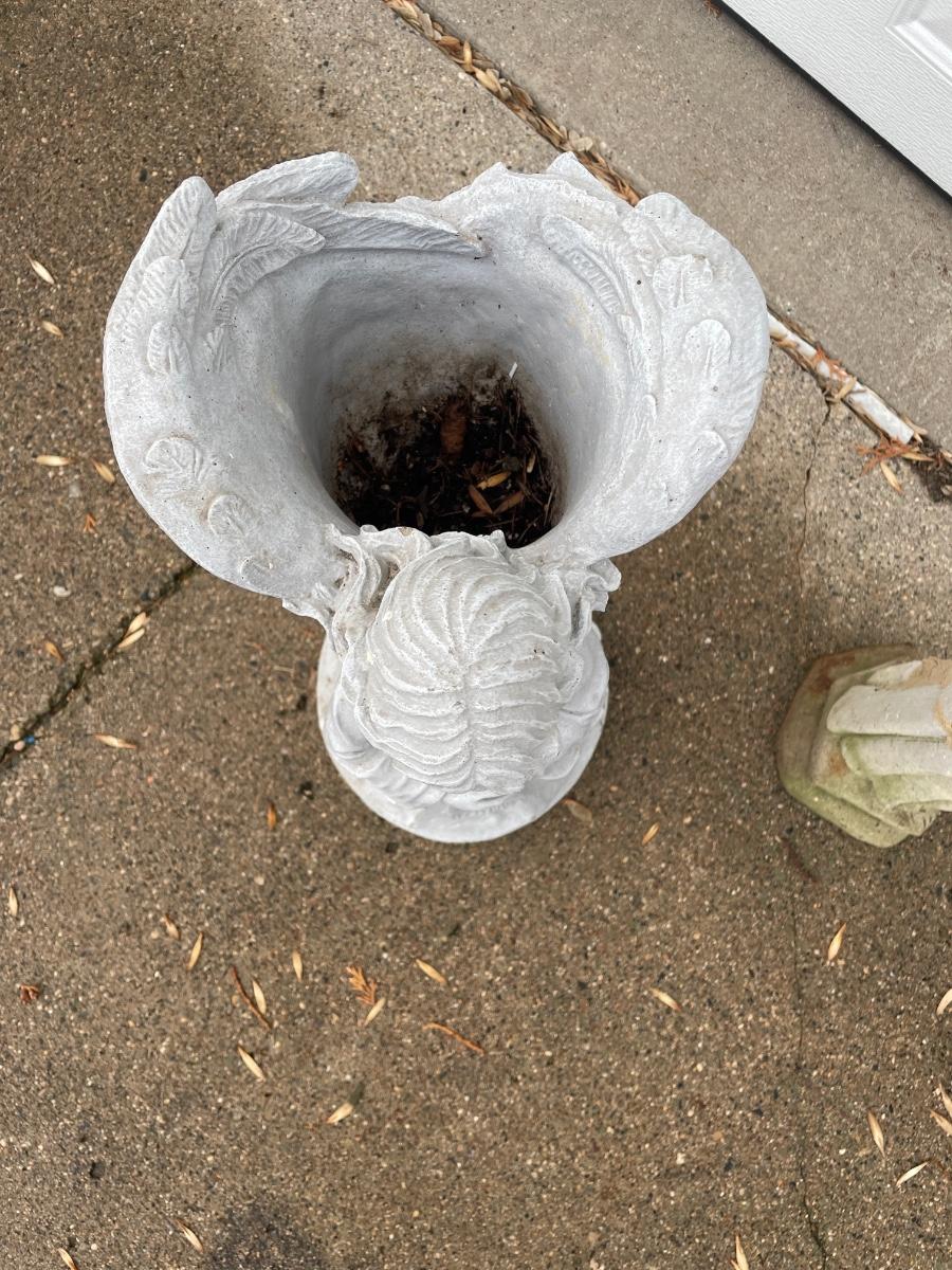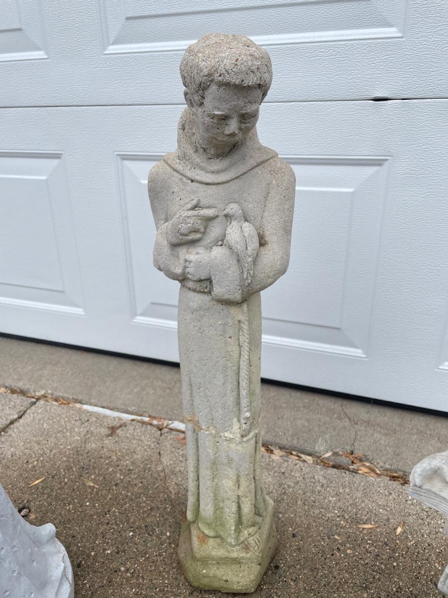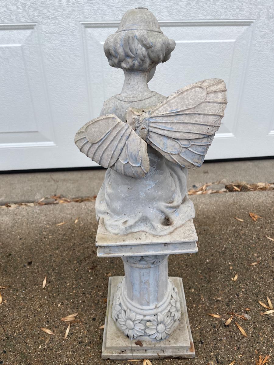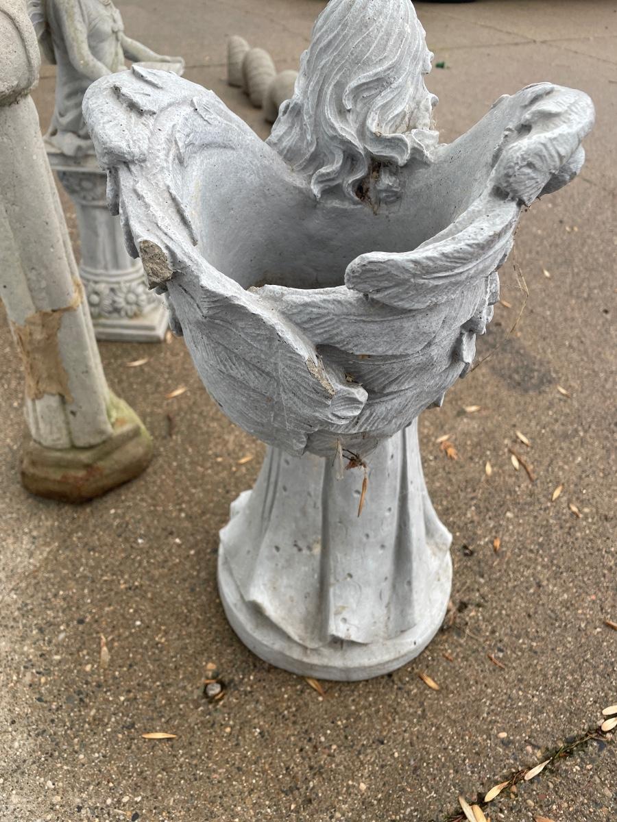 3 statues. The left female angel and man are made of clay and the right side angle with book is made of plastic. All 3 have been repaired or has some wear and tear cosmetic damage.