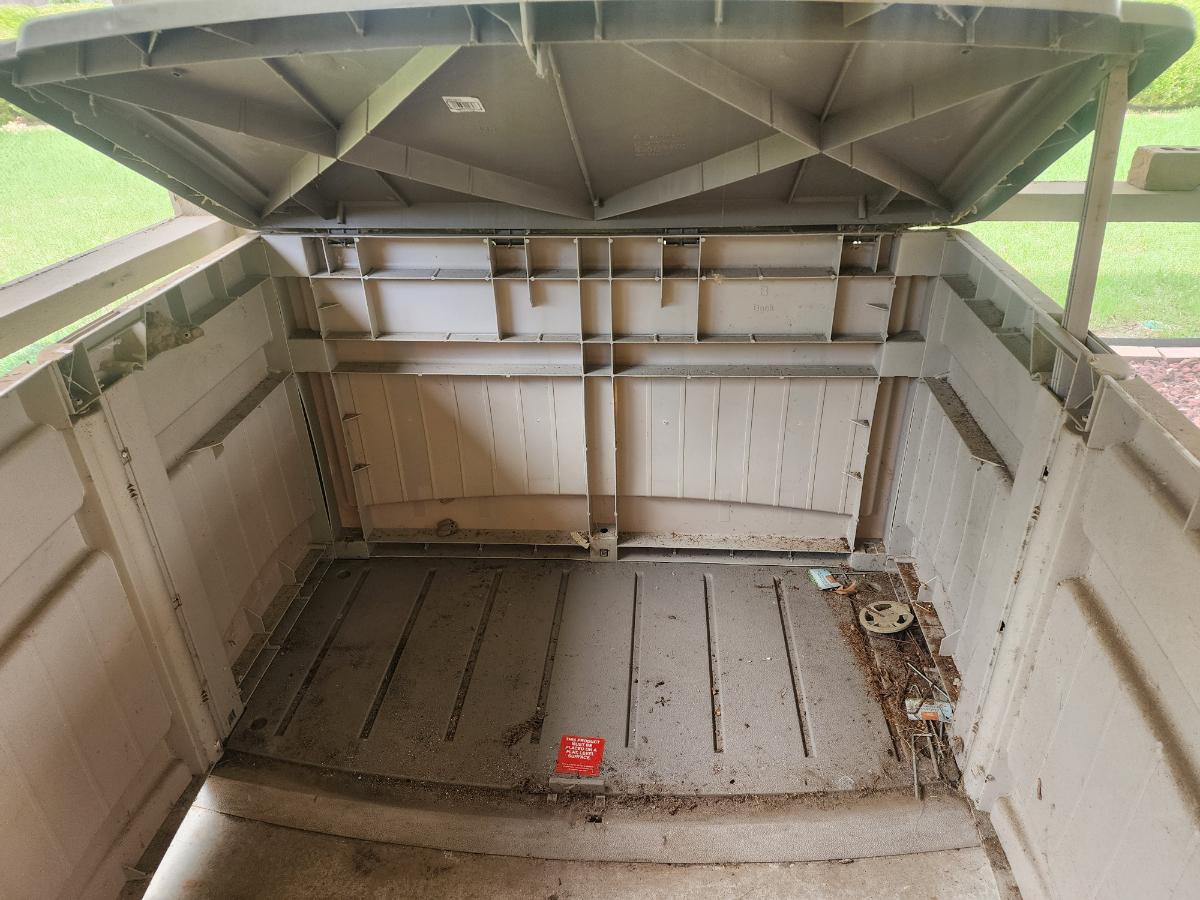 Suncast 2 Door Storage Unit w/ lift top and 2 doors 55 1/2"W x 33"H x 30 1/2" D (located in screened-in patio). There are two of these in the auction. This one has been in a screened in patio.