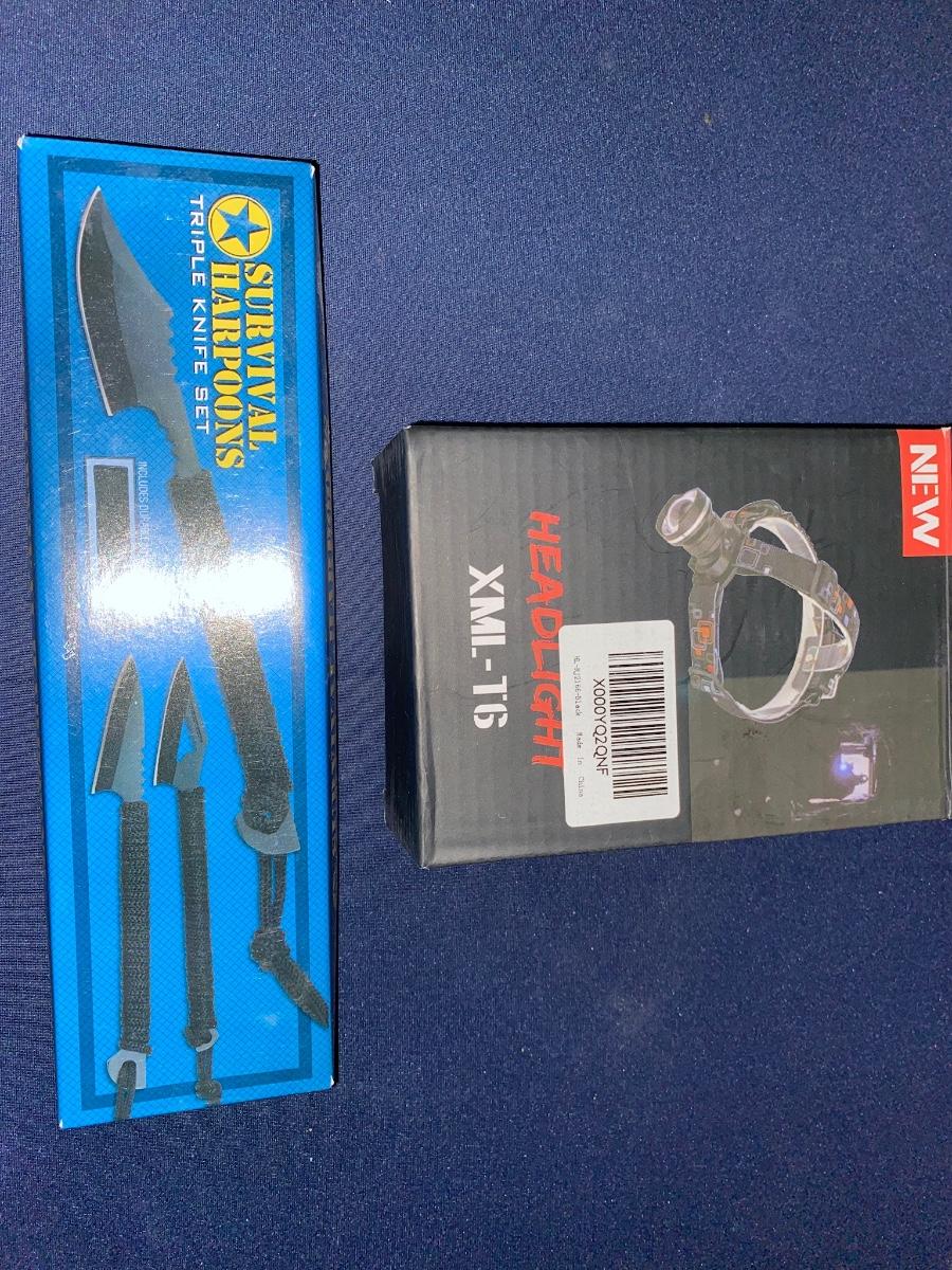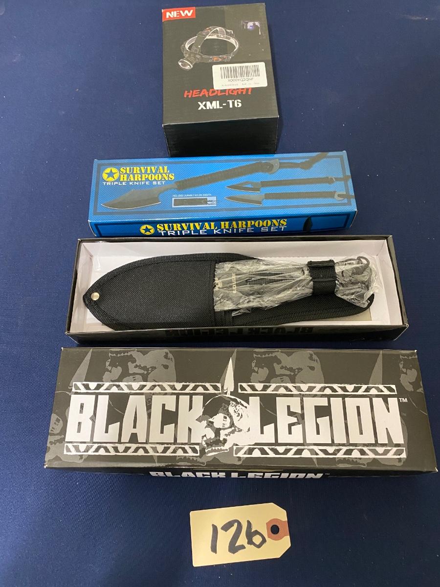 Head Lamp, Survival Harpoons, Triple Knife Set, Black Legion Knife As Pictured