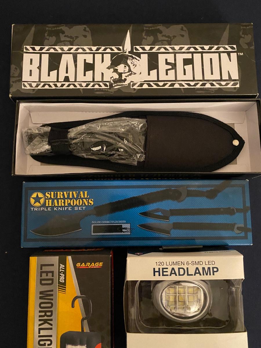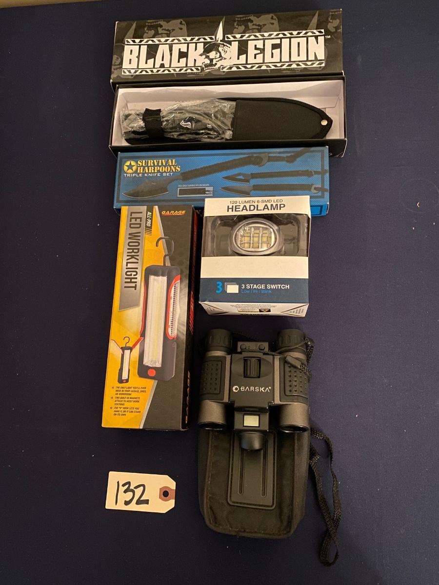 Outdoor Survival Lot Includes Led Work Light, Head Lamp, Binoculars, Black Legion Knife, Survival Harpoons Triple Knife Set As Pictured