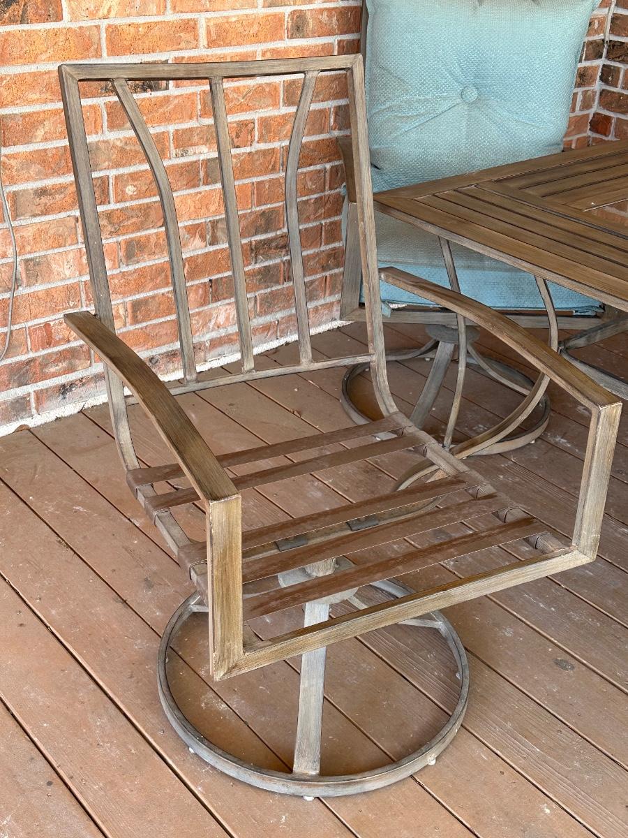 Patio Kept ~ Medium weight metal ~ chairs swivel but do not rock ~ Light surface rust ~ Cushions have no rips or tears but are very dirty and need cleaning, pressure washing or replaced. Table is 28” H x 42” x 42” and the screws will need to be tightened~ No Brand Name found