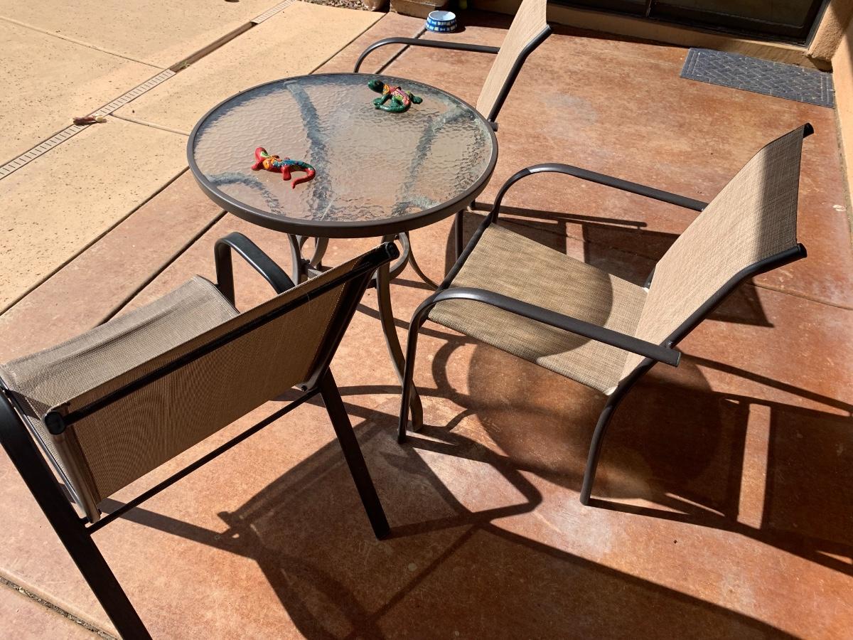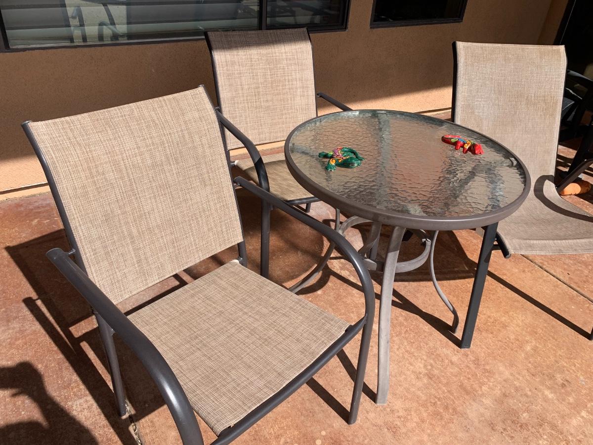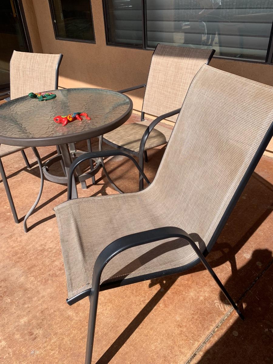 3 chairs and one tempered glass table in good condition with some wearing to the chairs as pictured. Includes 2 outdoor lizards. (Table diameter= 28 inches, table height= 28 inches)