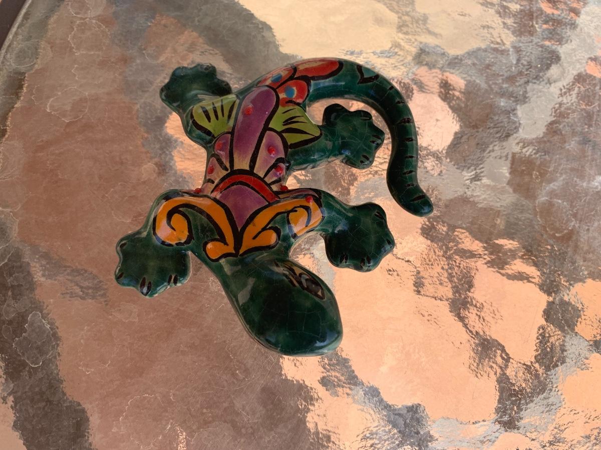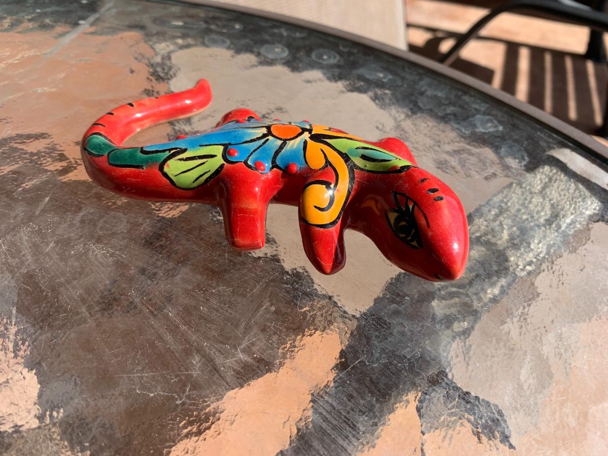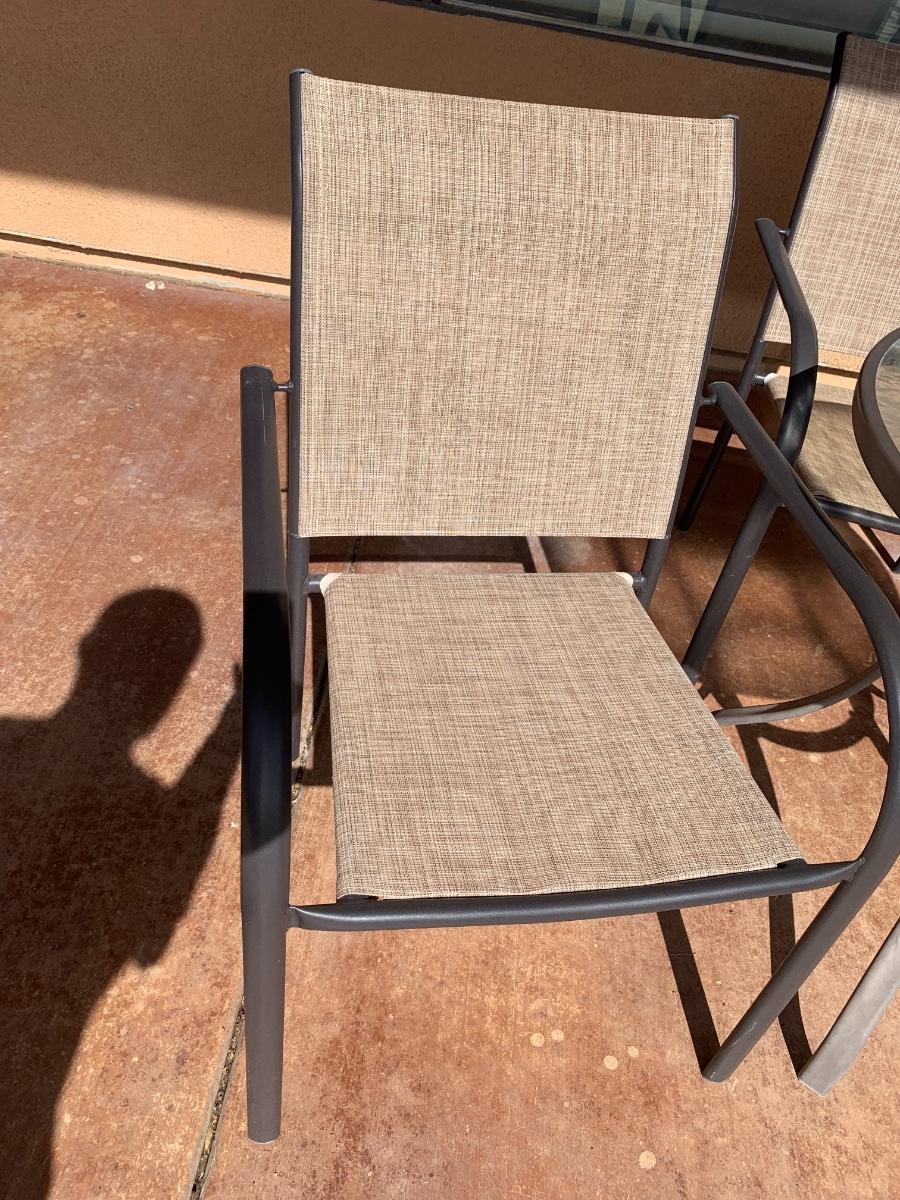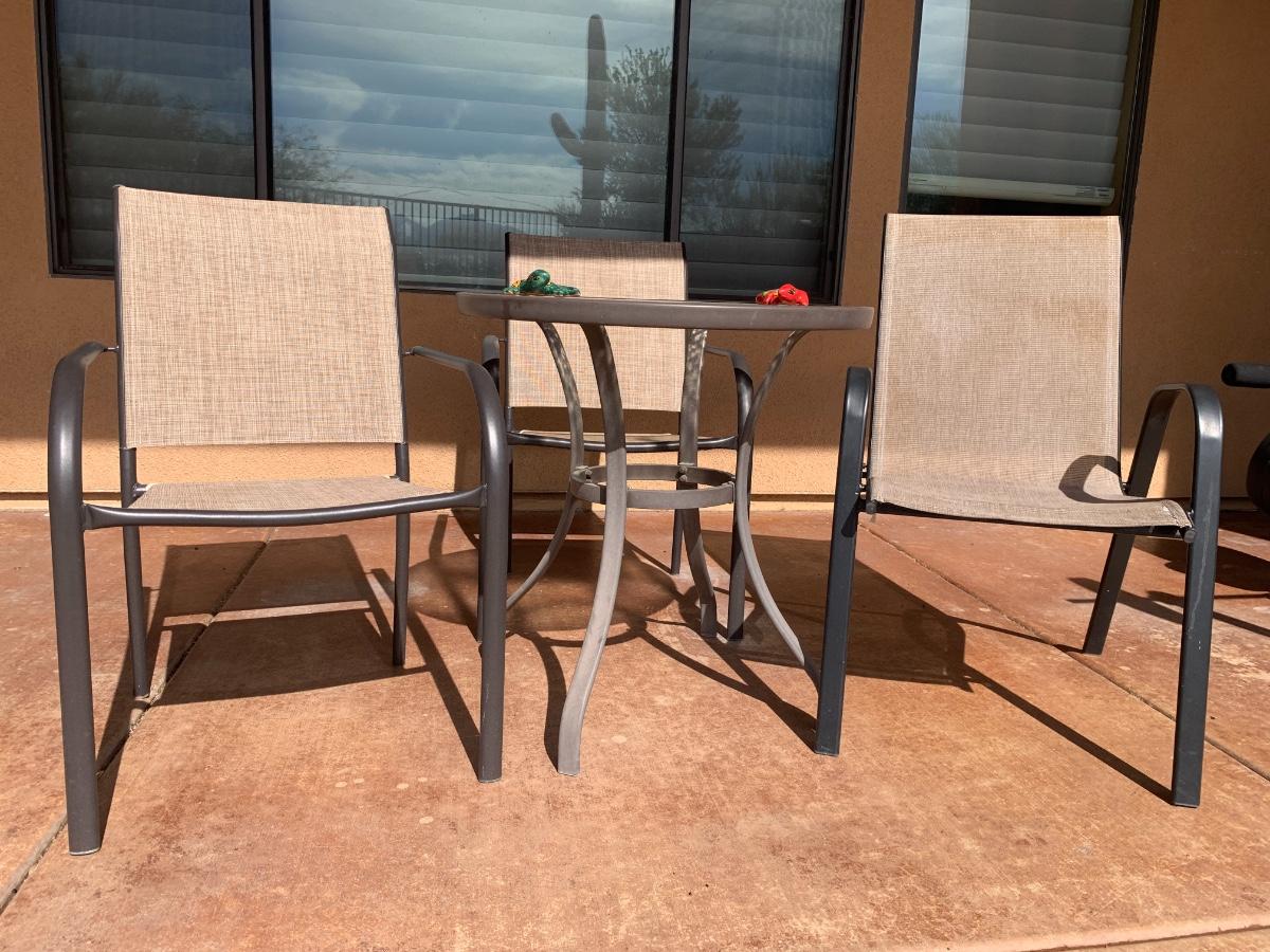 3 chairs and one tempered glass table in good condition with some wearing to the chairs as pictured. Includes 2 outdoor lizards. (Table diameter= 28 inches, table height= 28 inches)