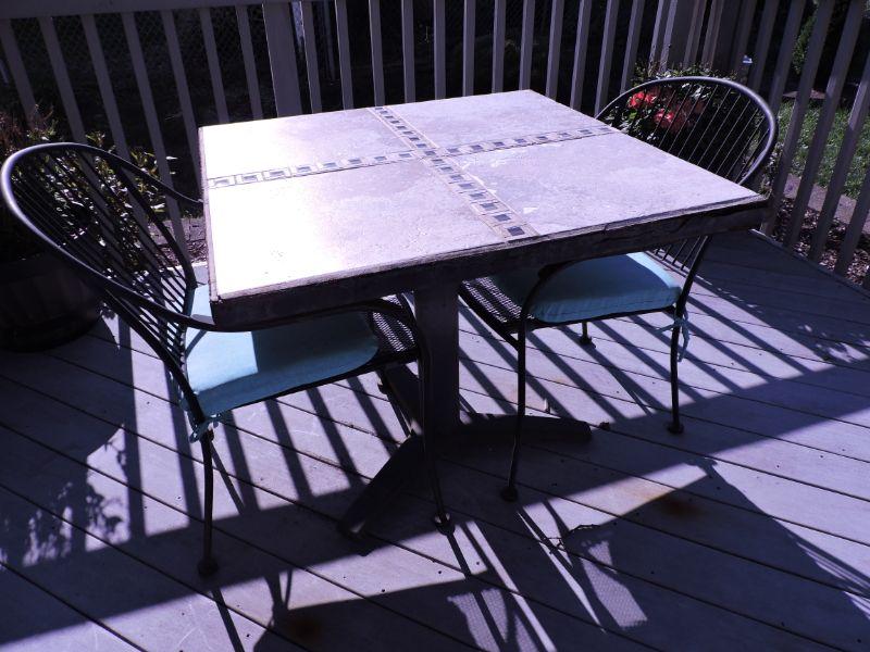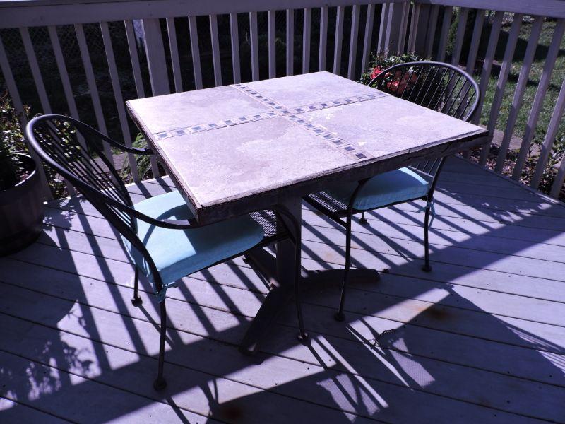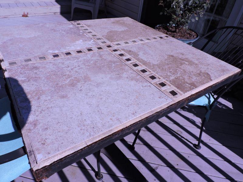 Table needs some TLC. It came from ChiChi's in Deptford after they closed. Tiling could be repaired. Chairs are in good condition and match second table that we are including in this lot. Please read Terms and Conditions before placing a bid. Pick up is Friday, October 25th between 4 and 7, and Saturday, October 26th between 9 and 1. Please bring boxes, tools, and muscle to help move your items. Props included in photos are not included in listing. All measurements are approximate.
