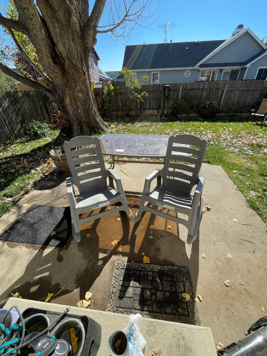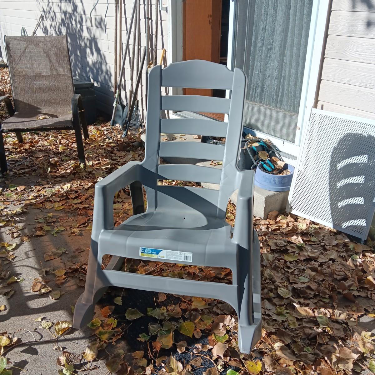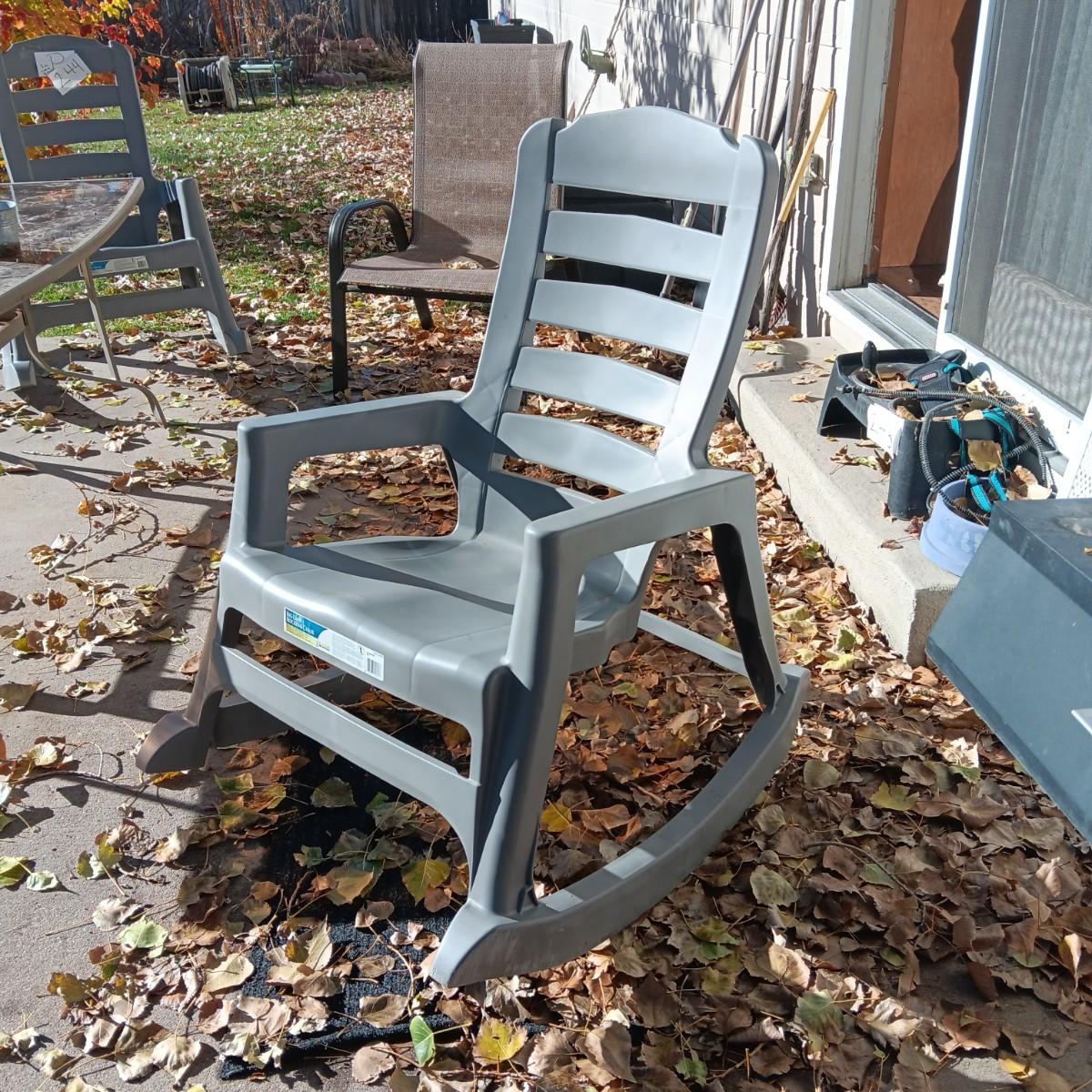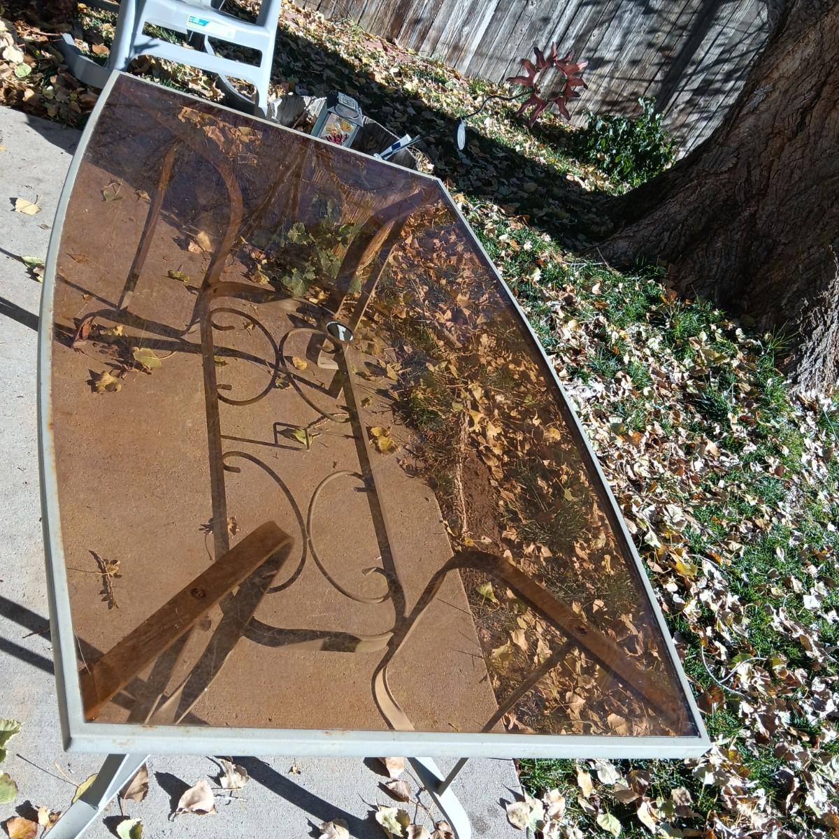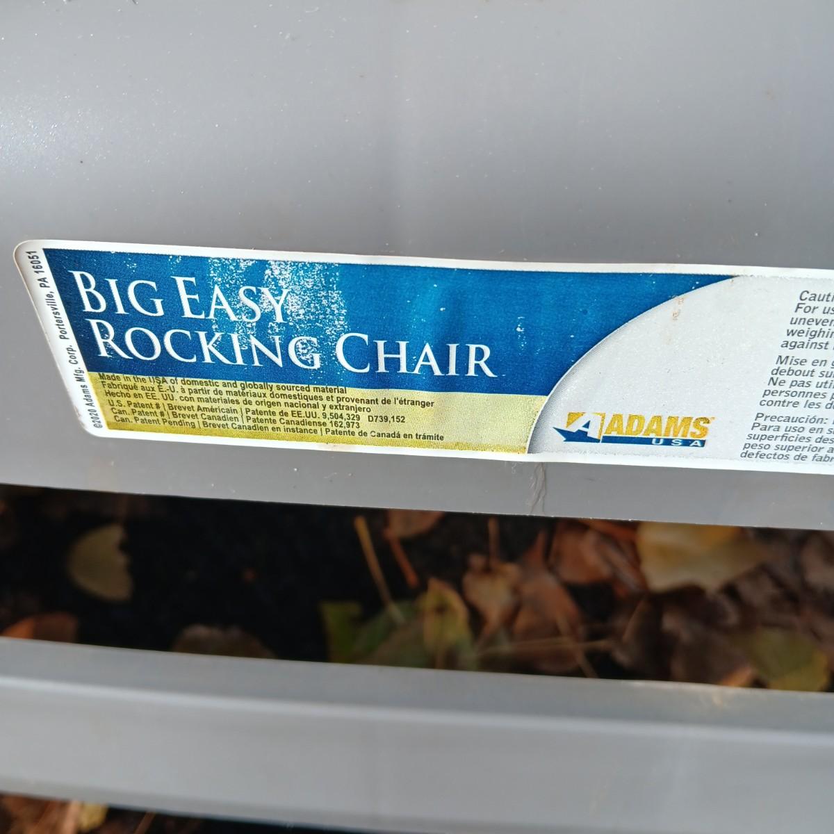 SMOKEY GLASS TOP PATIO TABLE AND TWO BIG EASY ROCKING CHAIRS