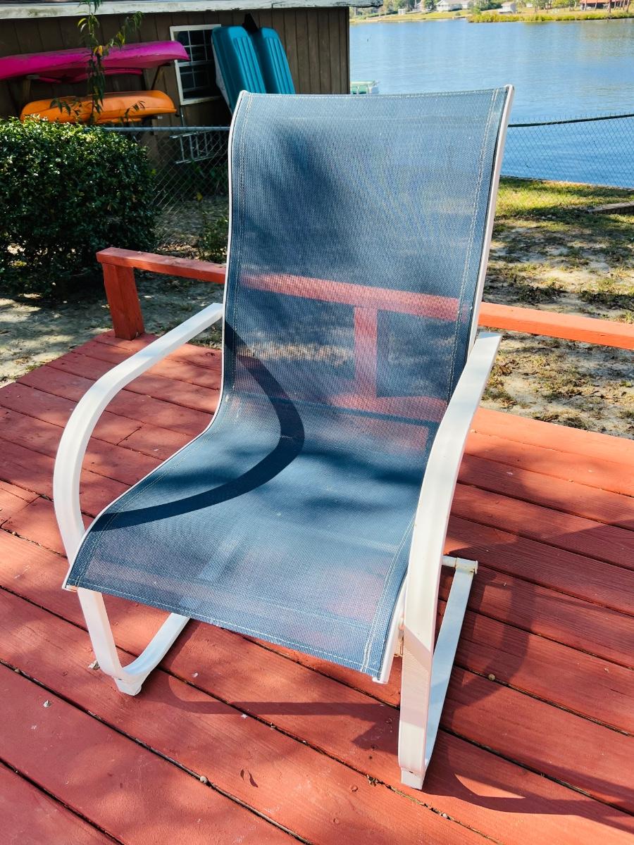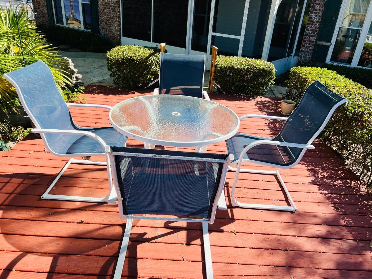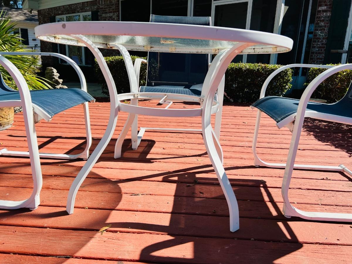 This set is in great shape! Table is a White base with a glass top. It does have a place for an umbrella. 4 rocking Chairs that are blue in color with white base. Table measures 28 inches tall and 42 inches round. Chairs measure 39 1/2 and 24 inches wide. Floor to seat measures 17 inches.