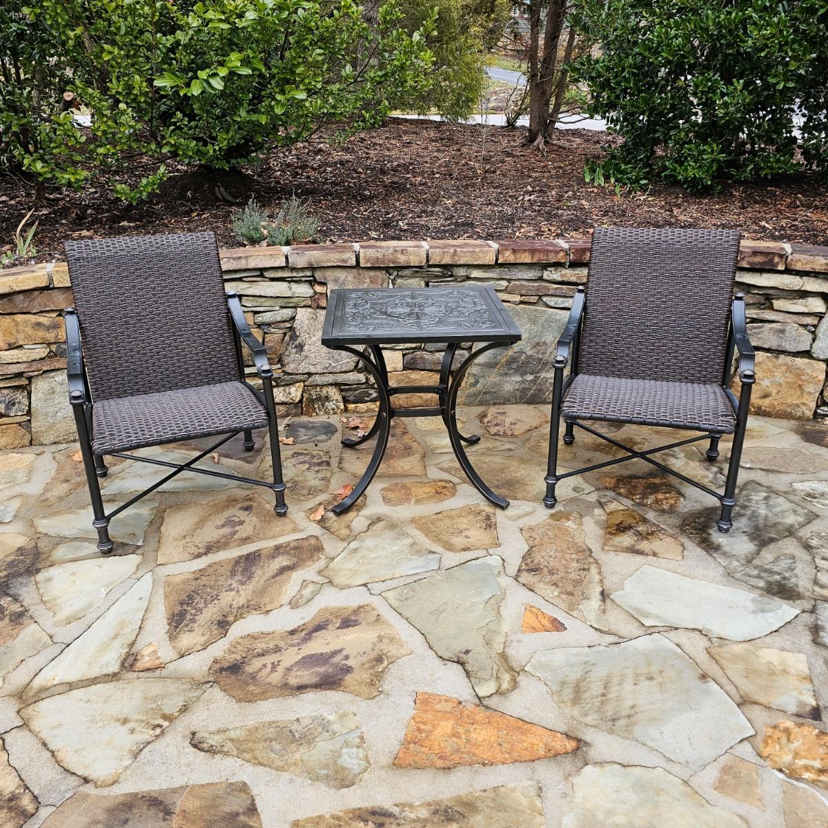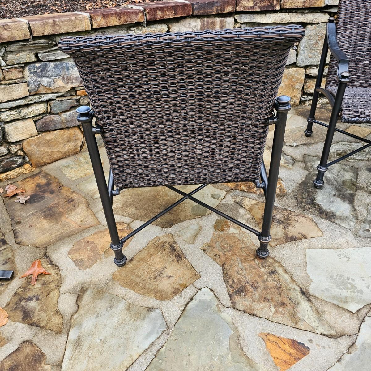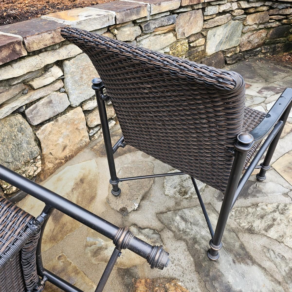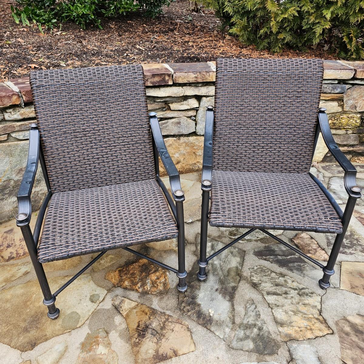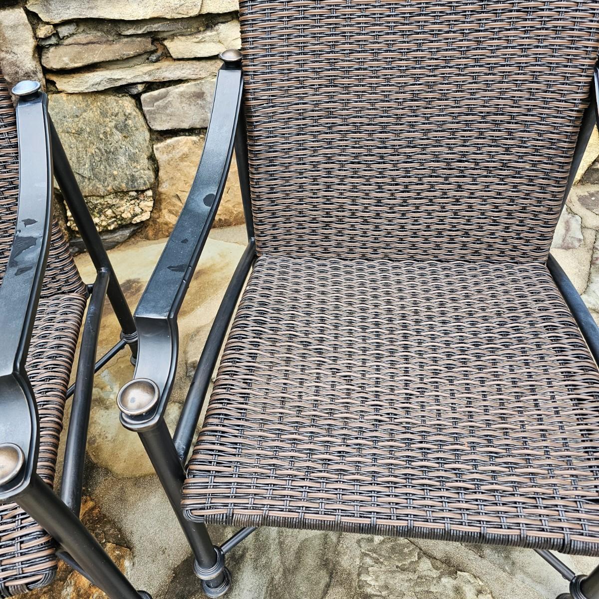 A pair of chairs and a table for outdoor use. Chairs have synthetic rattan backs and seats, metal and resin frames and arms. Chairs measure 25" x 30" x 36"H with a 16" seat height. Table has a decorated center piece and curved pedestal legs, measures 27" SQ x 28"H. Bottom of table has small crack on underside. See photos for details. Local pickup only.