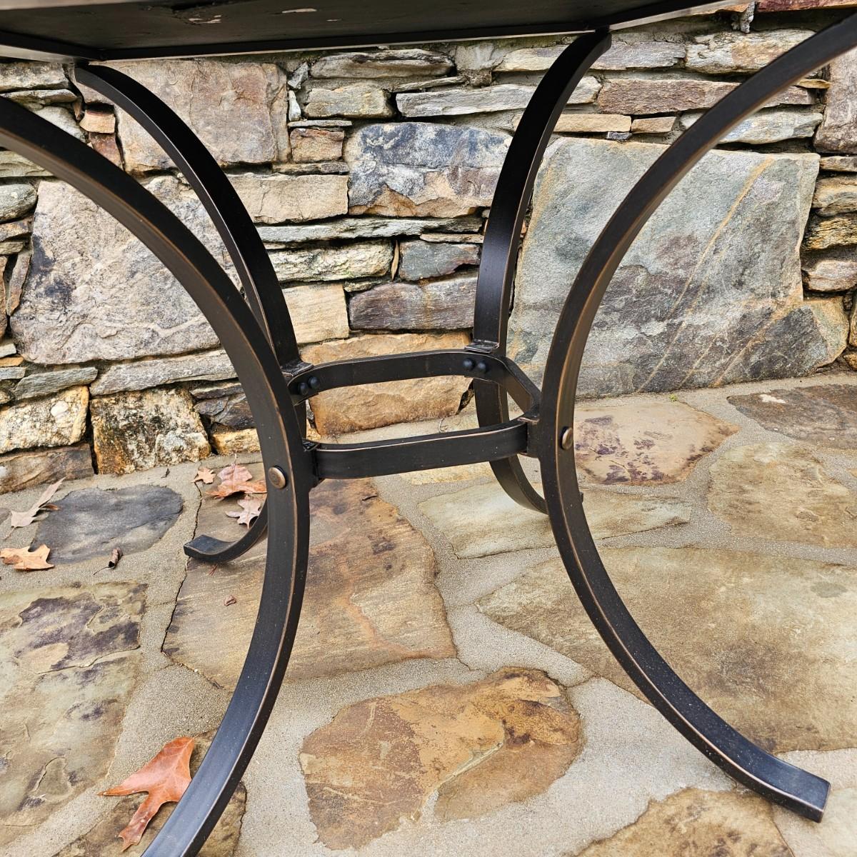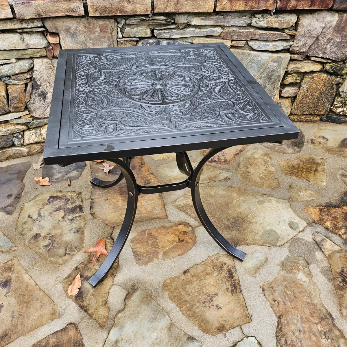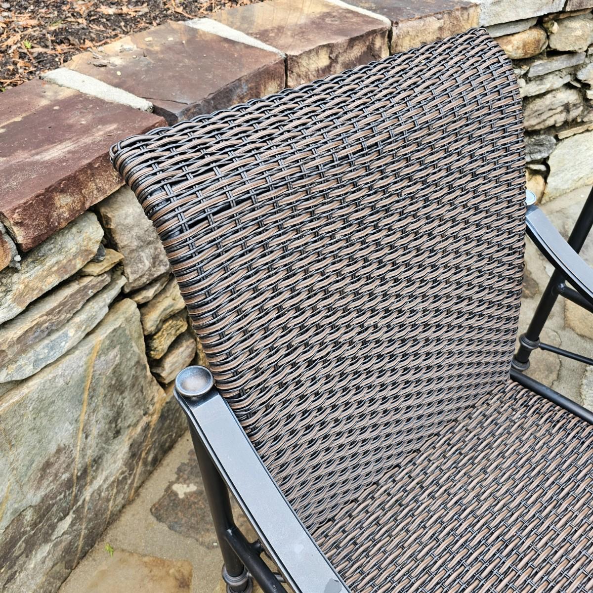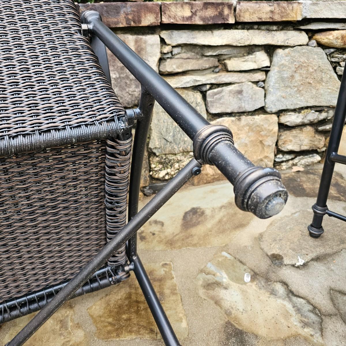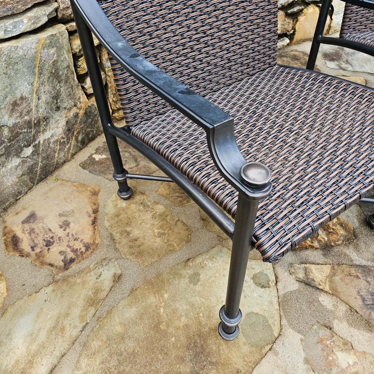A pair of chairs and a table for outdoor use. Chairs have synthetic rattan backs and seats, metal and resin frames and arms. Chairs measure 25" x 30" x 36"H with a 16" seat height. Table has a decorated center piece and curved pedestal legs, measures 27" SQ x 28"H. Bottom of table has small crack on underside. See photos for details. Local pickup only.