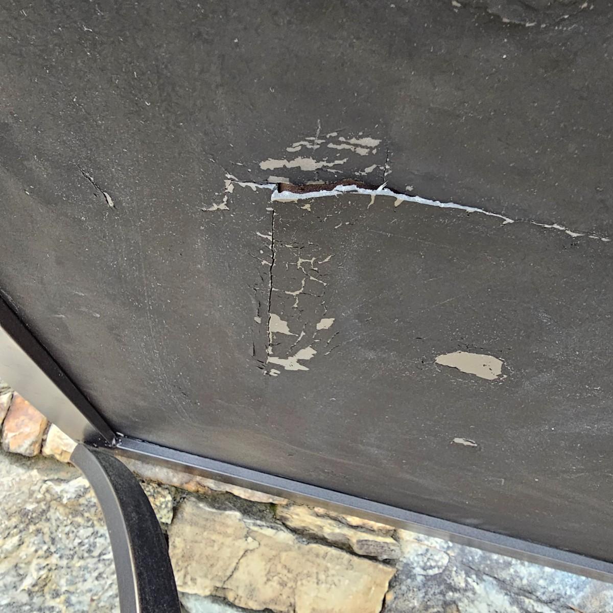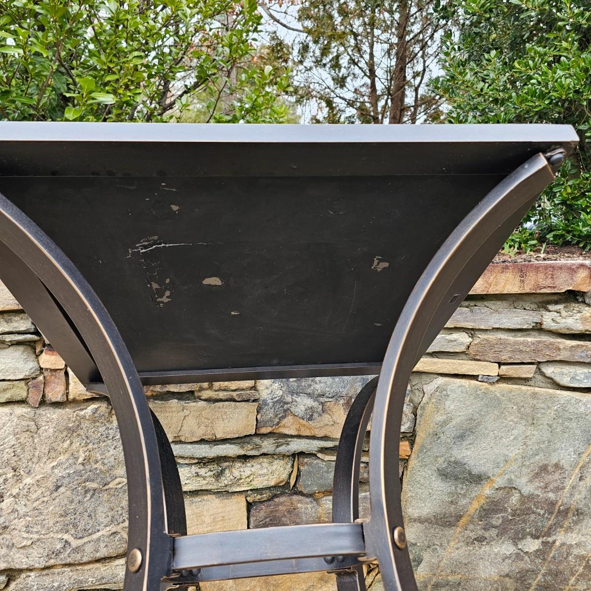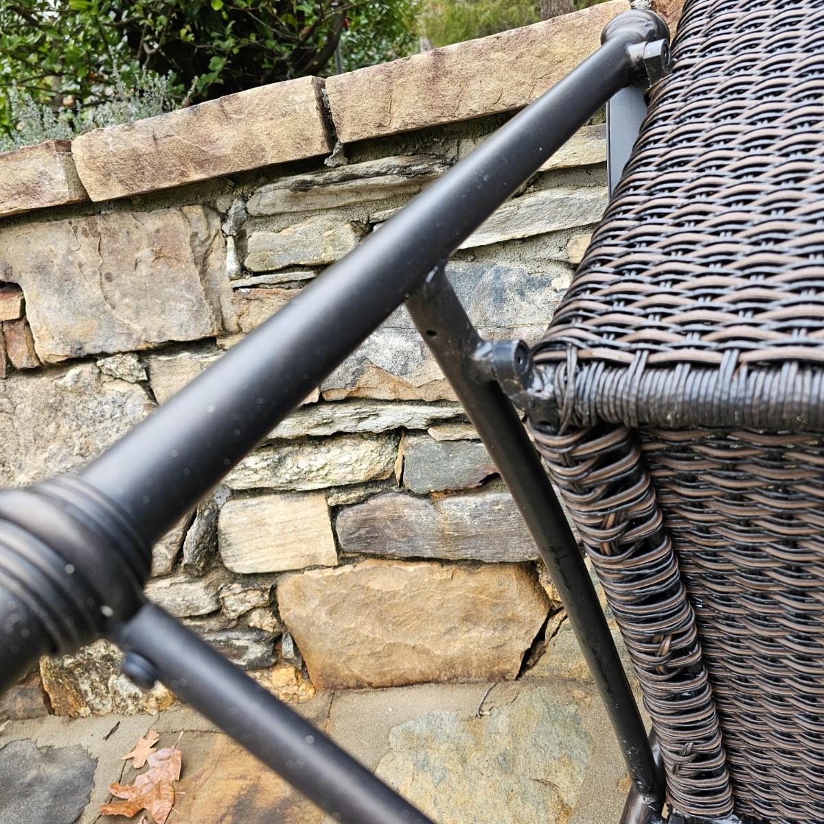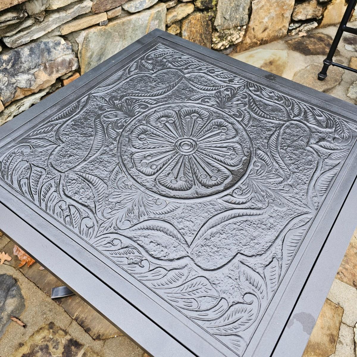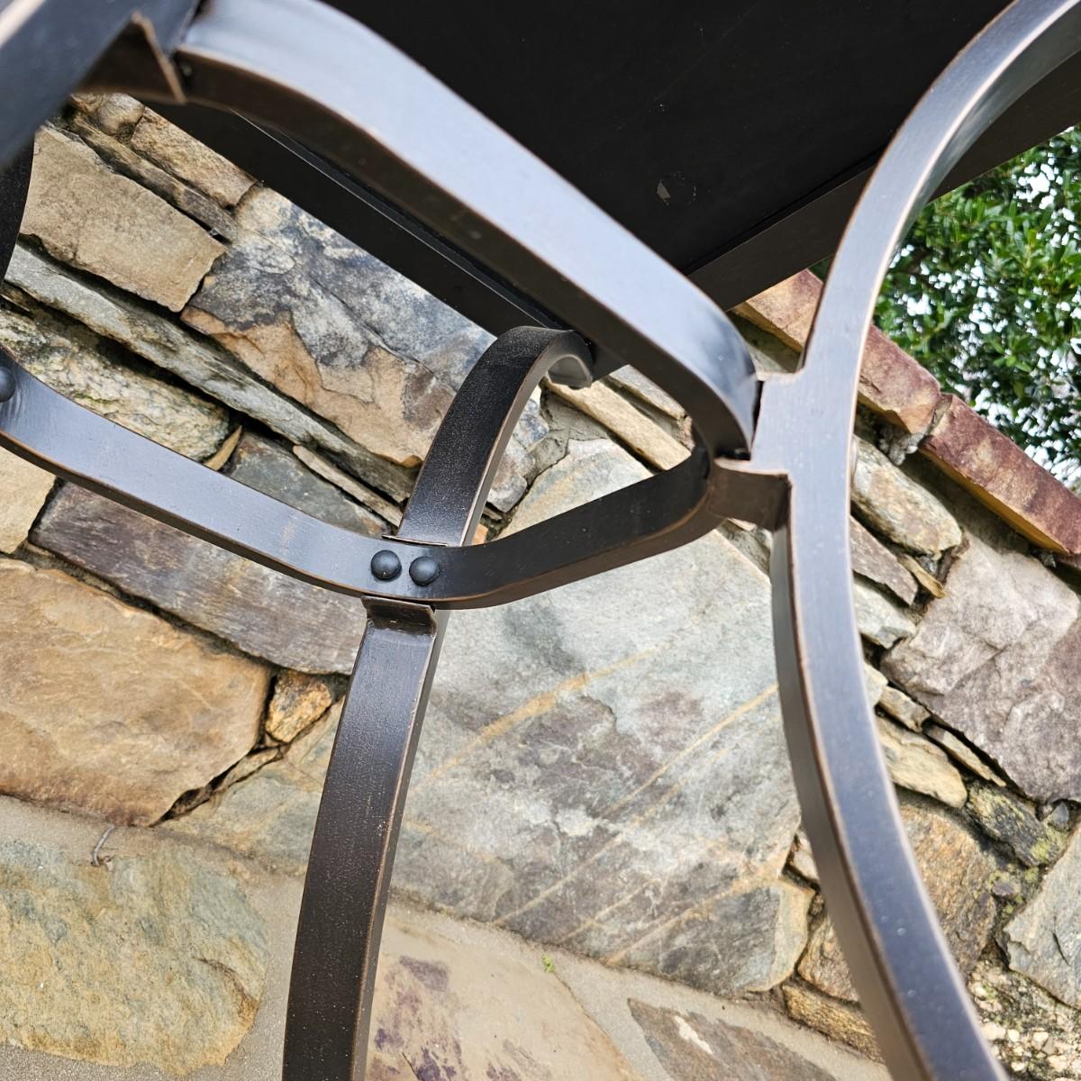A pair of chairs and a table for outdoor use. Chairs have synthetic rattan backs and seats, metal and resin frames and arms. Chairs measure 25" x 30" x 36"H with a 16" seat height. Table has a decorated center piece and curved pedestal legs, measures 27" SQ x 28"H. Bottom of table has small crack on underside. See photos for details. Local pickup only.