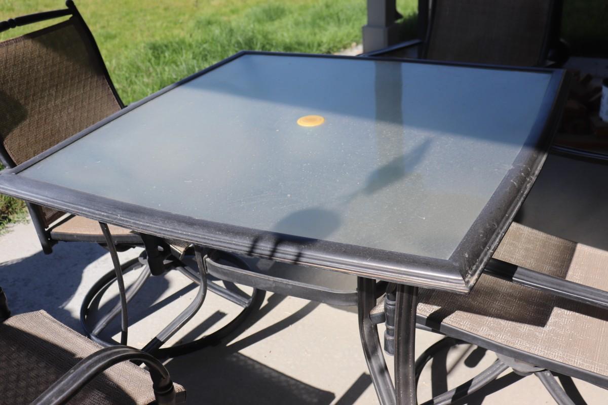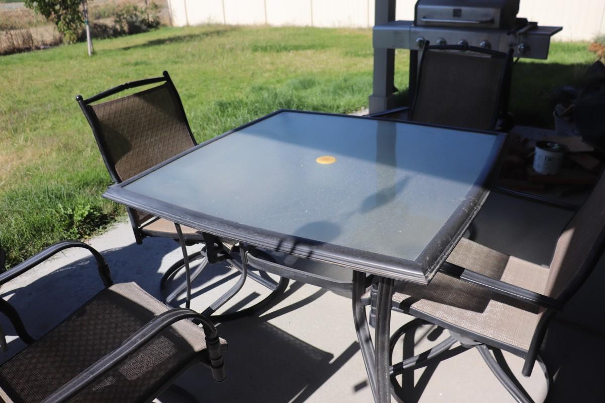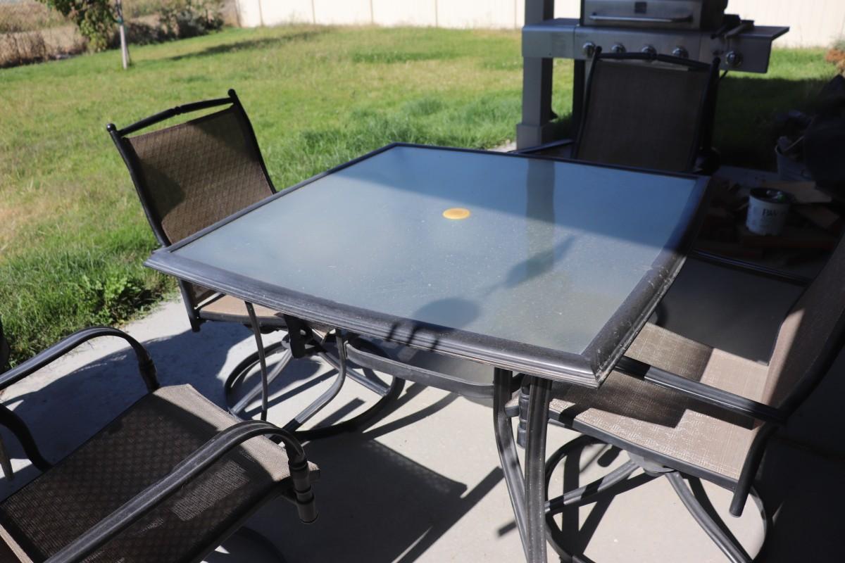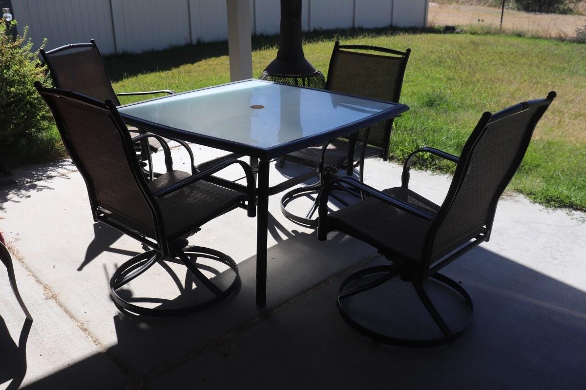 A lovely outdoor table set complete with four rocking chairs, ideal for enjoying meals or relaxation in your backyard or patio.