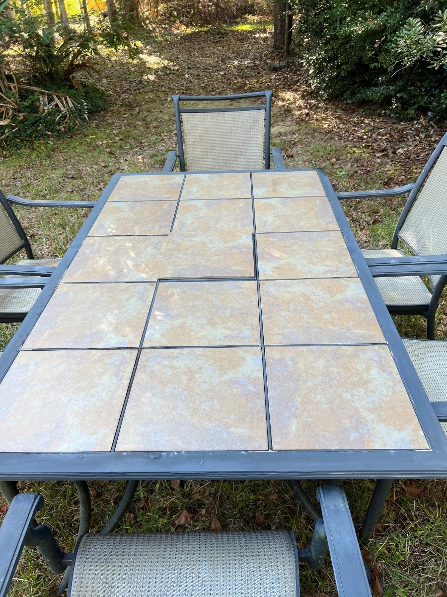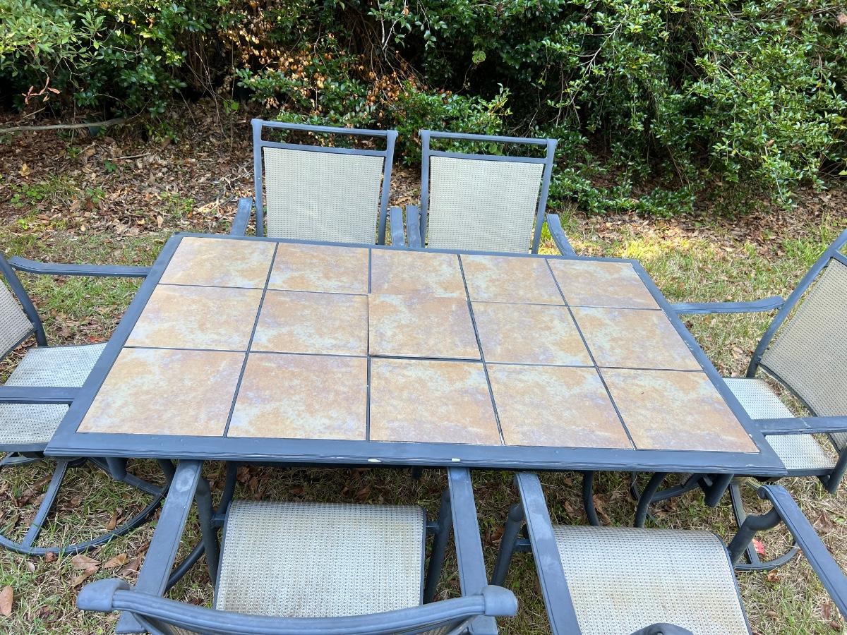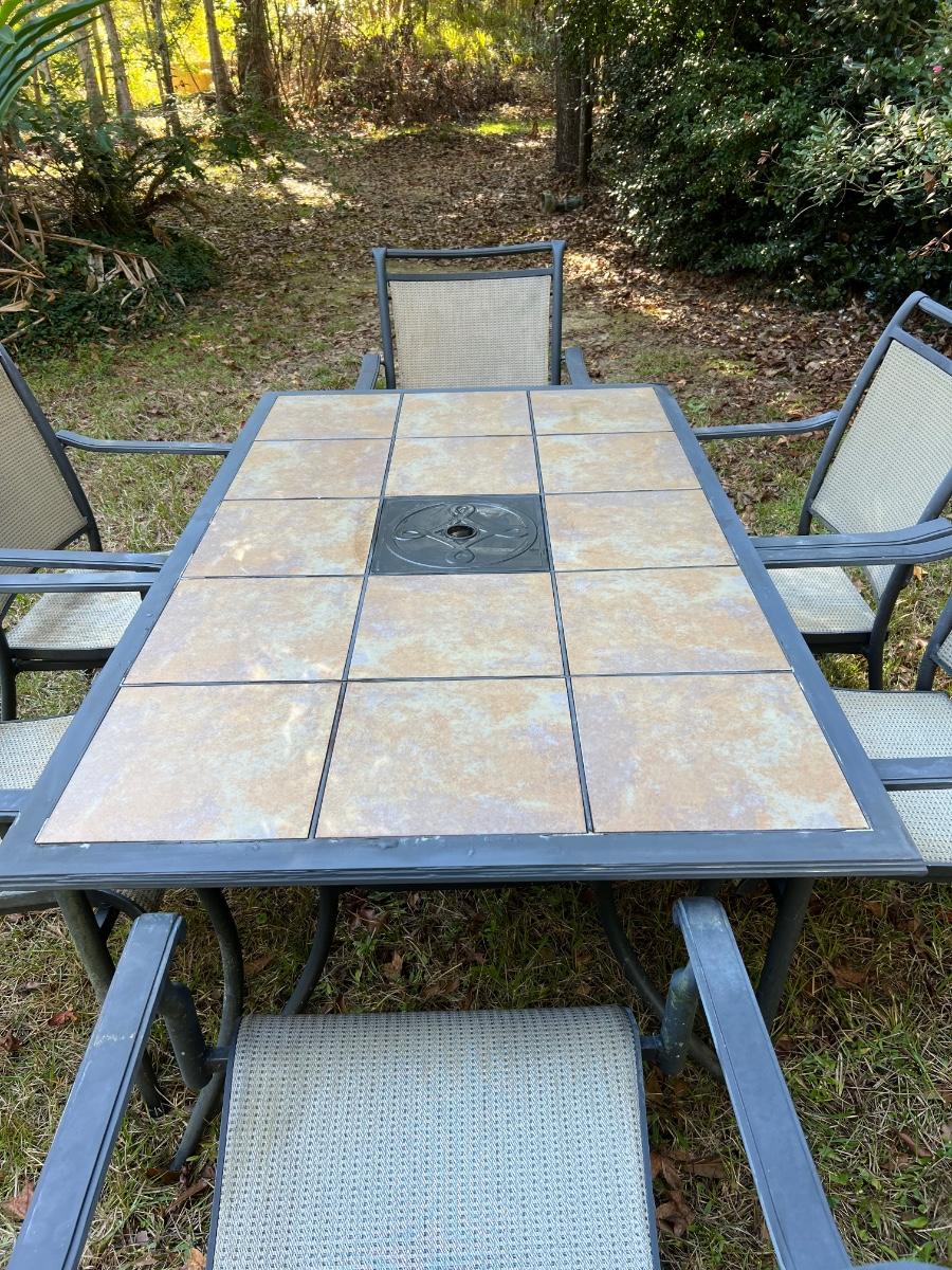 Outdoor tile table with 6 chairs. Tiles can be remove from table during travel. Center of the table can be covered or has an opening for an umbrella (see pictures). Chairs are a heavy plastic not metal. Tiles are 12” x 12”, table measures 64 inches long and how 39 1/2 inches wide.