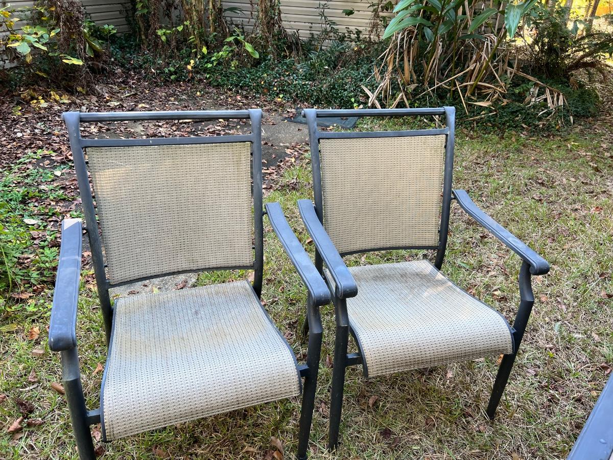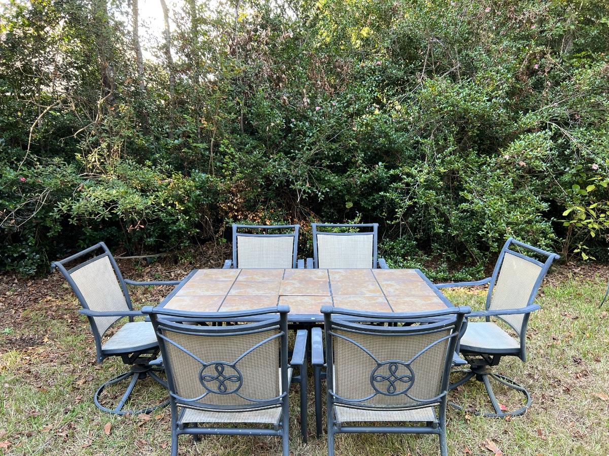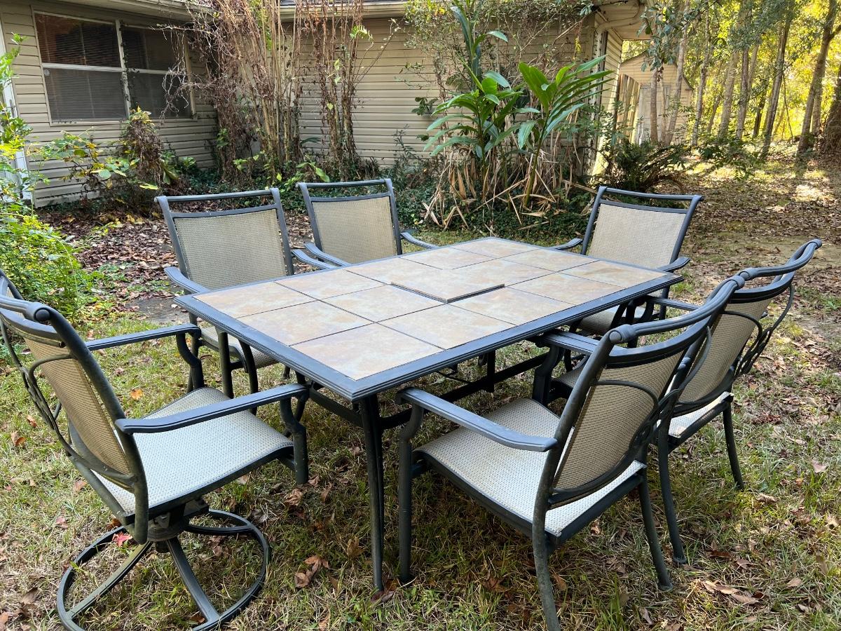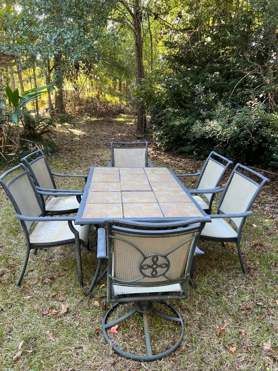 Outdoor tile table with 6 chairs. Tiles can be remove from table during travel. Center of the table can be covered or has an opening for an umbrella (see pictures). Chairs are a heavy plastic not metal. Tiles are 12” x 12”, table measures 64 inches long and how 39 1/2 inches wide.
