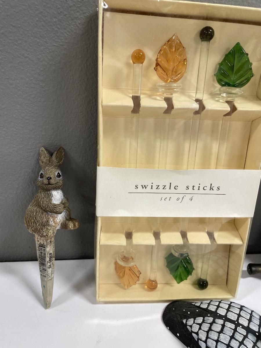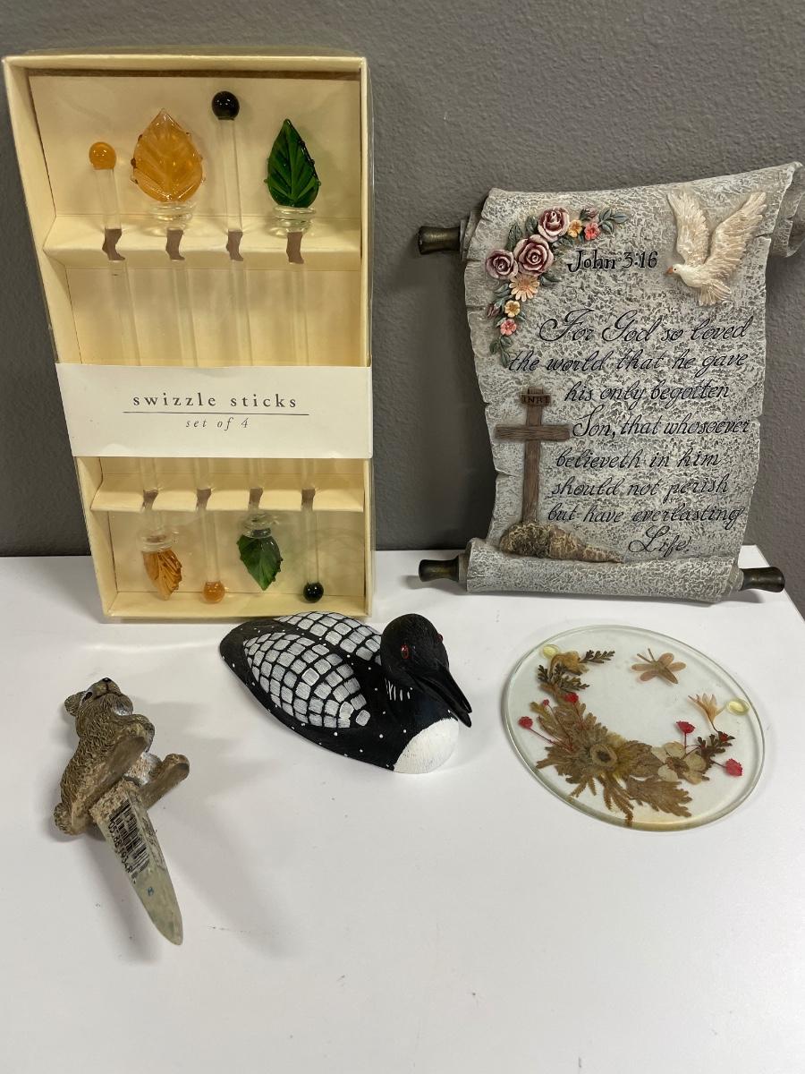Loon, rabbit planter decor, pressed leaf coaster, swizzle sticks and John 3:16