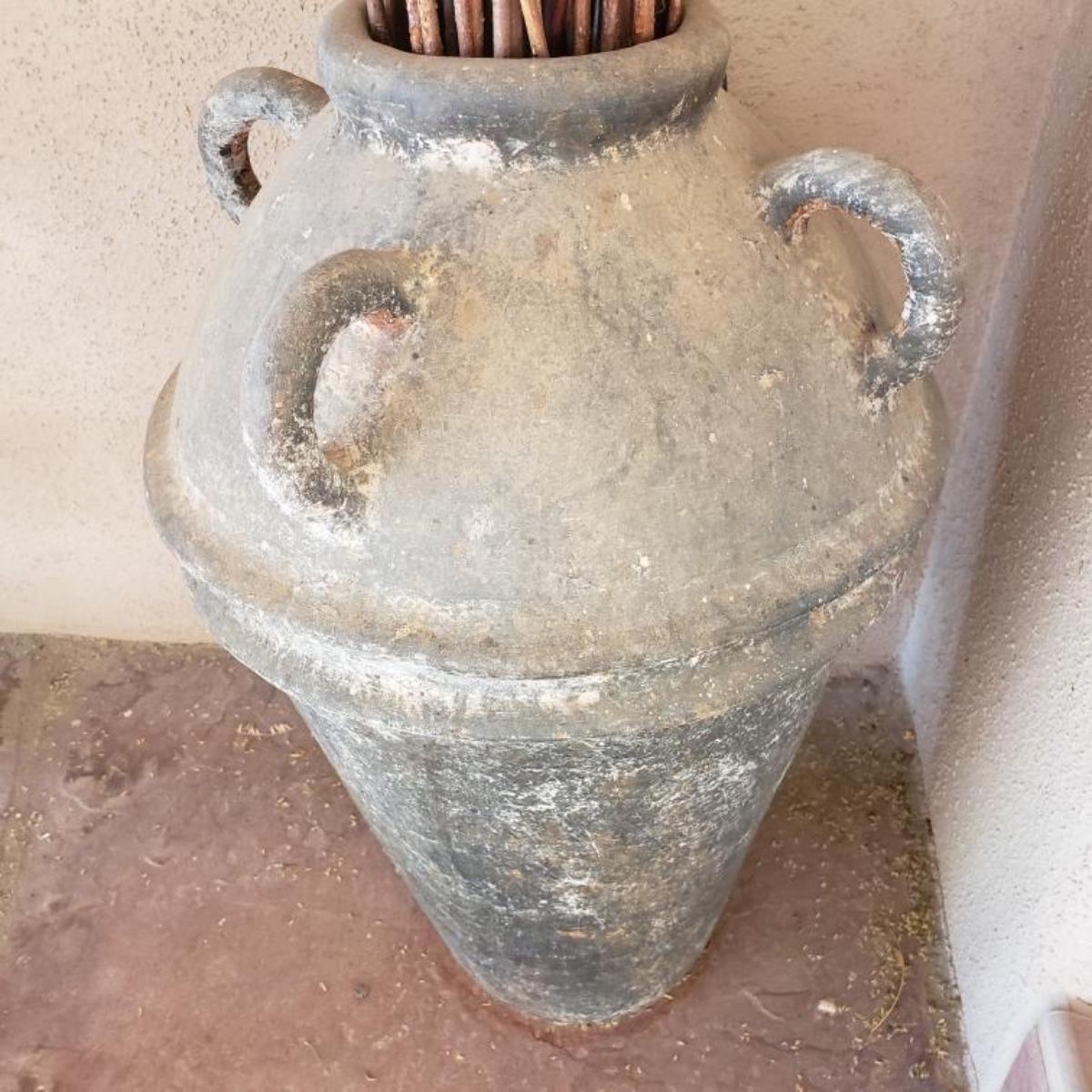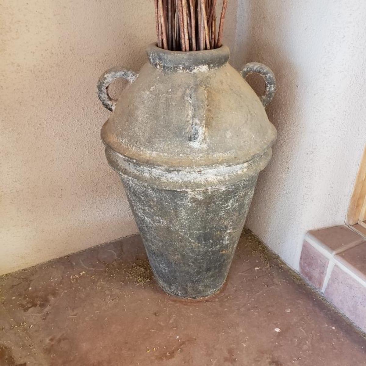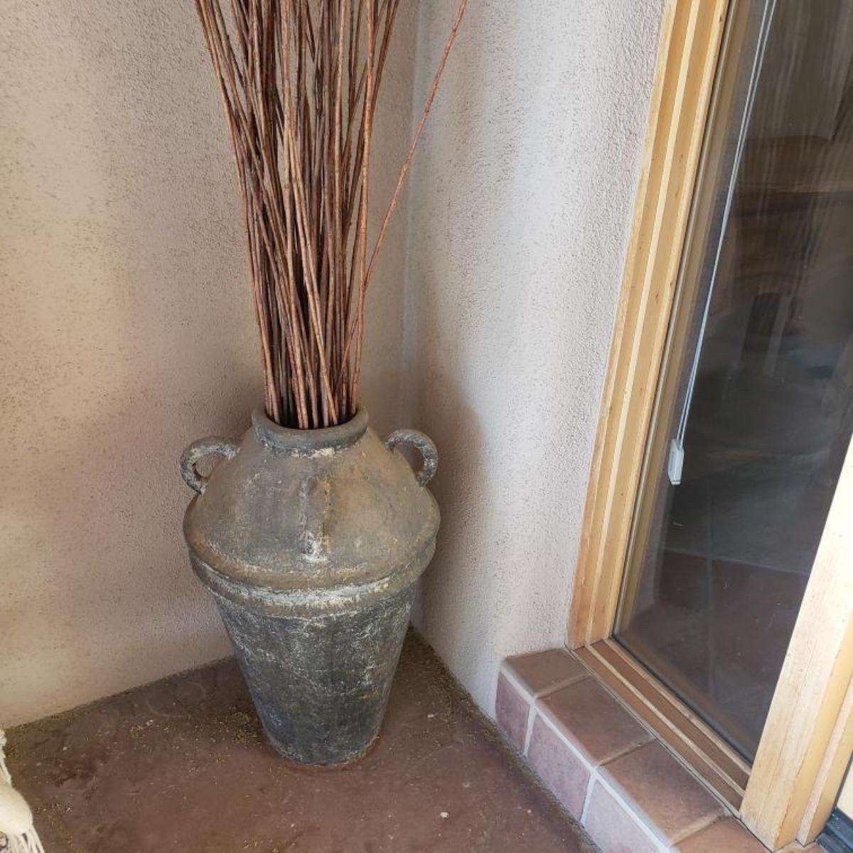24” Tall x 14” at its widest point. Painted Ceramic, includes dried plants. Very good condition
