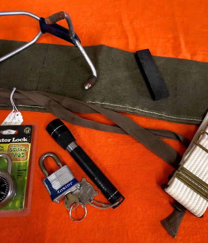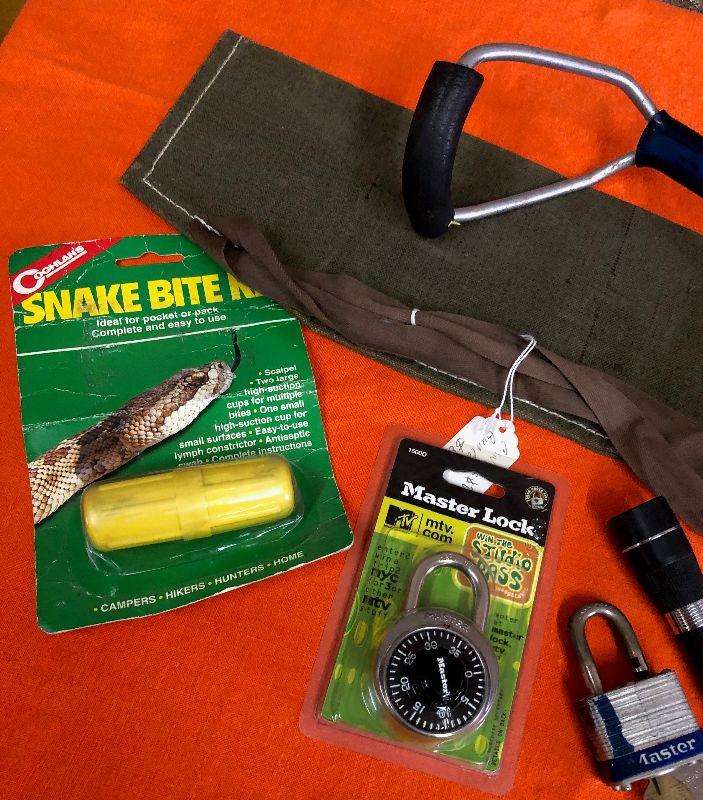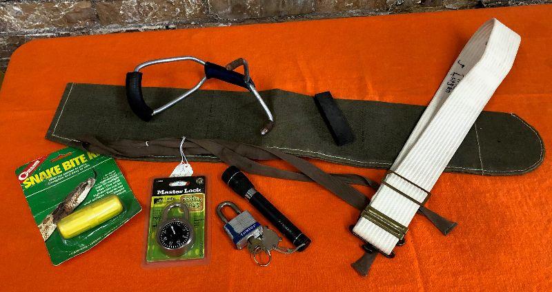 Miscellaneous outdoors lot..New Combination Lock..Snake Bite Kit..Gun Sheath..Flashlight...as shown...