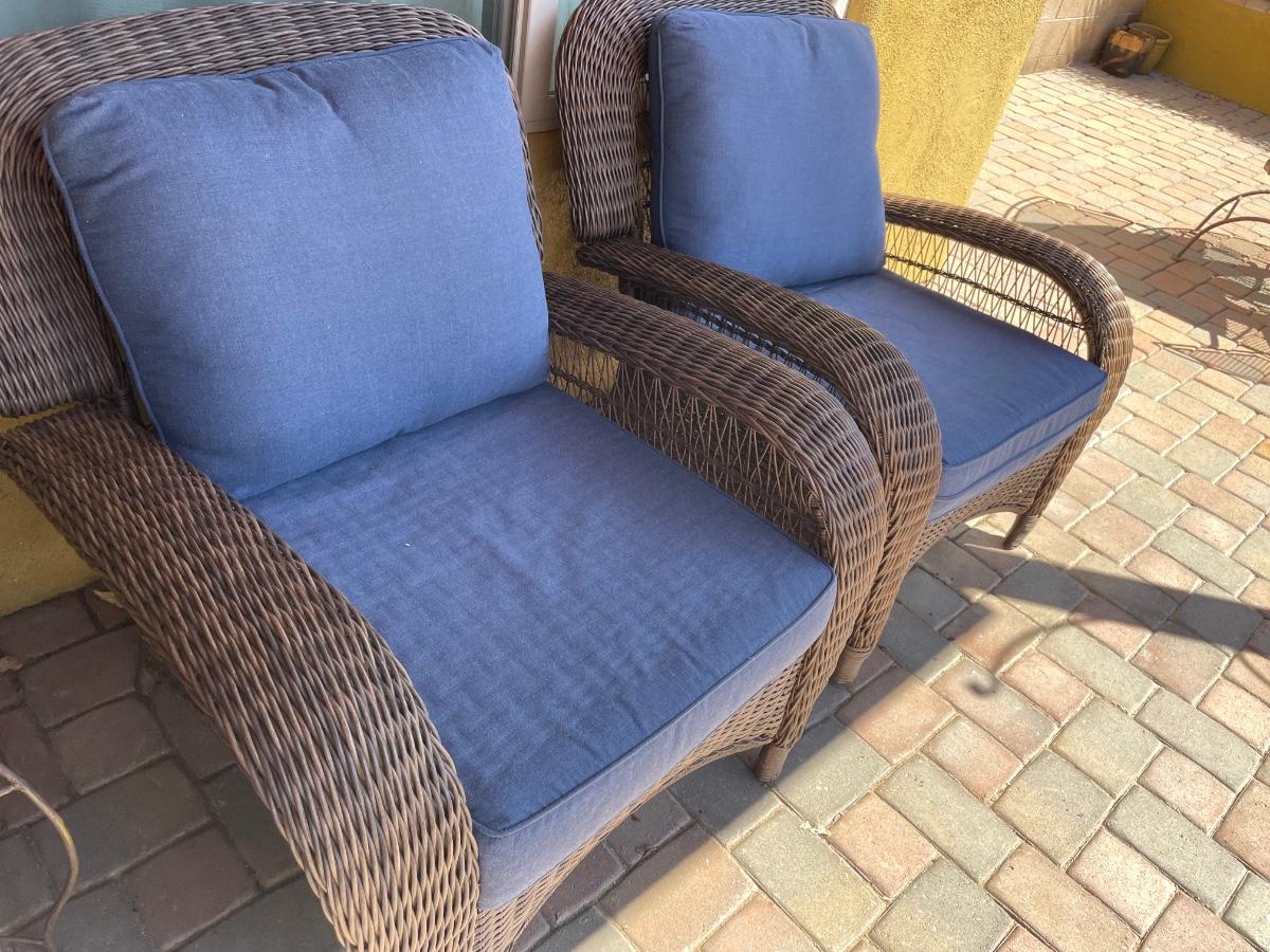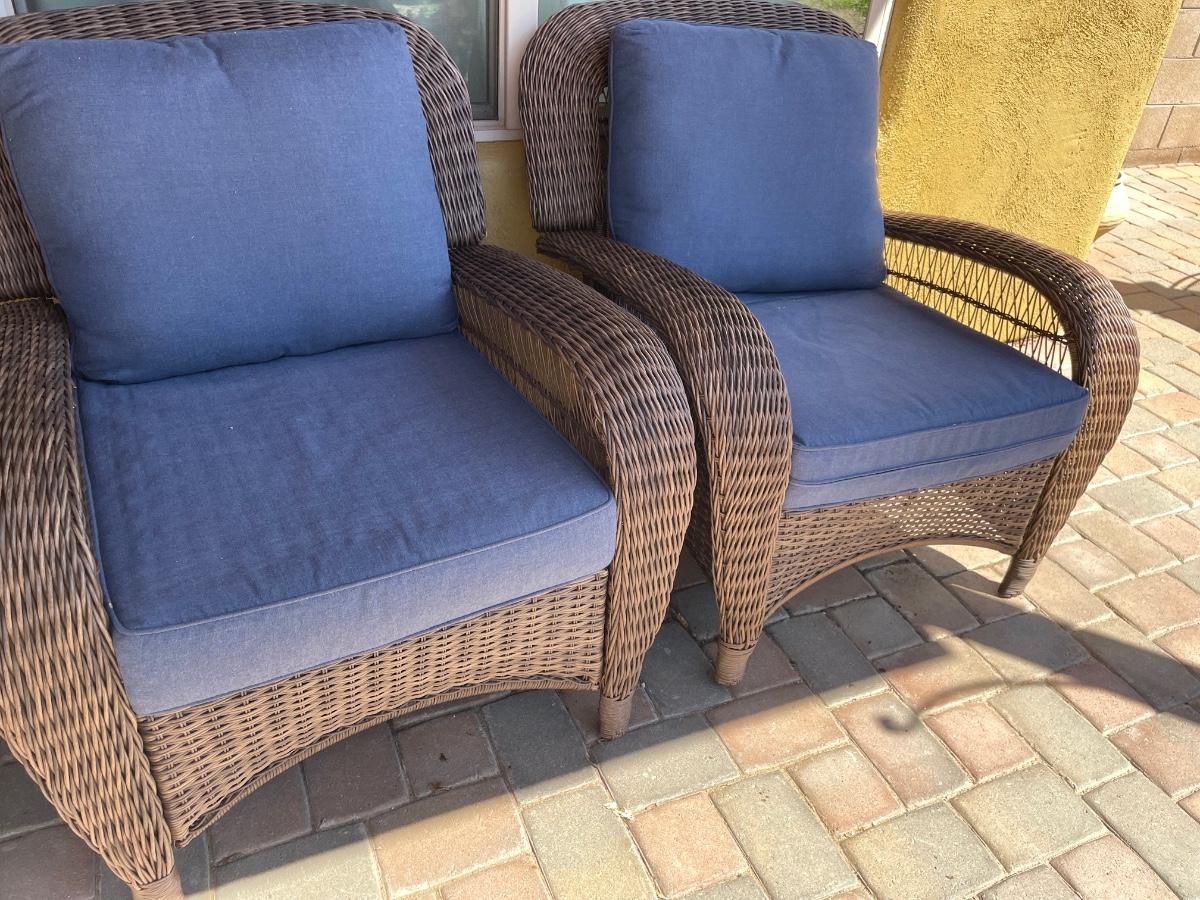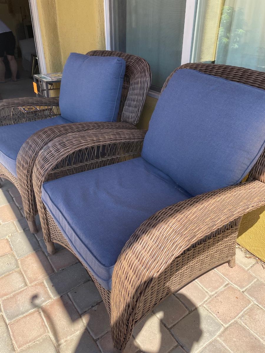 Two outdoor whicker chairs in great condition. Includes blue cushions and pillows. No stains or rips on cushions. Both chairs are oversized. (36inX36inX36in)