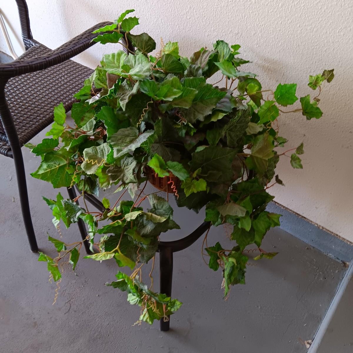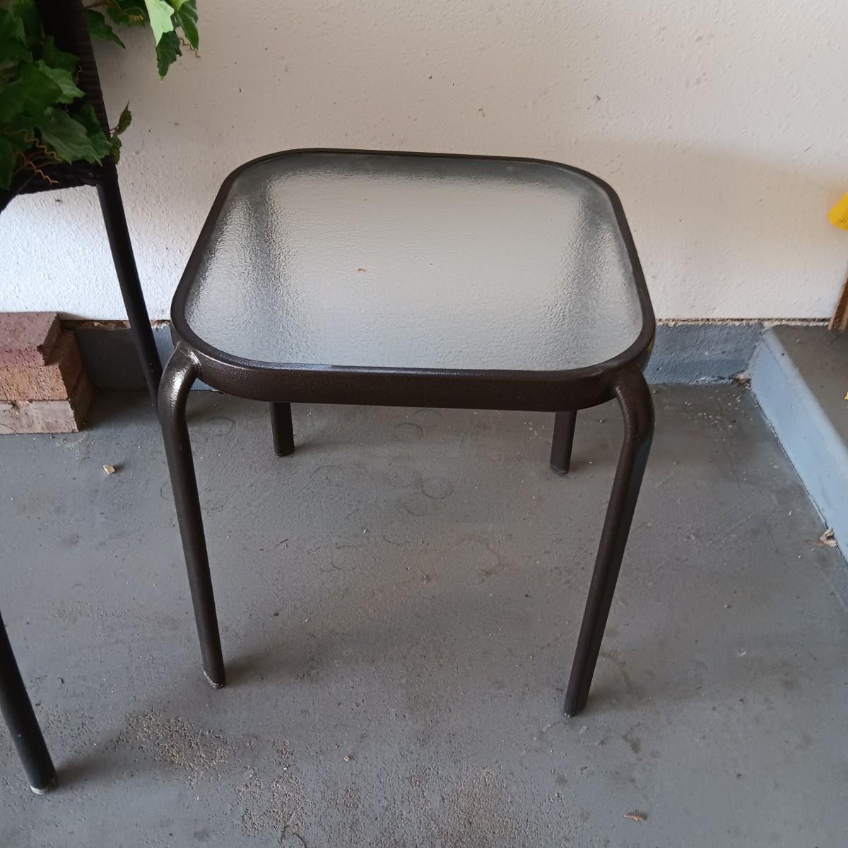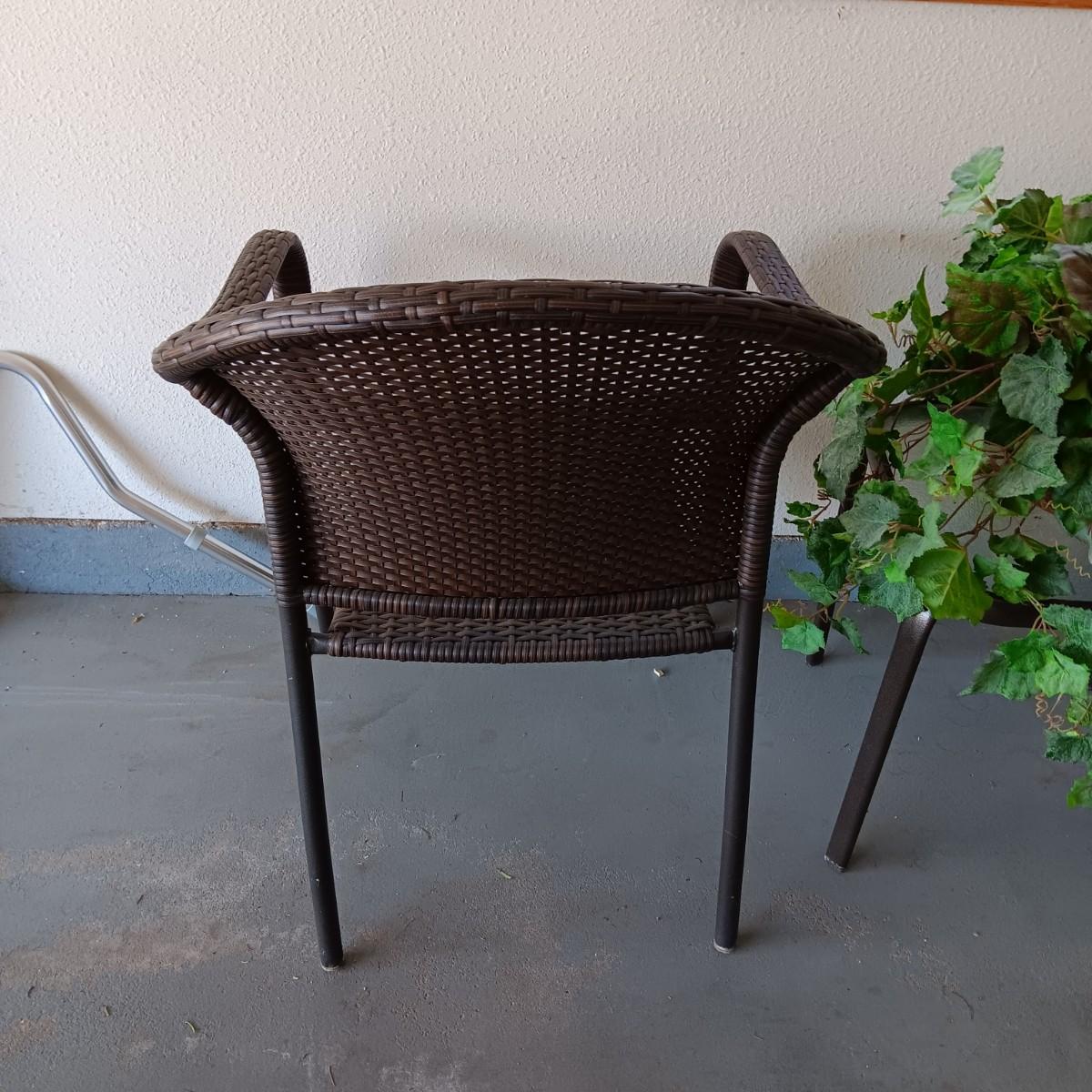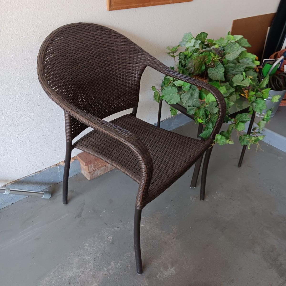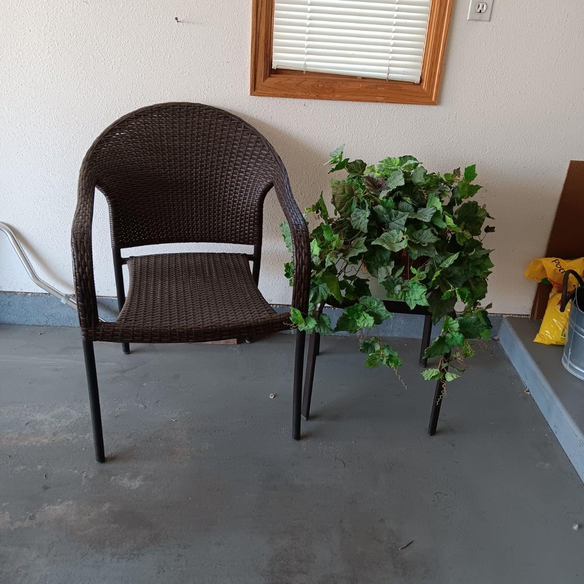OUTDOOR WICKER CHAIR, SIDE TABLE AND FAUX PLANT
