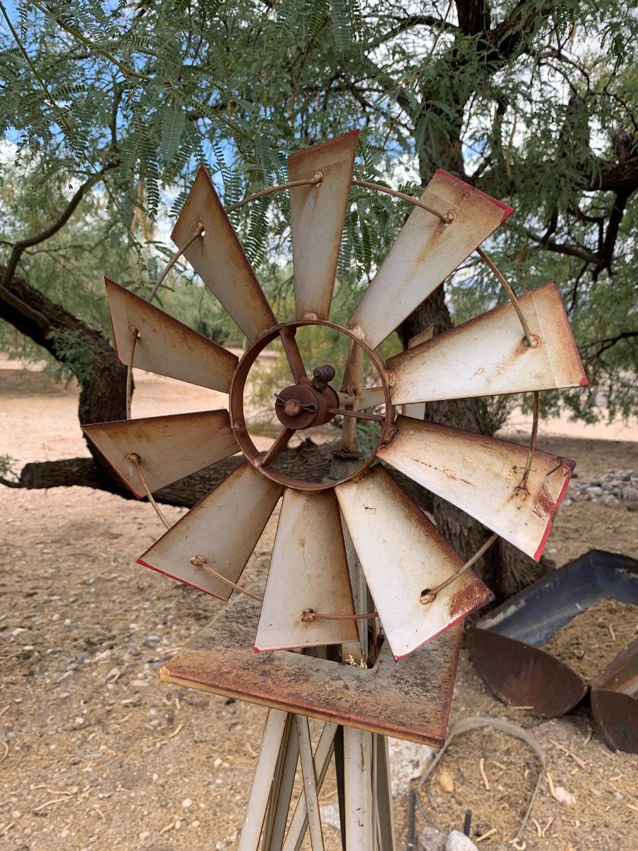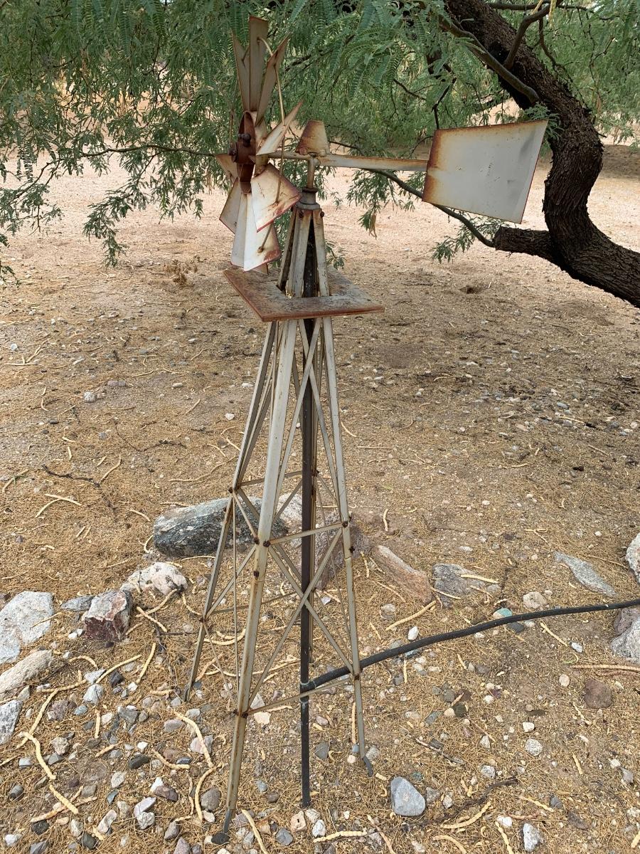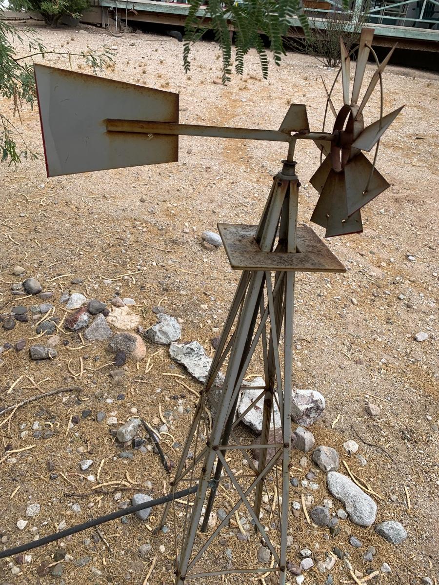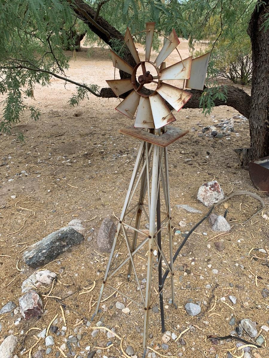 Metal outdoor windmill, 52 inches in height. Grasons is not responsible for removal from posts. Please bring tools to remove out of the ground if you bid on this item.