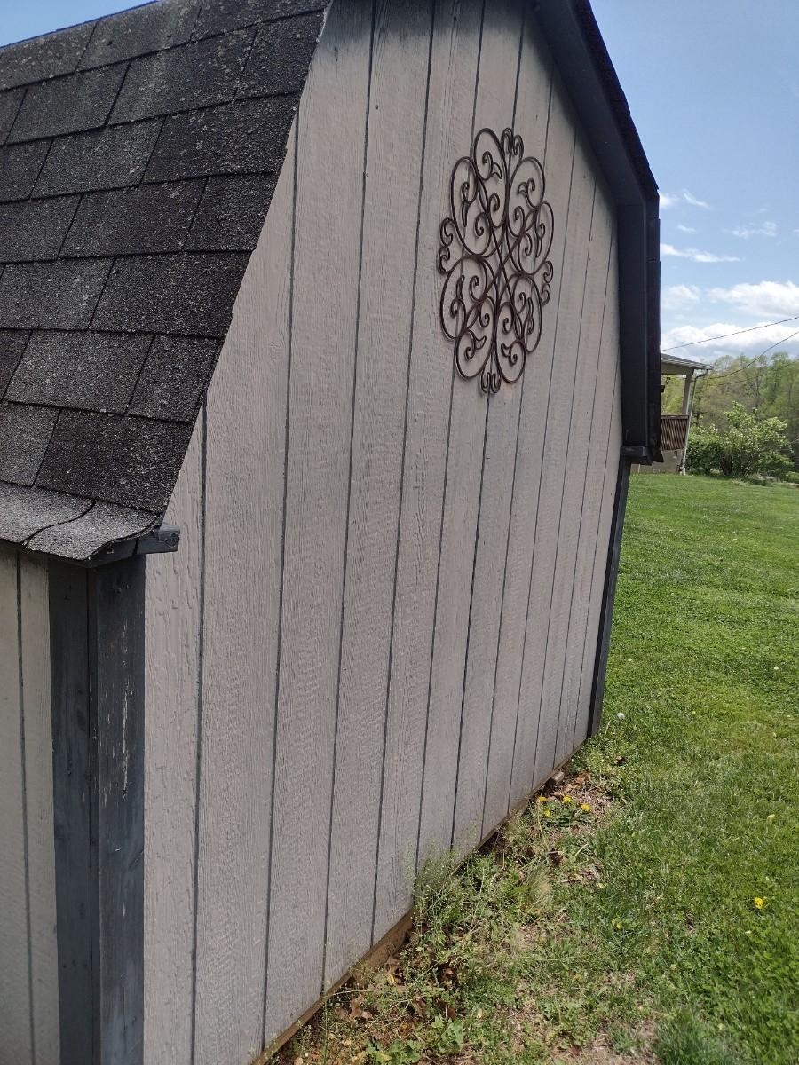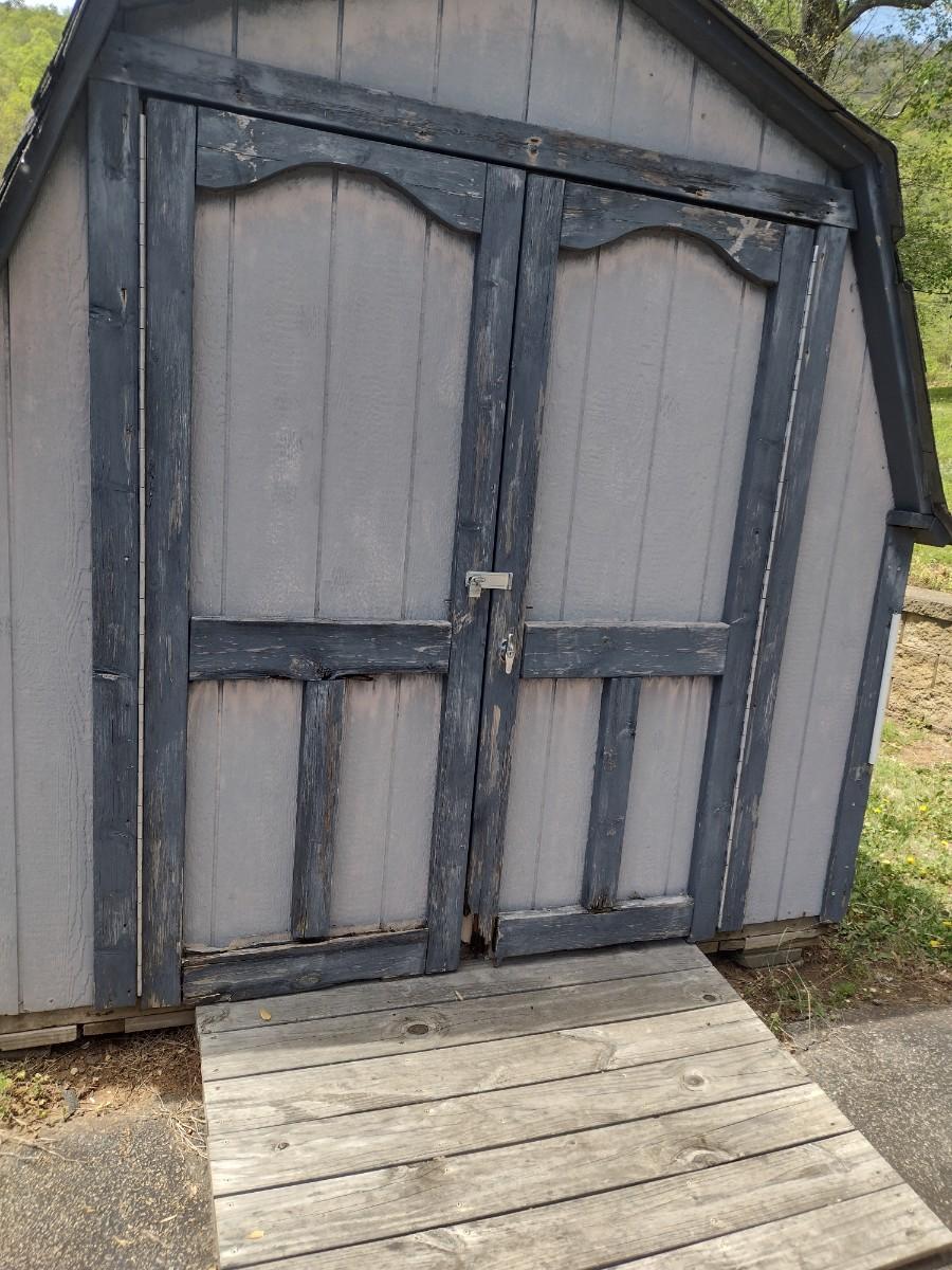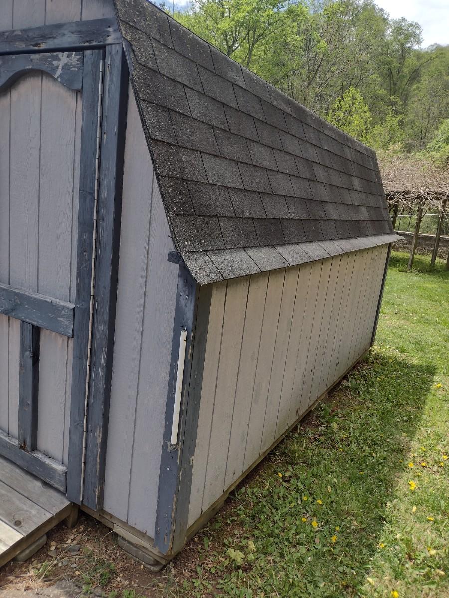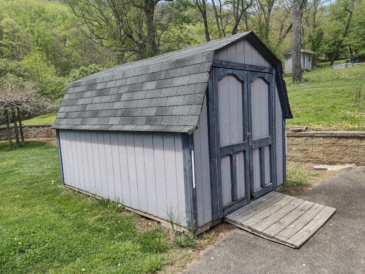 Outdoor Wood Frame Storage Shed with Shingle Roof 12'x8'. Must have own means of transporting item. Easy access to the shed with roll back. Shed sits at edge of wide driveway.