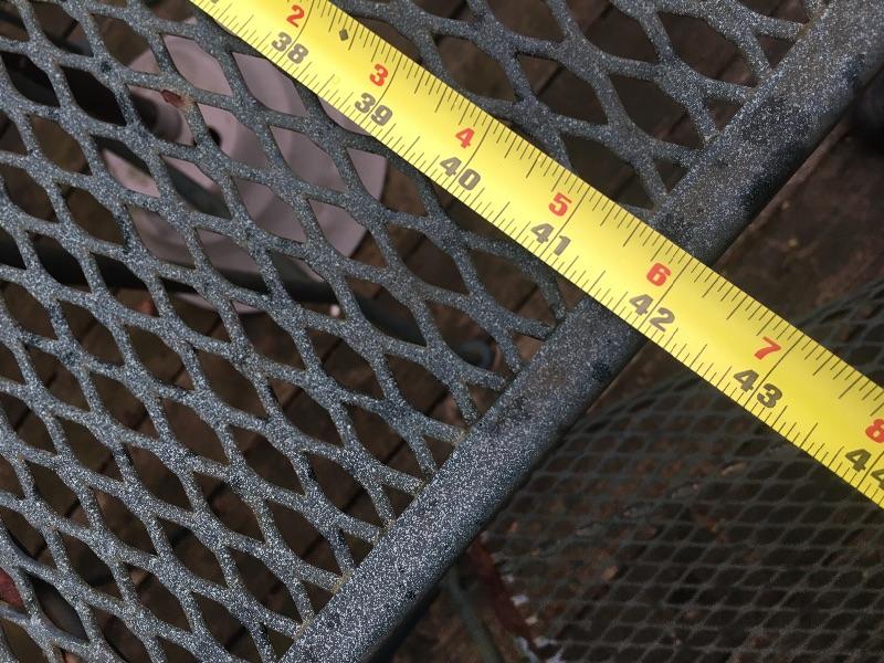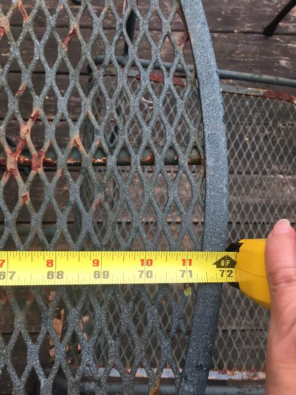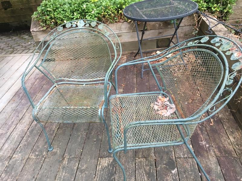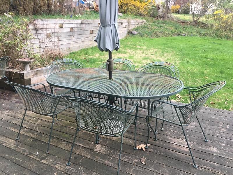 8 chairs, table, umbrella and base. Needs a hardwire brushing and painting or use it distressed