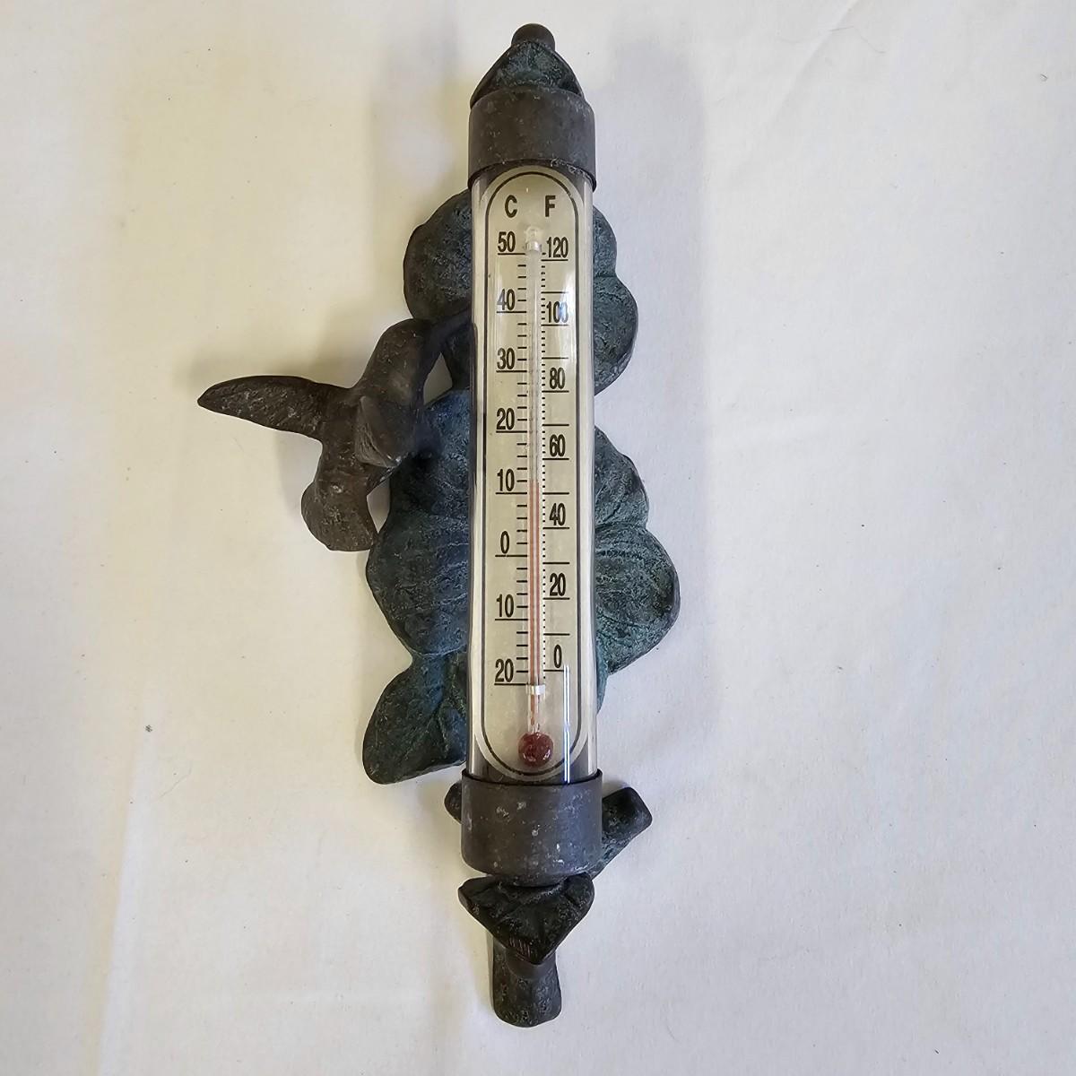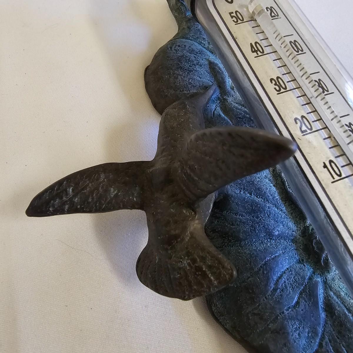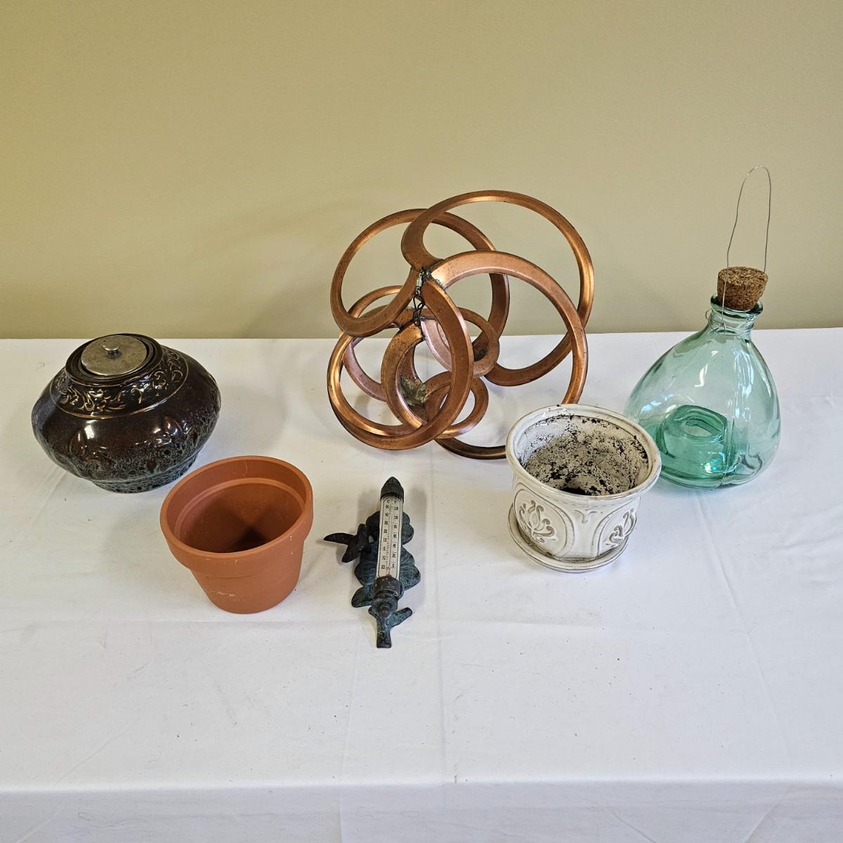 Some unique pieces of decor for your patio or yard. One swirling two piece wind spinner, 14" D x 14"H. A green glass insect trap, 7"D x 10"H. A couple ceramic pots, one 5.5"D terra cotta pot, and a decorative bronze thermometer with a hummingbird theme, 8"H. See photos for details. Shipping available.