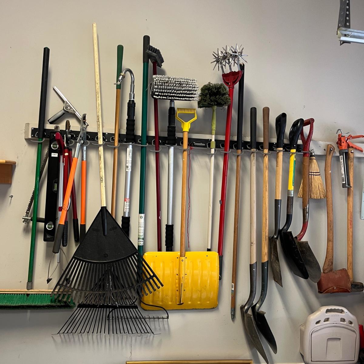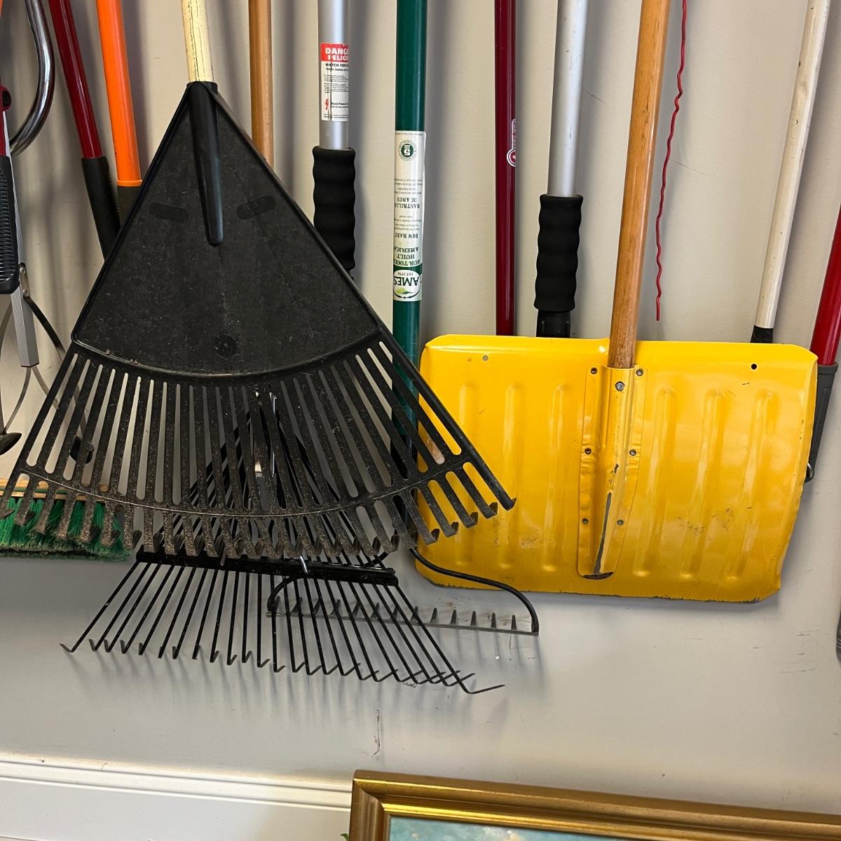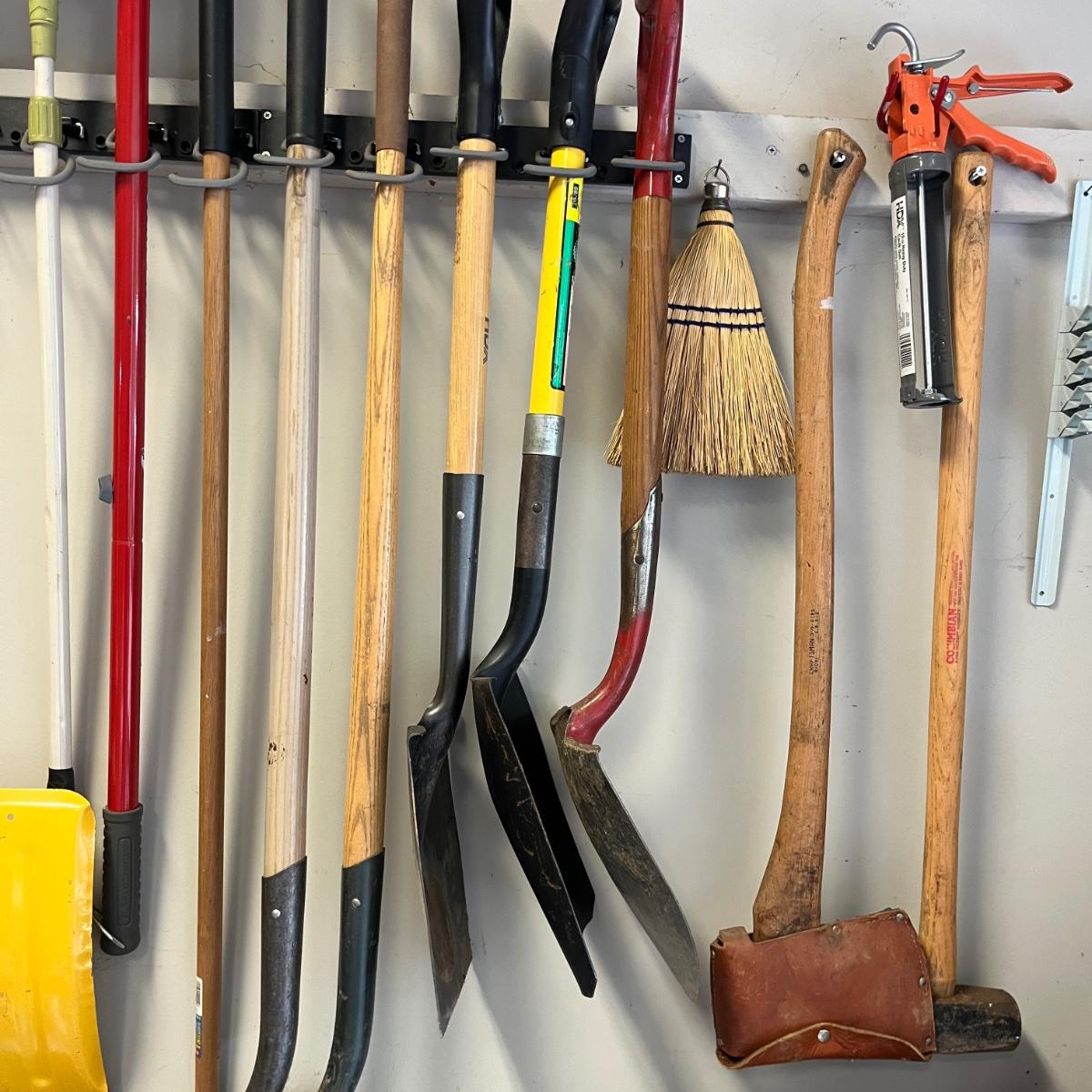 Lot contains a selection of outdoor yard tools including heavy rake, two leaf rakes, five shovels, push broom, two loppers, saw, level, snow shovel, gutter cleaner, sledge hammer, axe and more. Only the tools are included not rack or water hose holder.