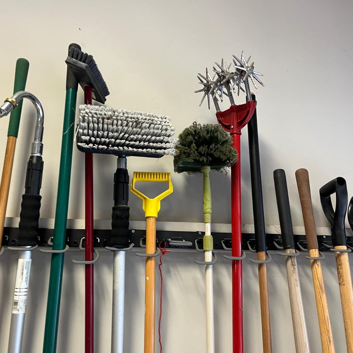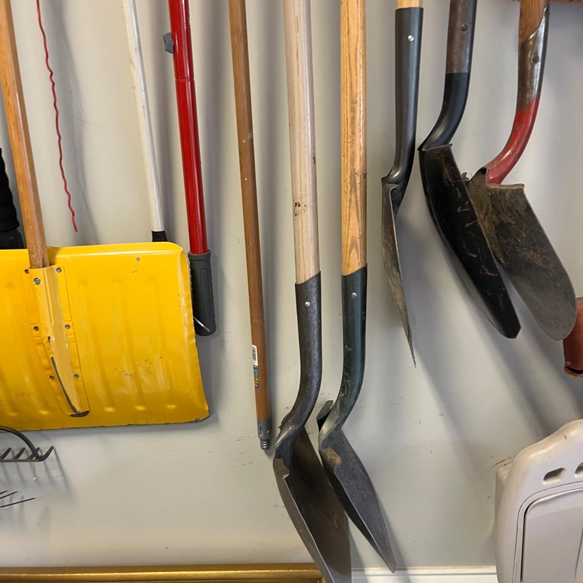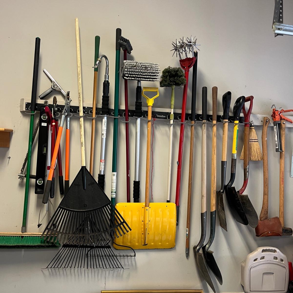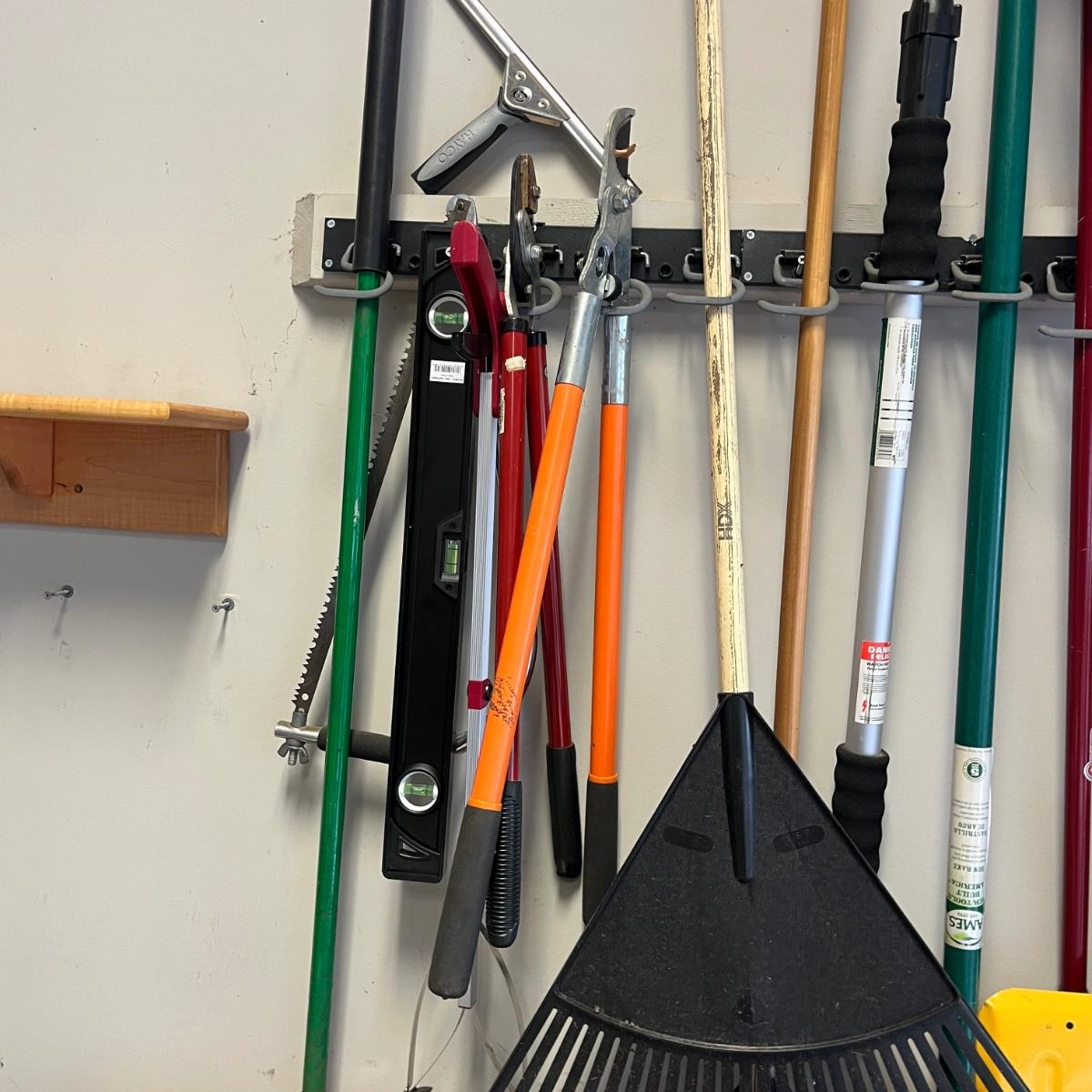 Lot contains a selection of outdoor yard tools including heavy rake, two leaf rakes, five shovels, push broom, two loppers, saw, level, snow shovel, gutter cleaner, sledge hammer, axe and more. Only the tools are included not rack or water hose holder.