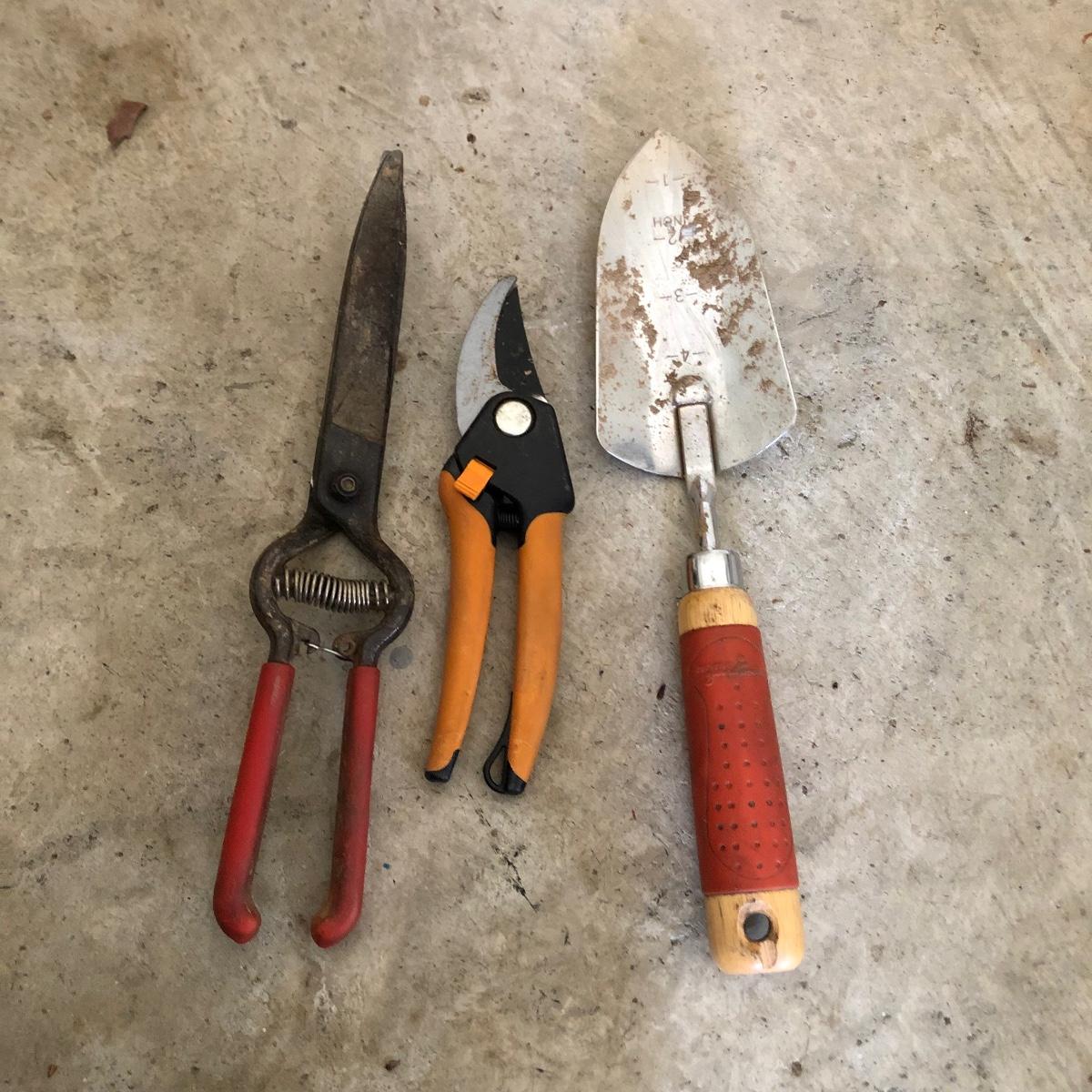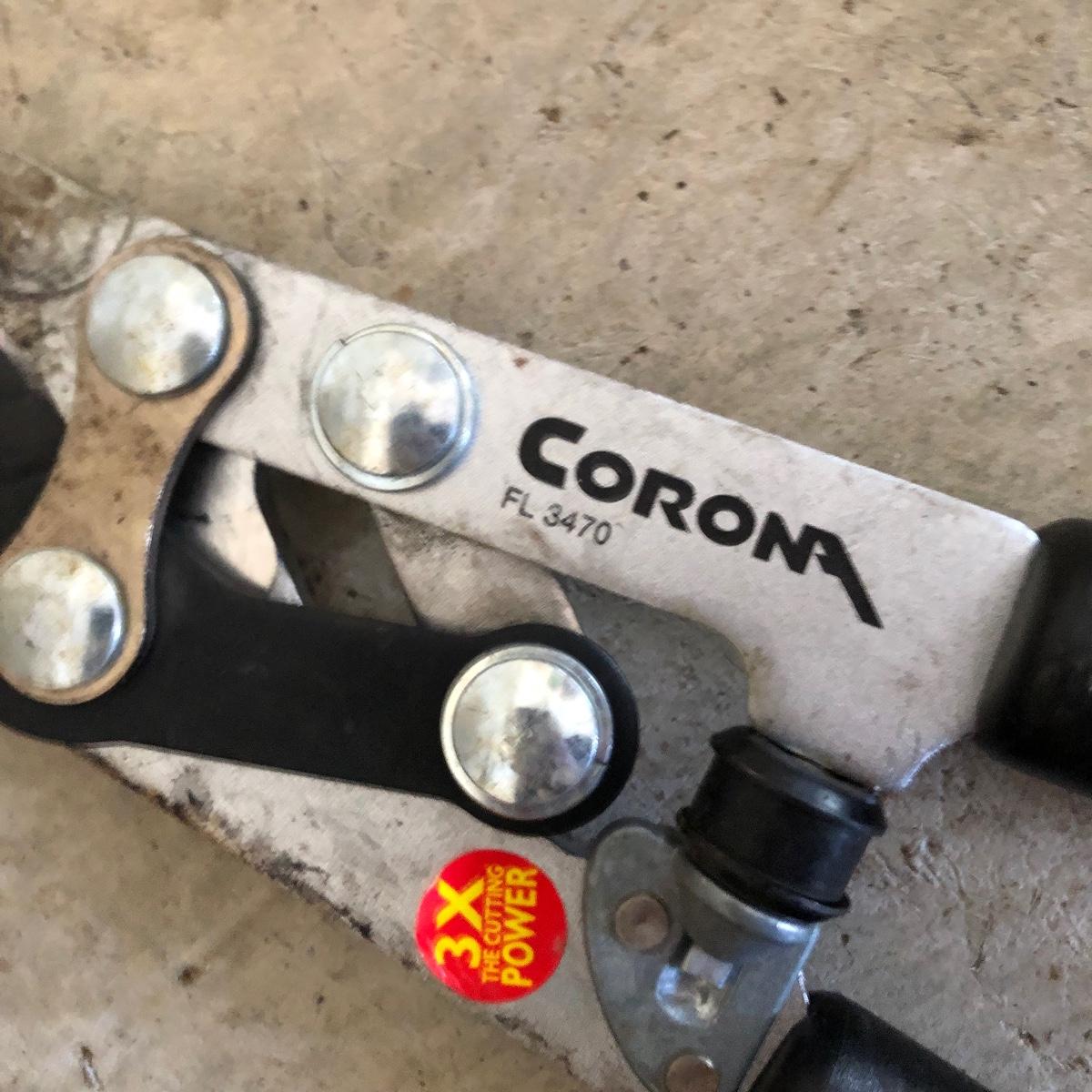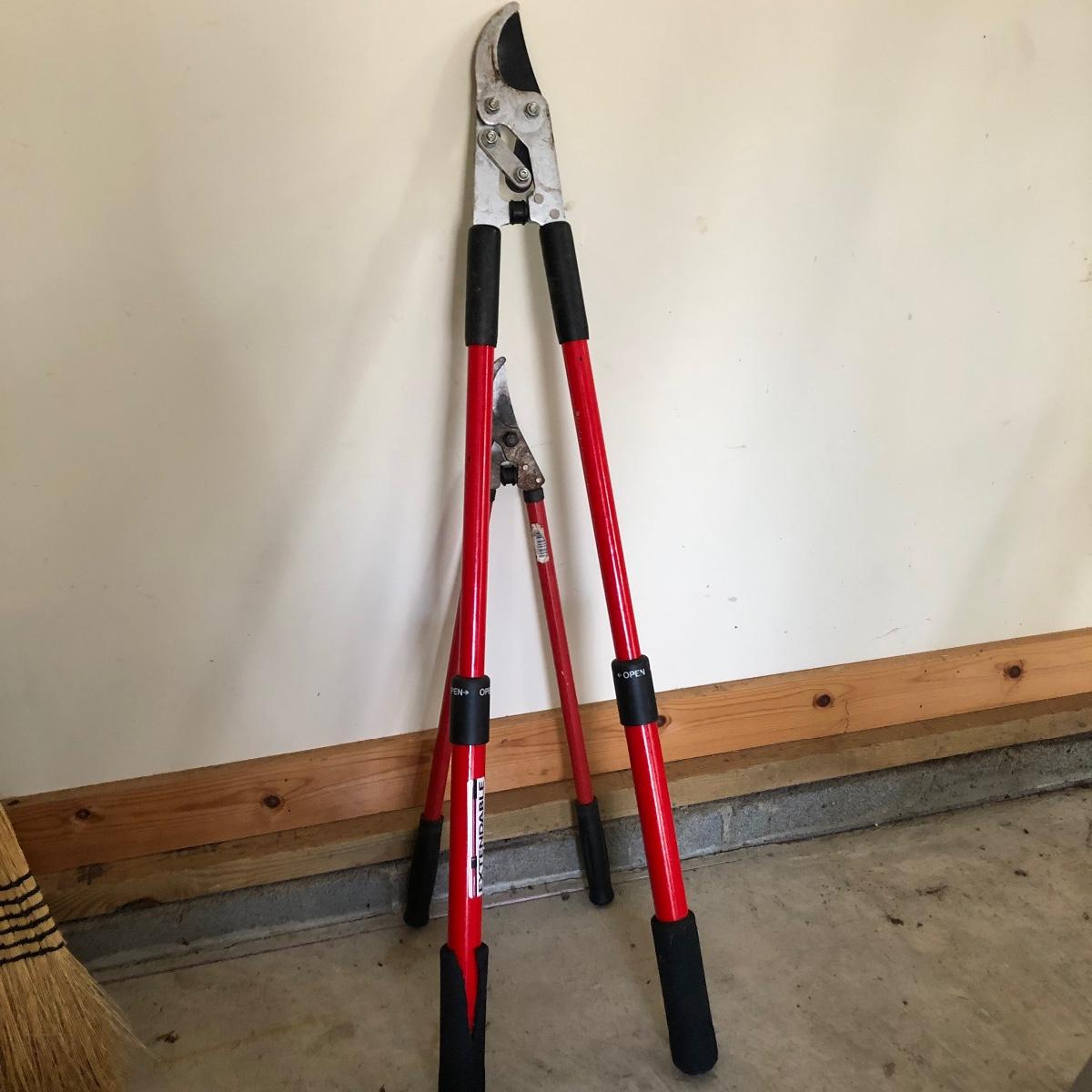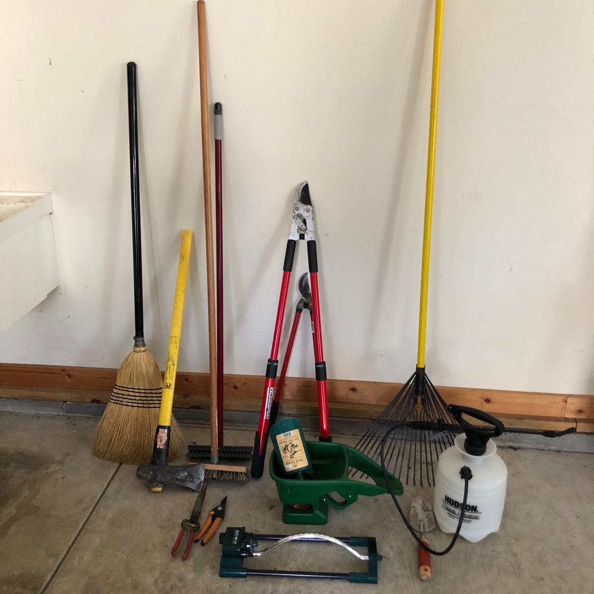 Lot includes two pairs of Corona Loppers, ax, plastic sprinkler, gallon sprayer, two deck scrub brushes with handles, broom and metal rake.