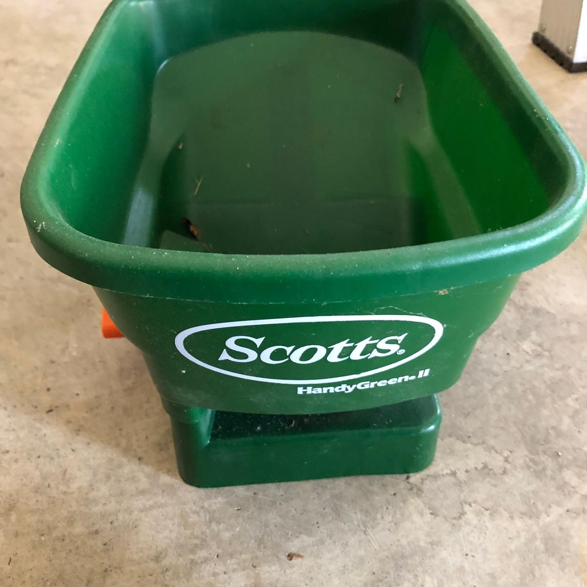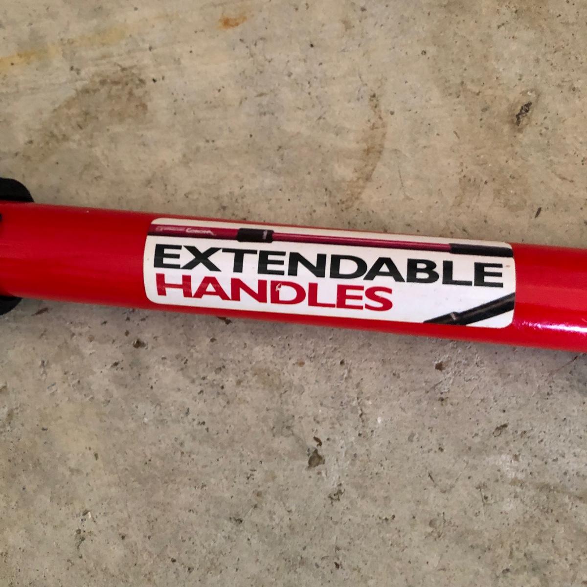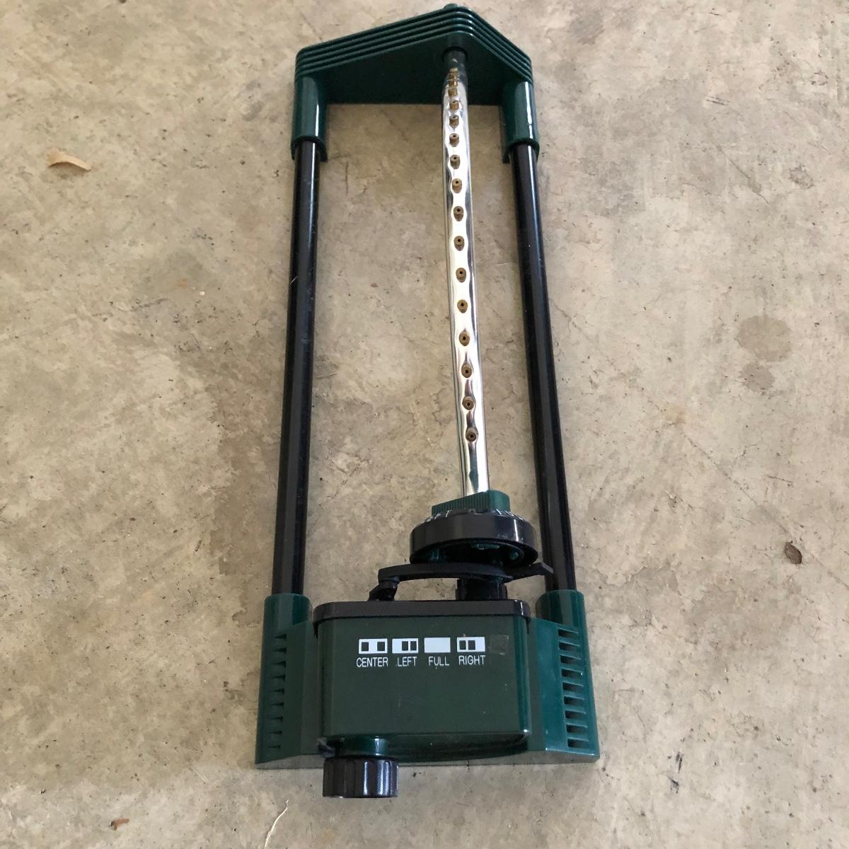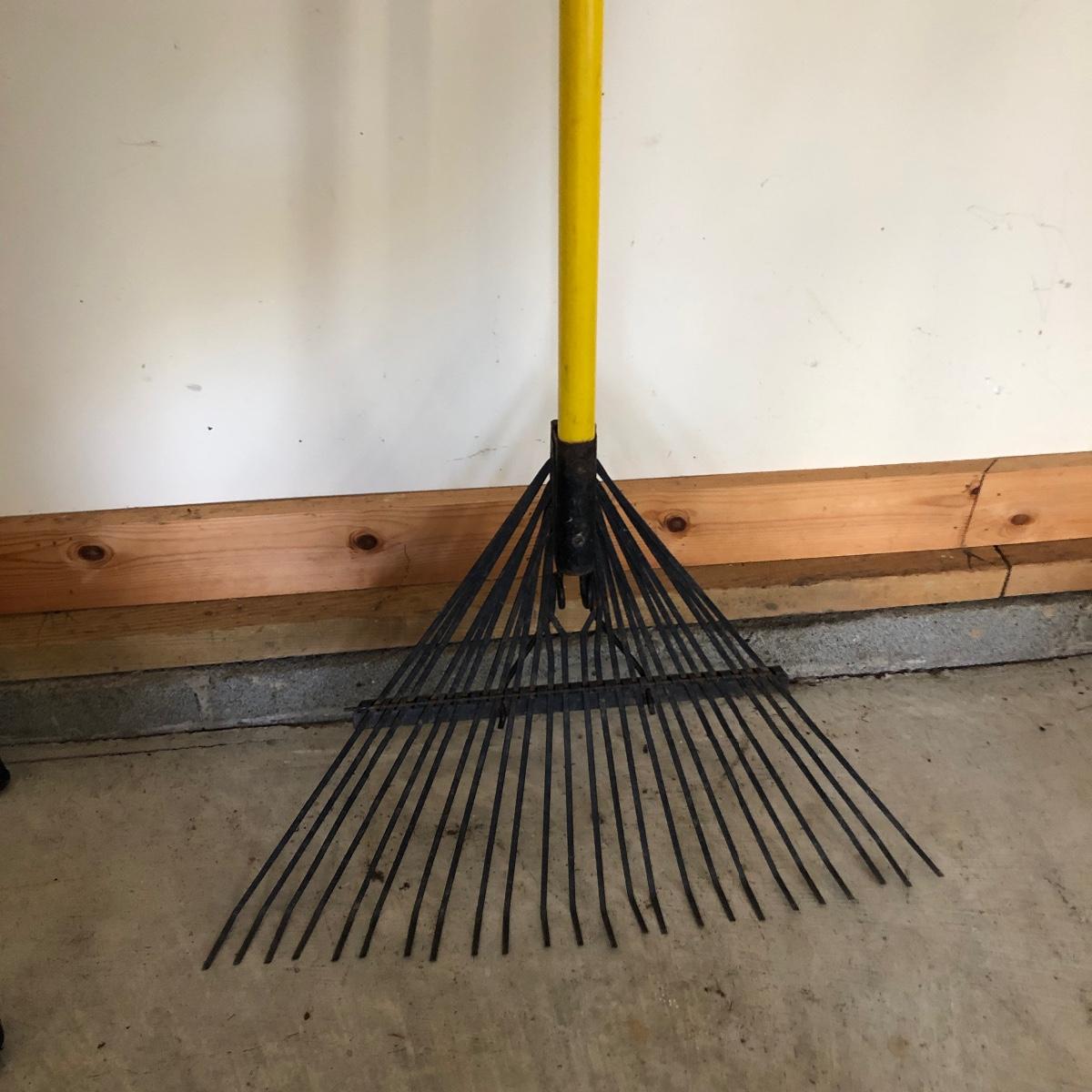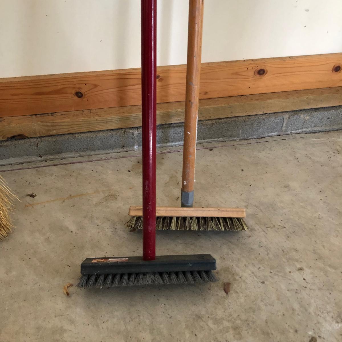 Lot includes two pairs of Corona Loppers, ax, plastic sprinkler, gallon sprayer, two deck scrub brushes with handles, broom and metal rake.