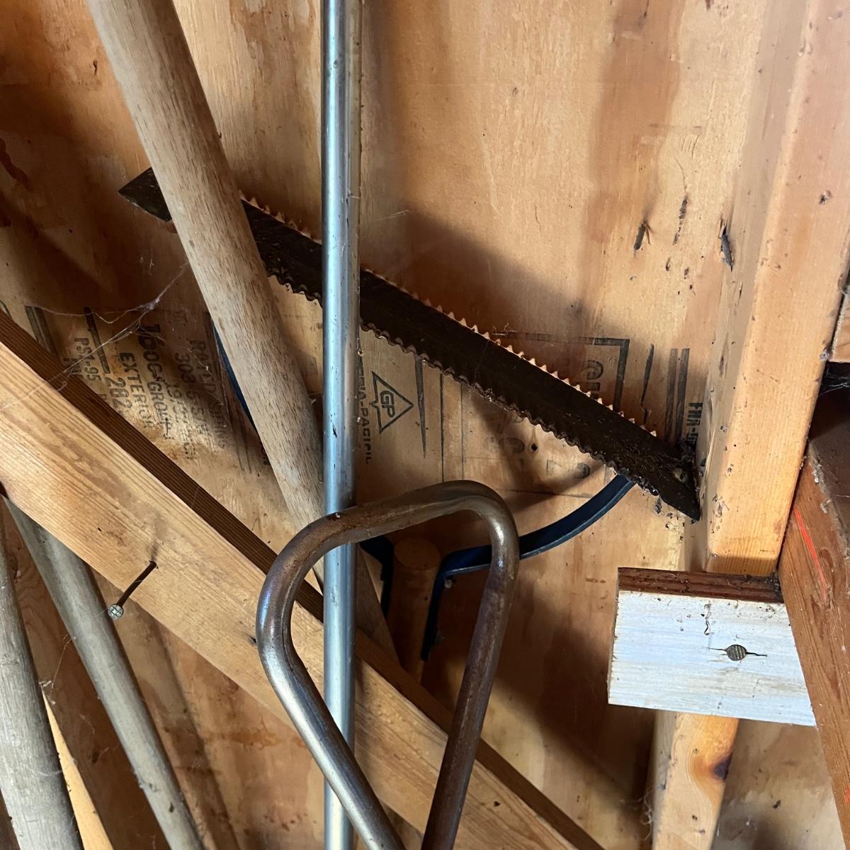 Lot includes fish tape, tarp, shovels, potato fork, rake, broom, pick ax and more.