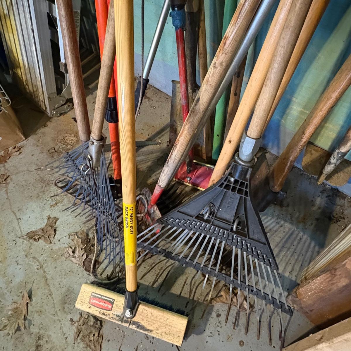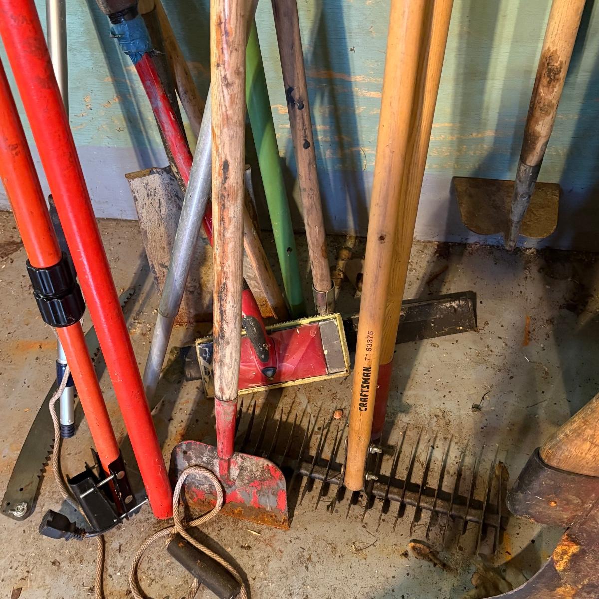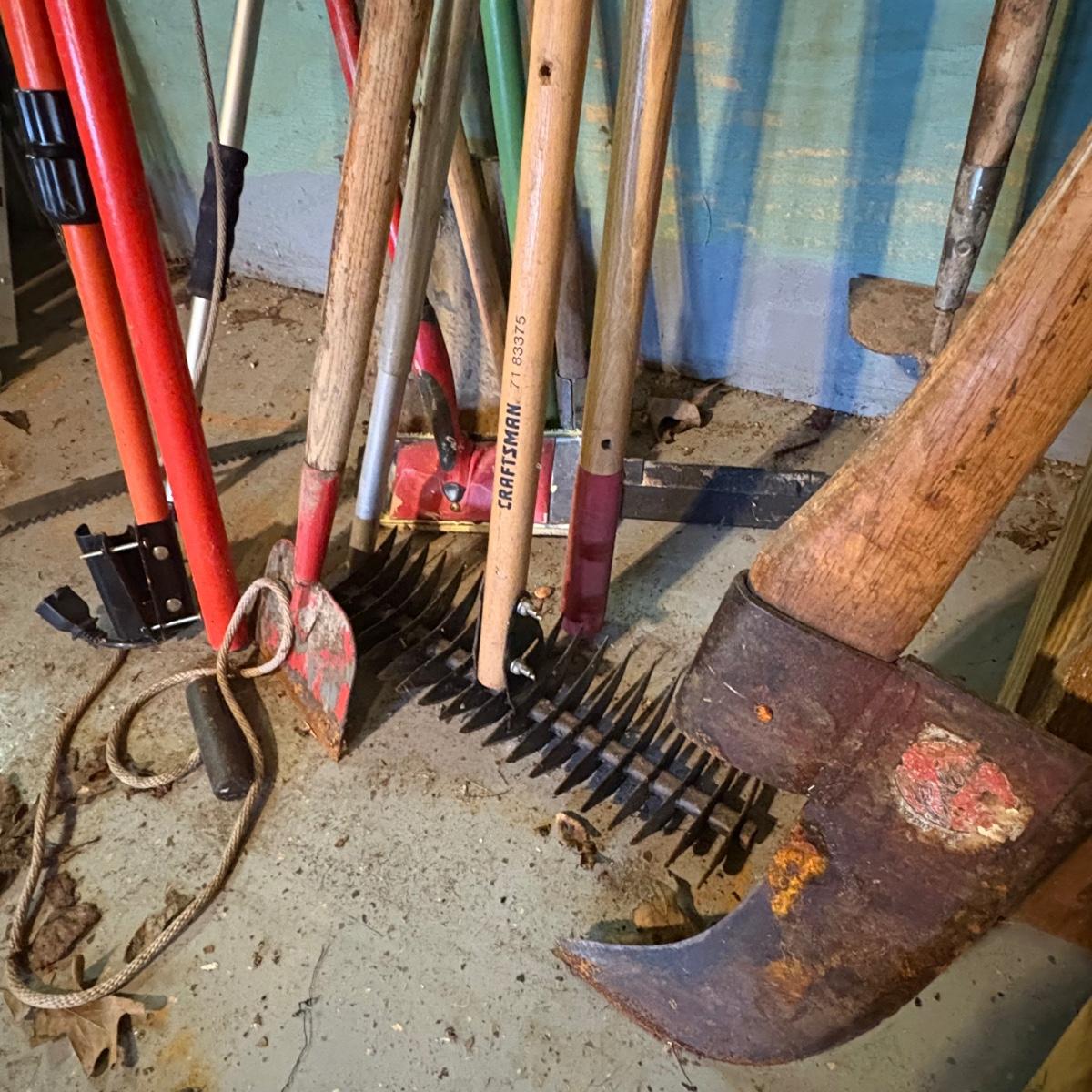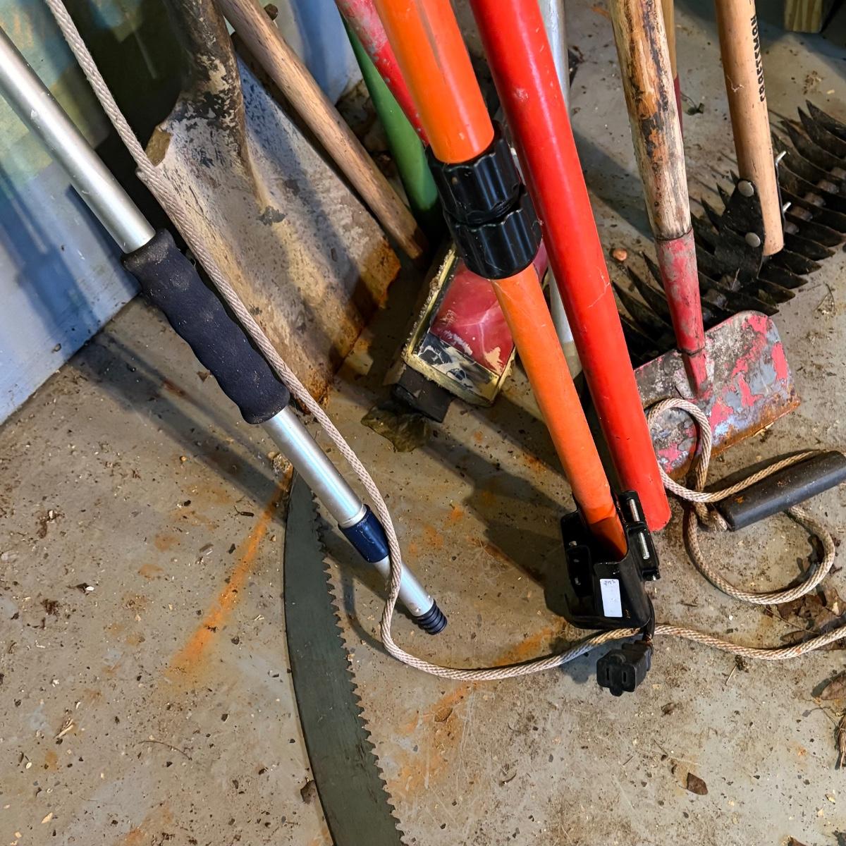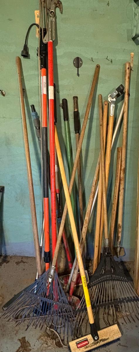 Miscellaneous outdoor/garden tools including rakes, hoes, shovel, push broom, pole saw, brush axe, and more.