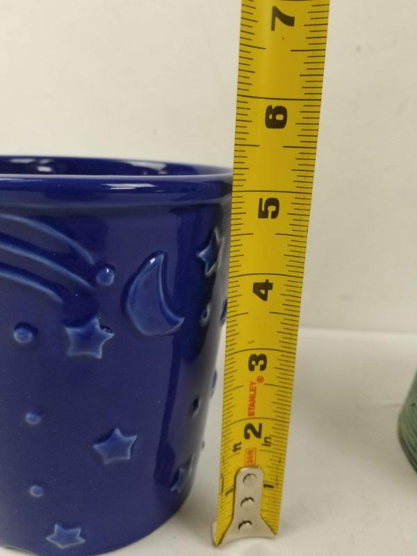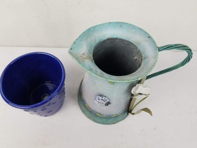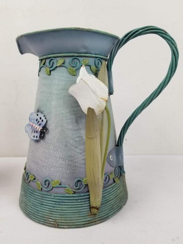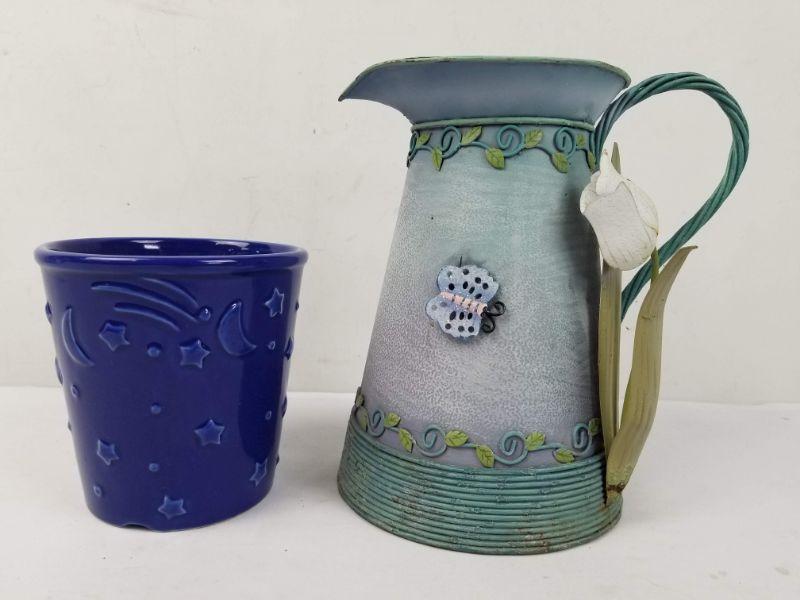 Outdoor/Indoor Decor: Starry Blue Pot, Metal Pitcher with Butterfly & Flower